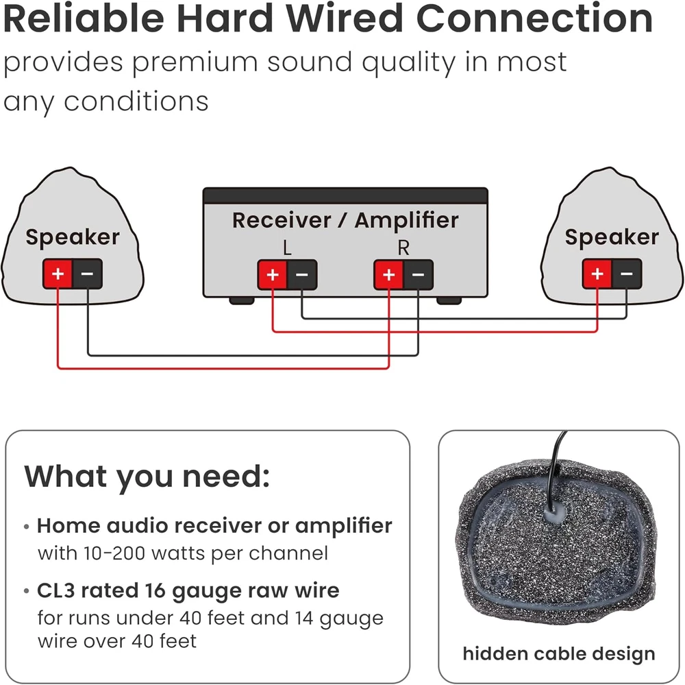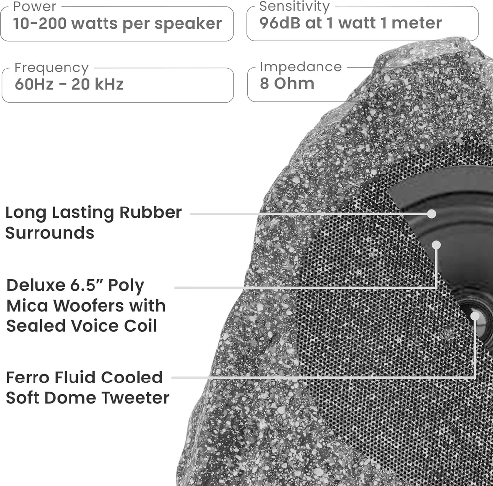 Speaker Maximum Output Power: 400 Global Trade Identification Number: 00813282015309 Subwoofer Connectivity Technology: Wired Special Feature: Durable Compatible Devices: Desktop,Laptop gtin13: 705353149160 Impedance: 8 Ohm Type: Does not apply Size: 6.5 in Product Dimensions: 8"D x 10"W x 9"H Tweeter Diameter: 1 Inches Connectivity Technology: CL3_wire Recommended Uses For Product: Pool,Outdoor Speaker Type: Outdoor Specific Uses For Product: Back yards, Lawns, Patios, Decks, Pool, Spa, Garden, Outdoor offi Number Of Circuits: 1 Mounting Type: Deck,Outside Mount UPC: 705353149160 Control Method: Voice Audio Output Mode: Stereo Power Source: Corded Electric Package Type: Frustration-Free Packaging Unit Count: 1.0 Count Surround Sound Channel Configuration: 2.0 Included Components: speakers Audio Driver Size: 6.5 Inches Audio Driver Type: Dynamic Driver Frequency Response: 20 KHz Item Weight: 4.5 pounds Number of Items: 2 Speaker Size: 6.5 Inches Controller Type: Corded Electric Woofer Diameter: 6.5 Inches Color: Granite Grey Warranty Type: Limited Warranty Brand: Does not apply Model: Does not apply Model Name: Outdoor Granite 6.5" Rock 2 Speaker Set for Deck Pool Spa Yard Ga Item model number: 2R6G Connectivity: Does not apply Includes MP3 player?: No Is Waterproof: TRUE Subwoofer Diameter: 6.5 Inches