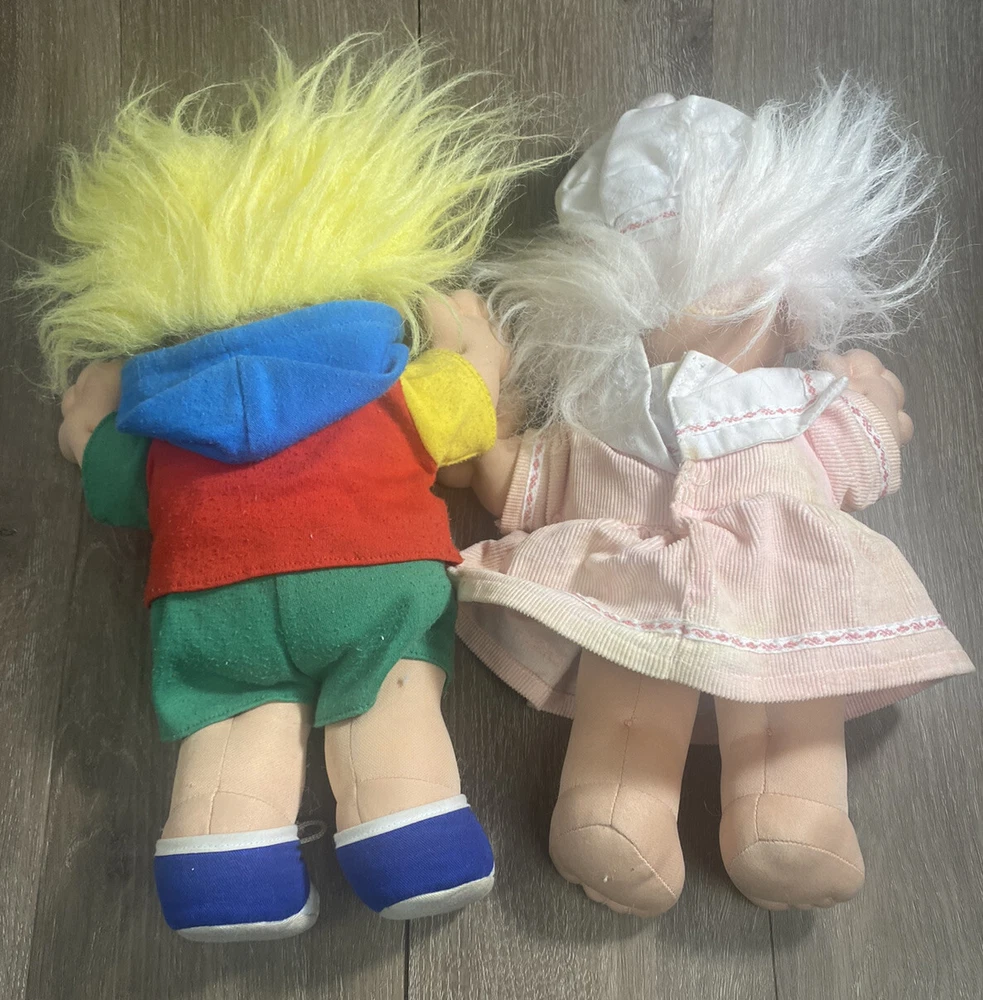 (2)Russ Berrie Troll Kidz 12” Soft Body Troll Doll. Vintage. Used. By our observations, the items are good condition. There is some wear to the dolls. Both of the dolls have some staining to their faces. Both of the dolls have wear and staining at their hairlines. The girl doll has some staining/ discoloration to her dress. The girl doll has wear to the bottom of one of her feet. The boy doll is missing one of the strings to his shirt. His shoes have some staining/ discoloration. There is some wear to the boy doll's clothing. The boy doll has some stains to his legs. See picture gallery for information. Thank you for viewing this listing. We are a thrift shop located in Peachtree City, Georgia and all of our profits are returned to our community. We make every effort to test all electronic equipment that we receive and closely examine everything else which we will describe in detail if needed. If you have any questions, please message us directly and we would be more than happy to answer any of them.