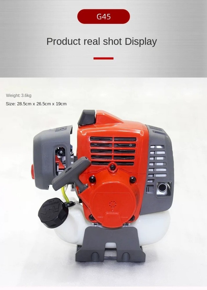 Item specifics Condition New: A brand-new, unused, unopened, undamaged item in its original packaging (where packaging is applicable). Packaging should be the same as what is found in a retail store, unless the item is handmade or was packaged by the manufacturer in non-retail packaging, such as an unprinted box or plastic bag. See the seller's listing for full details. See all condition definitionsopens in a new window or tab Brand Unbranded Type Riding Lawn Mower Power Source Gasoline is_customized Yes Origin Mainland China Certification CE DIY Supplies ELECTRICAL weights 5kg Model Number G45 engine Item description from the seller Item Description Model: G45 Fuel: Gasoline Rotation: Counterclockwise Number of strokes: two strokes Number of cylinders: single cylinder Cooling medium: air cooling Calibration speed: 7500 (rpm) Application: Agricultural Machinery Continuous output power: 1.47 (kw) Maximum power: 1.47 (Kw) Working mode: reciprocating piston internal combustion engine Start mode: manual Fuel tank capacity: 0.94 (L) Specifications: G45 new 541 red, G45 new 541 orange, G45 new 541 blue, G45 new 541 yellow weight:3.6 kg size:30x28x20cm Product Photo Item Description Model: G45 Fuel: Gasoline Rotation: Counterclockwise Number of strokes: two strokes Number of cylinders: single cylinder Cooling medium: air cooling Calibration speed: 7500 (rpm) Application: Agricultural Machinery Continuous output power: 1.47 (kw) Maximum power: 1.47 (Kw) Working mode: reciprocating piston internal combustion engine Start mode: manual Fuel tank capacity: 0.94 (L) Specifications: G45 new 541 red, G45 new 541 orange, G45 new 541 blue, G45 new 541 yellow weight:3.6 kg size:30x28x20cm Product Photo