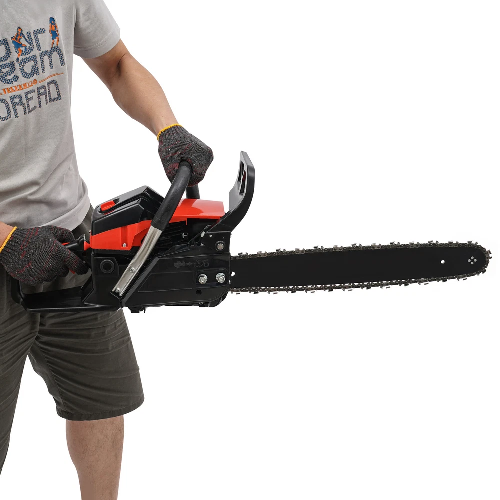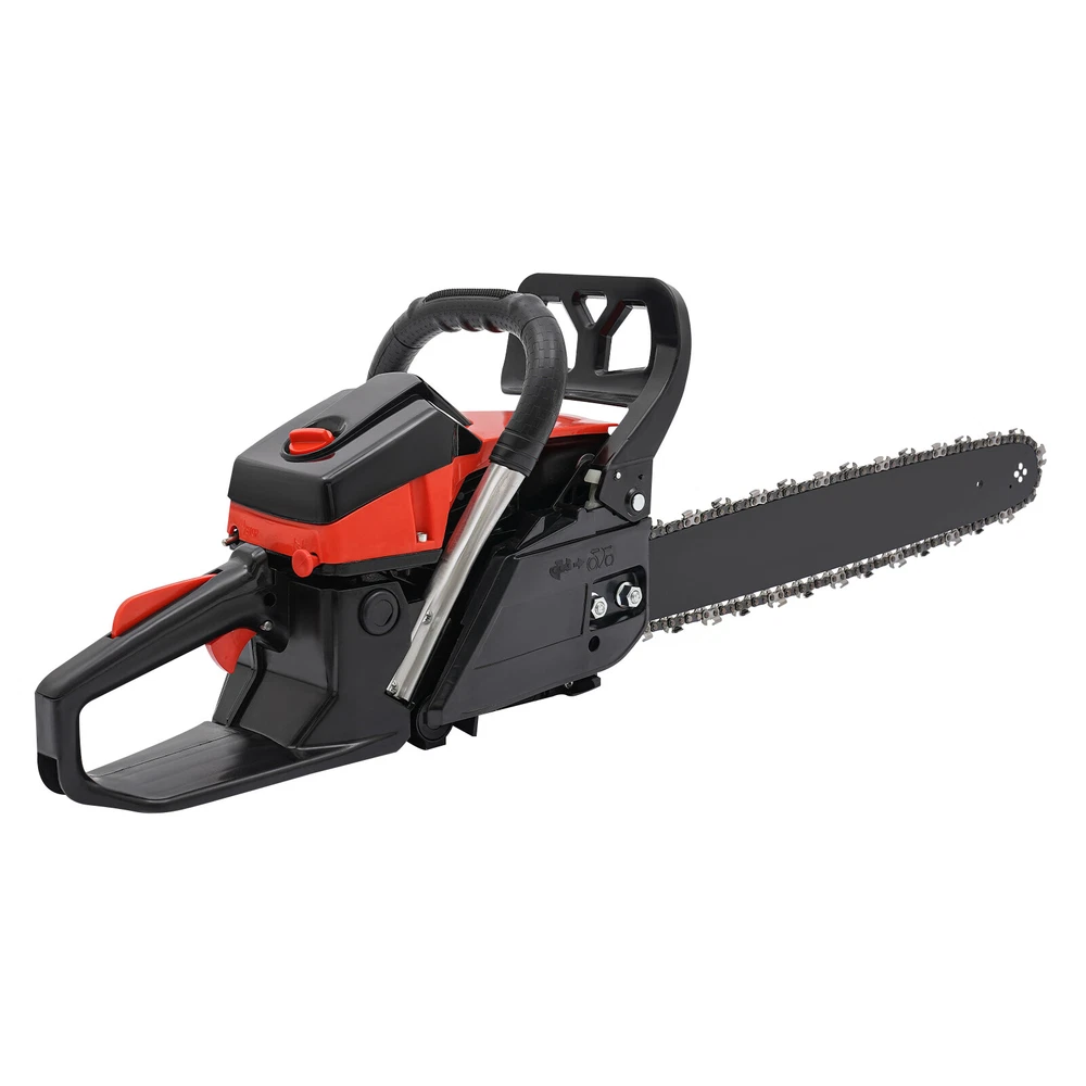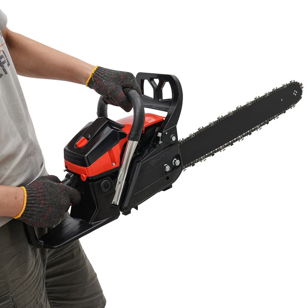 2-Stroke Gas Chainsaw 2.2Kw Handheld Petrol Chain Saw 58cc Gasoline Chainsaw Description This gasoline chainsaw is powered by a high-quality 2-stroke engine with 58cc displacement, featuring high efficiency, high power, reliable operation and long service life, which is ideal for cutting wood with less effort. The lightweight design makes it easier to operate, ergonomic handle ensures a comfortable user experience. With it, your work becomes easier and easier. Key Features High-quality Materials: This gasoline chain saw is made of high-quality plastic, nylon, and 65 Mn steel, which is sturdy and durable, wear-resistant, not easy to deform, and has a long service life. High Efficiency: This product has a 2-stroke air-cooled engine, 58cc displacement, 2800-11000rpm high speed, 2.2Kw high power, and 24.8-inch hardened chain and 18-inch one-piece molded guide, which can achieve chain speeds of 12.5 ft/ s, allowing you to cut through trees quickly and more easily. Cost-saving: This product adopts a diaphragm carburetor and automatic filtration systems, which not only prevent dust and debris from entering the engine, thus reducing fuel consumption, but also burn the gasoline fully and improve the fuel utilization rate. In addition, the advanced automatic lubrication system minimizes friction between the guide bar and the chain, prolonging the life of the chain and ensuring a seamless cutting experience. High Safety: It has a dual protection switch that needs to be pressed at the same time to activate, which prevents the machine from starting accidentally for added safety in use. Moreover, the thicker and wider baffle allows for emergency braking and prevents wood chips from splashing, or accidentally touching the chain, increasing safety in use. Portable and Ergonomic: The ergonomic front handle and starter handle, and anti-vibration system provide you with maximum comfort, allowing you to start the product quickly and ensuring comfortable control during long periods of use. Good Heat Dissipation: Dense cooling holes and three-hole exhaust vent ensure good heat dissipation, which effectively prevents the body temperature and the internal oil temperature from getting too high, ensures that the machine won't go out even after a long period, and also prolongs the service life of the machine. Thoughtful Design: The muffler, vibration-absorbing design and engine pressure reducing valve can effectively reduce noise and vibration, providing you with a comfortable user experience. Easy to Install: The simple structure, complete accessories, and an English manual allow you to install this product in minutes, saving you time and labor. Protective Package: To prevent the product from being damaged and bumped during transportation, we packed it with foam to protect your products to the maximum extent possible. Customer Service: We aim to provide quality products and services. If you have problems, please feel free to contact us. We will reply and solve the problem for you as soon as possible. Details Fuel Tank: With its 18.93 Oz fuel tank, it saves time and effort without frequent refueling for long-term use. Guide Bar Cover: It is easy to store and better protect the guide bar when not in use. Application It is suitable for garden pruning, forest logging, firewood cutting, bamboo harvesting, wood cutting, tree pruning, shrub pruning, and so on. It is suitable for homes, gardens, parks, forests, pastures, farms, orchards, and other places. Specification Color: Black+Red Style: Modern Material: Plastic, Nylon, 65 Mn Steel Process: Quenching, Integrated Molding Assembly Required: Yes Engine Type: Single Cylinder, Air-cooled, 2-Stroke Ignition System: CDI, Self-reset Manual Start Fuel Tank Capacity: 560ml/18.93Oz Chain Tank Capacity: 260ml/8.79 Oz Power: 2.2Kw Speed: 2800-11000rpm Displacement: 58cc Applicable Gasoline Type: Above 90# Oil Mixture: 25:1(Gasoline: Oil) Chain Length: About 63cm/24.80 in Chain Pitch: 8.25mm/ 0.32in Guide Length: 48cm/ 18 in Product Size: 89*20*26cm/35.04*7.87*10.23in Package Size: 50*27*30cm/19.68*10.63*11.81 in Gross Weight: 7.25kg/15.98 lbs Net Weight: 6.85kg/15.1 lbs Package Included 1* Gas Chainsaw 1* Guide Bar Cover 1 Pair* Gloves 1* English Manual 1* Funnel 1* Fuel Oil Mixing Bottle 1*Brake Baffle Other Accessories for Assembly Notes Please use gasoline >90# with special 2-stroke engine oil and never use pure gasoline. Gasoline and oil mixture ratio: 25:1. Please read the instructions carefully before use and take note of the safety precautions contained therein. Please fill the chain lubricating oil tank with chain oil (not included) before using the chainsaw. Then, run the chain for a few seconds without cutting to help lubricate it better. When the chainsaw is not in use, it is better to pack it in plastic bags to avoid dust and water entering the machine and affecting its use. If the chainsaw is not used for a long time, the fuel oil in the tank must be cleaned. Please allow the slight color difference caused by the shooting light and 1-3cm error due to manual measurement, and make sure you do not mind before ordering.