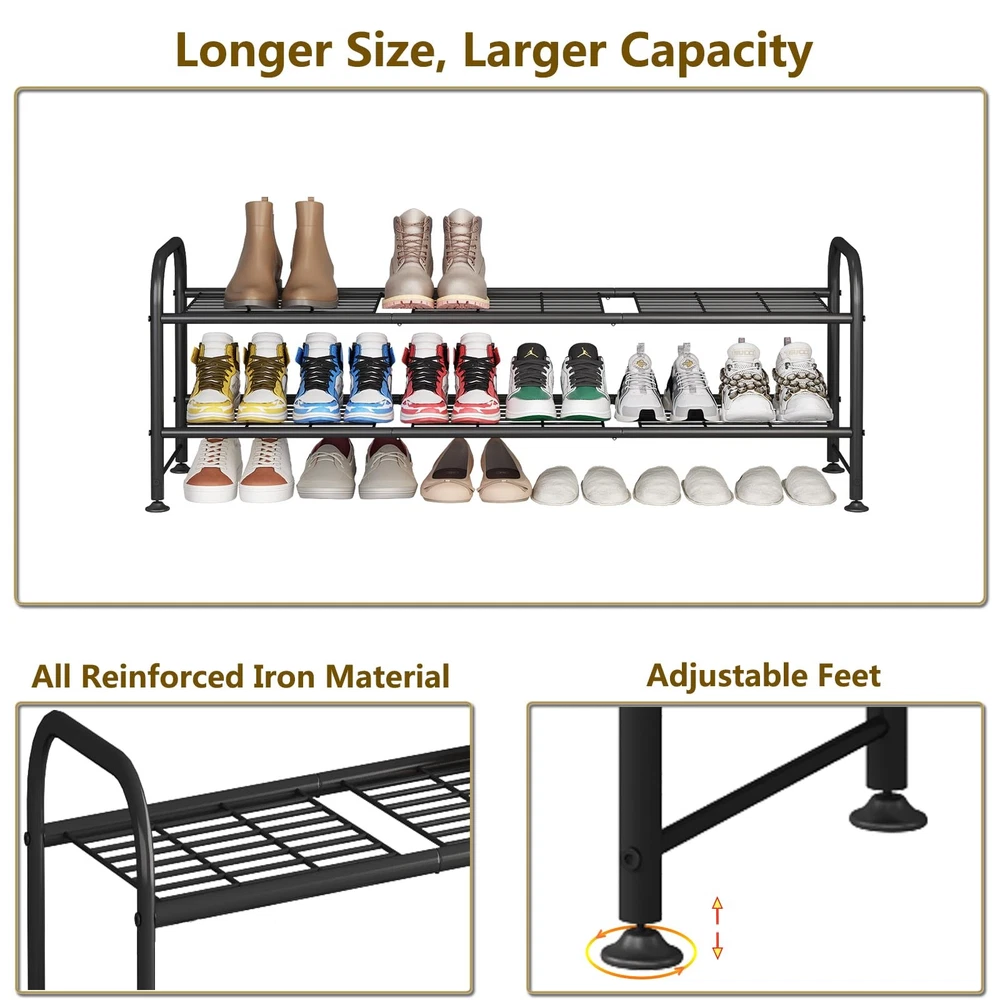 【Large Capacity】This 2-tier long shoe rack can easily stores up to 15-18 pairs of shoes for women, men, and children, such as slippers, sandals, high heels, sneakers, boots, etc. The raised bottom creates extra storage space for more shoes, ideal as a shoe rack for closet. 【Multipurpose Shoe Rack】This is a great storage rack for shoes as well as other living items, keep your entryway, closet, dorm room, garage, bedroom, living room, mud room tidy. 【High Quality】The entire shoe rack is made of iron with anti-rust spray paint on the surface, which is durable, has stronger load-bearing capacity, and can be used for many years. 【Easy to Assemble】Simple parts allow you to easily assemble the shoe rack in minutes. The bottom 4 adjustable feet can be applied to uneven ground. 【SHOPPING 】we provide a free 12-month customer return and exchange service. If you encounter missing parts or have assembly questions, please feel free to us through the Buyer Message.