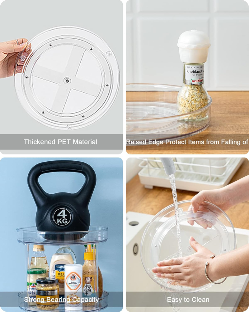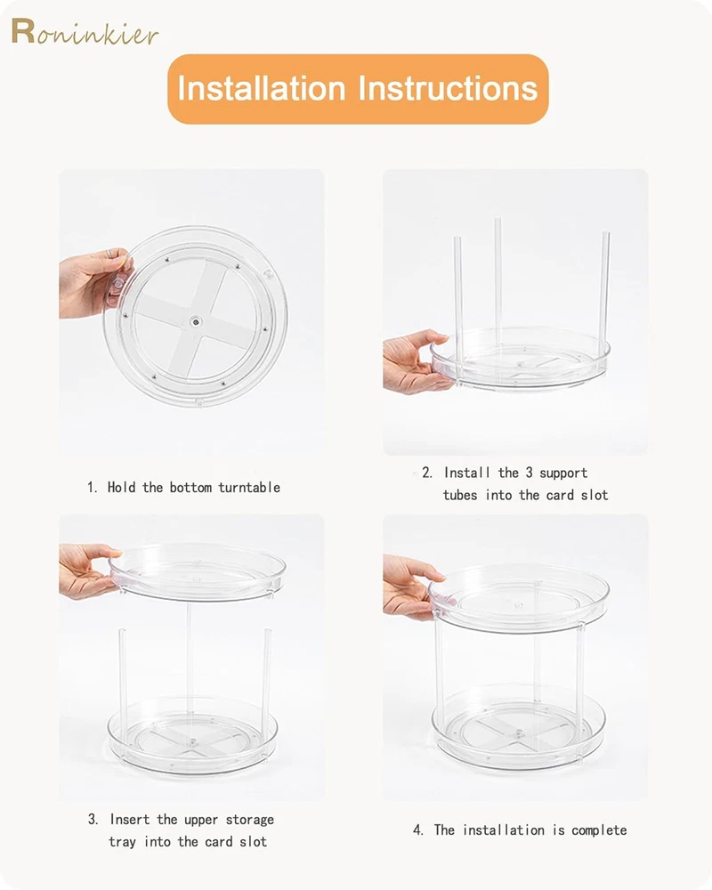 Store New Arrivals Add to Favorite View Feedback Contact Roninkier 2-Tier Clear Lazy-Susan Turntable – 11-Inch Pantry Spice-Rack Cabinet-Organizer – Plastic Lazy Susan Makeup Organizer for Bathroom Countertop Description Item model number YM-6417 Manufacturer YiMiJia Material Plastic Color Clear Brand Roninkier Item Diameter 11 Inches Country of Origin China Maximum Weight Recommendation 25 Pounds Item Weight 0.76 Kilograms Batteries required No Import Imported Number of pieces 2 Size 11 Inch 2 Tier The 2 tier design maximizes your space. Say goodbye to messy kitchens and cabinets, make better use of every space in your home. The clear PET material makes the items more visible, the raised edge keeps the items from falling off. Using high-quality stainless steel bearings, glides more smoothly, rotate 360 degrees as you wish. Easy to install and disassemble. It can be used as a whole (a 2 Tier Lazy Susan) or seprately ( a 11 Inch turntable and a non-rotating storage tray). All Roninkier staff are ready to serve you at any time. You can return or exchange the goods without any reason within 30 days until you are satisfied. Product Description Roninkier, challenger and reformer of traditional storage. Dear friends, one day apart seems like three years. Roninkier is back, together with our new product. Since Roninkier 9 inch clear Lazy Susan went on the market, we have received unanimous praise from customers. Also some customers told us that although the 9-inch clear Lazy Susan is suitable for their pantry and cabinets. But the storage space has become smaller. So we brought Roninkier 2-Tier 9 inch clear Lazy Susan . The main body of this new product is made of thick PET, the rolling bearing is still made of high-quality stainless steel and the transparent washer supporting the rolling bearing is made of PE. Using high-quality stainless steel bearings, glides more smoothly, rotate 360 degrees as you wish. And The 2 tier design maximizes your space. Your cabinets and kitchens are clean and tidy from now on. Are you tired of messy cabinets and kitchens? Have you ever accidentally knocked over other bottles while taking one of your condiments? Say goodbye to messy kitchens and cabinets, make better use of every space in your home! Easy to install and disassemble. It can be used as a whole (A 2-Tier Lazy Susan) or seprately ( A Rotatable Lazy Susan and A Non-rotatable Storage Tray). Roninkier Clear Lazy Susan can be: Rota ting Spice Rack, Turntable for Refrigerator, Cabinet Organizer, Cosmetic or Makeup Collection Food Storage. ORGANIZE EVERY SPACE Perfect for organizing your kitchen, refrigerator, craft, hobby room, pantry or even your bathroom cabinets. ABOUT US We offer the best prices around on high quality products. Our E-store includes media such as books, movies, music and games while offering electronics, toys, sporting apparel, clothing, tools, general home, garden items and more. SHIPPING We are always working hard to ensure your package arrives as soon as possible. Please understand that some factors like weather, high postal traffic, and the performance of shipping companies are outside of our control. We offer free shipping to the lower 48 states and ship within 2 business days of payment, usually sooner. We do not accept P.O. Boxes. Please provide a physical address. RETURNS We offer a 30-Day Return Policy on items which you are not completely satisfied with. You have the option for a full-refund or an exchange of the item. No returns are available on items shipped outside of the USA. PAYMENT We accept PayPal. CONTACT US This page content is yet to come Please ad us to your favorite seller and visit again later Thank You CUSTOMER SATISFACTION We try our very best to make sure every customer is completely satisfied. If there's a problem, message us! We're happy to help.