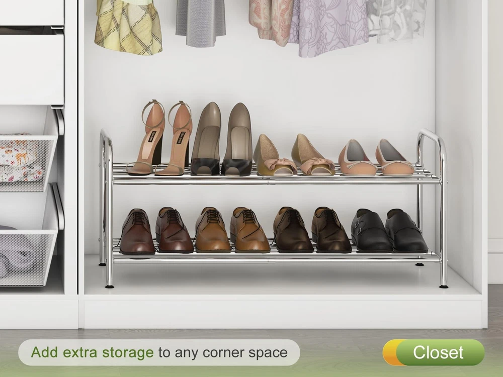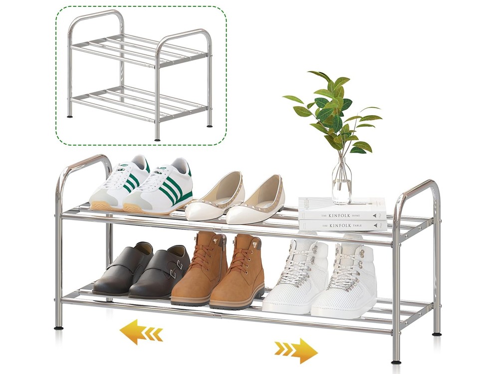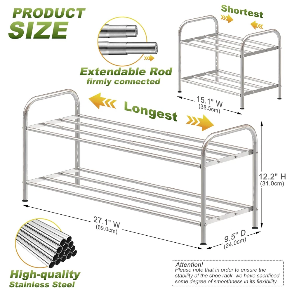 【Expandable Shoe Rack】stainless steel shoe rack adopts a expandable design to meet the requirements of different widths and increase storage space. 【Stretching Free Space】The shelf layer is composed of 4 stretching rods, so that it can store various items, and say goodbye to clutter. 【Sturdy Shoe Rack】Because all the poles are stretchable, it feels difficult to stretch the shoe rack. Don't worry, because we have prioritized the sturdiness of the shoe rack. 【Stainless Steel Material】Made of stainless steel, don't worry about rust, the shoe rack is more durable. Longest dimension: 27.1"W x 9.45"D x 12.6"H, shortest dimension: 15.1"W x 9.45"D x 12.6"H, weight: 4.08lbs/1.85kg. Note: Please use it in indoor spaces!