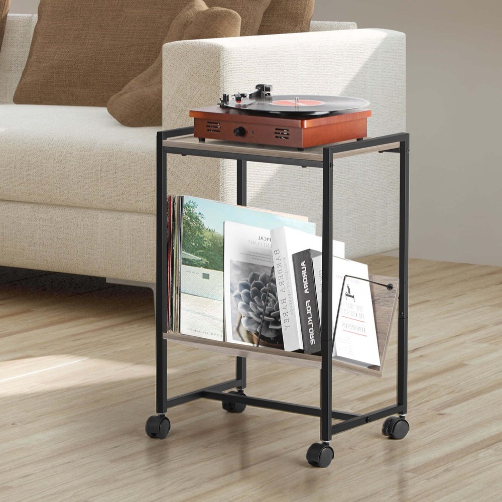 This record player stand with storage can protect your precious records and albums. The 4 rolling wheels make the record player stand very convenient to push or lift the table up to move. The fine rods on the side prevent the vinyl's from falling accidentally. The V-shaped bottom rack allows for easy access to the vinyl's. The record player table is matched within 12-inch vinyl's, which can accommodate around 70-90 albums. The end table is made of high quality gray MDF shelves with a durable metal frame making the stand sturdy. [Small Record Player Table] This grey vinyl record player stand only takes up a small space, but the top layer can enlarge most sizes of turntables. The 2 V-shaped independent areas of this record cabinet are designed to help you organize all vinyl records, albums, magazines, books and CDs. You can dismantle the metal wire in the middle compartment and store items as you like, allowing for orderly storage of both large and small items. [Multiple Storage Options] The simple gray vinyl record storage can perfectly fit your modern room and various decorative styles. The wheels at the bottom help you easily move and can be used as a record storage, end table, sofa table, bedside table, making this amazing cube recorder table a part of your home and enjoying happy time with your family in your leisure time. [Convenient and Practical] Our vinyl album stand with wheels offers 2 options, one with wheels and the other with foot pads, to maximize your satisfaction. The bottom wheels can easily help you move, and you can take it to your garden, balcony, swimming pool, or any place you like to enjoy music., And 2 of the wheels can be locked without worrying about sliding. And when you don't need the wheels, you can replace them with foot mats, which is undoubtedly a great choice. [Stable and Stylish] Made of high-quality particle board and metal frame, this vinyl player record holder is sturdy and durable enough. The horizontal bars at the bottom support the entire holder effectively, enhancing its service life. It is also equipped with 4-foot pads that can adjust the height to enhance stability on uneven roads. The unique gray wood pattern incorporates a fashionable modern style, simple and elegant, enhancing your overall decoration level.