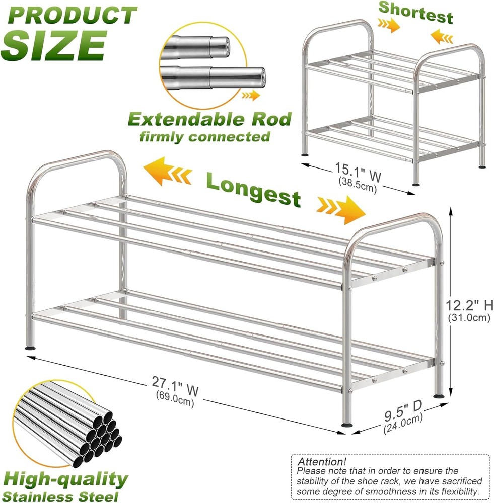 2-Tier Low Shoe Rack, 100% Stainless Steel, Small D: 2-tier, Silver Product Details Room Type: Bathroom, Closet, Laundry Room Number of Shelves: 2 Special Feature: Expandable, Rust Proof, Stackable Product Dimensions: 9.45"D x 27.1"W x 12.6"H Style: Modern Finish Type: Brushed Brand: SKIKEN Product Care Instructions: Wipe with Dry Cloth Assembly Required: Yes Recommended Uses For Product: Shoes Number of Items: 1 Manufacturer: SKIKEN Included Components: Rod Model Name: 2TierShoeRack Item Weight: 2.5 Pounds Furniture Finish: Stainless Steel Installation Type: Freestanding Specific Uses For Product: Shoes Unit Count: 1.0 Count Product Name: Shoe Rack Item Weight: 2.5 pounds Item model number: SKShoeRack MaterialMounting Type: MetalDIY Shelf TypeShape: MetalRectangular 【Expandable Shoe Rack】SKIKEN stainless steel shoe rack adopts a expandable design to meet the requirements of different widths and increase storage space. 【Stretching Free Space】The shelf layer is composed of 4 stretching rods, so that it can store various items, and say goodbye to clutter. 【Sturdy Shoe Rack】Because all the poles are stretchable, it feels difficult to stretch the shoe rack. Don't worry, because we have prioritized the sturdiness of the shoe rack. 【Stainless Steel Material】Made of stainless steel, don't worry about rust, the shoe rack is more durable. Longest dimension: 27.1"W x 9.45"D x 12.6"H, shortest dimension: 15.1"W x 9.45"D x 12.6"H, weight: 4.08lbs/1.85kg. Note: Please use it in indoor spaces!
