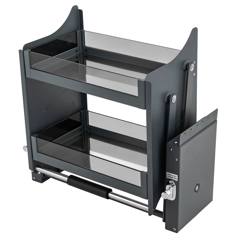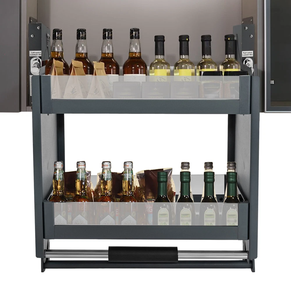 Pull-Out Cabinet Shelf Drop Down Shelf Pull-Down Lift for Kitchen Cabinet 2-tier Description Installing a 2-tier pull-down shelf in your cabinet can effectively make full use of your upper cabinets and keep your kitchen tidy, bringing a comfortable cooking environment to you. Our shelf, adopting an advanced pneumatic damper system with a sturdy structure, is a space saver, stylish decor, and a good helper that helps you to get items to higher places with less effort. Key Features Build to Last: This pull-down cabinet shelf mainly adopts tempered glass and aluminum alloy with cutting and nano-coating processes, making it anti-rust , crush-resistant , and high-strength. Smooth Pulling: Advanced pneumatic damper system with strong tension spring ensures easy pull-down and stable push-back even for teenagers and elderly people. You can press the adjusting button inwards and lock/unlock it clockwise/counterclockwise to strengthen/reset the pull-down resistance , thus balancing resistance to prevent falling too fast. Adjustable Bearing: The three-gear assistance adjustment(2.2-11.02 lbs, 11.02-15.4 lbs,13.22-26.4 lbs) through the adjusting button on the right and left sides can meet your different storage needs. Considerate Design: The 1.96" thick wall brackets are thick enough to elude face-frame stile and most types of hinges. Its pull-down design also makes this shelf support suspended installation, sliding doors, upward sliding doors, and double doors. Space-saving: The 2-tier design with each layer 22.2*10.63 inches in size is conducive to making full use of your upper cabinets, offering more space for your kitchen, and avoiding space waste. Sturdy Construction : The 2.16" thickened double-lever levers, 1.96" thick wall brackets, 0.23" thick layer plates, and plastic sprayed steel side plates, along with firm fixing with screws, ensure sturdy construction and strong load-bearing capacity. Stylish Appearance: The rectangular shelf with a curved streamline design and versatile black color, along with the strip pattern that increases its texture, gives this shelf a stylish and modern appearance that fits any room decor. Ready to Use&Install : With the simple structure and an English manual, you can install and use this pull-down cabinet shelf directly without tedious assembly, saving you labor and time. Easy to Clean: Because of the smooth surface with nano-coating treatment, you can wipe the dirt from this shelf with a wet cloth. Protective Package: To prevent the product from being damaged and bumped during transportation, we packed it with foam to protect your products to the maximum extent possible. Buy with Confidence: We have been working hard to provide better service and quality for our customers, which is our goal. If there is any problem with our products, please contact us in time. Details Non-slip Handle: The humanized handle with a silicone wrap gives you a comfortable grip and ensures easy pull-down of this shelf without slipping. Heightened Guardrail: The heightened visual guardrail(3.15") allows for a clear view of the items, makes it convenient to access, and prevents the items from falling off. Round Edge: The burr-free and round edge adds beauty to this shelf and prevents items/your hands from scratching. Application It can be used as a dish rack, spice rack, and food storage rack in kitchen/bar/cafe cabinets, pantries, closets, and other upper cabinets to store snacks, bowls, plates, spices, spice bottles, and other kitchen items. It is made for a cabinet of inner width≥23.6''. The size of the fully installed system is 23.6''W x 10.6'' D x 22.04''H. And the load-bearing capacity of the cabinet should be more than 44 lbs. Specifications Model: 600Frame Color: Black Style: Modern, Pull-out Shape: Rectangular Room Type: Kitchen Shelf Type: Sliding Shelf Age Range: Adult Mounting Type: Wall Mount Material: Tempered Glass, Aluminum Alloy, Steel Process: Cutting, Nano Coating, Plastic Spraying Special Feature: Damping Hydraulic Rod Applicable Cabinet: Width: 60cm/24inch; Depth: ≥27cm/10.6inch; Height: ≥56cm/22.04inch; Load-bearing Capacity : ≥20kg/44 lbs Three-gear Adjustment: 1-5kg/2.2-11.02 lbs, 5-7kg/11.02-15.4 lbs, 6-12kg/13.22-26.4 lbs Max. Load-bearing Capacity: 12kg/26.4 lbs Right Switch Loaded: 3-5kg/ 6.6-11.02 lbs Left Switch Loaded: 1-3kg/2.2-6.6 lbs Minimum Distance from Cabinet : 5.5cm/2.16inch Double-lever Lever Thickness: 5.5cm/2.16inch Layer Plate Thickness: 6mm/0.23inch Side Plate Thickness: About 1.3mm/0.05inch Guardrail Height: 8cm/3.15inch Wall Bracket Thickness: 5cm/1.96inch Wall Bracket Size(W*H): 21*30.5cm/8.27*12inch Interlayer Spacing: 27cm/10.63inch Product Size: 56.4*27*55cm/22.2*10.63*21.65inch Package Size: 57*57*28cm/22.44*22.44*11.02inch Net Weight: 13kg/28.66 lbs Gross Weight: 15kg/33 lbs Package Included 1* Pull-down Cabinet Shelf 1* English Instruction Notes Please make sure that your cabinet size is suitable before purchasing. Please check the parts and read the instruction carefully before mounting. The maximum load-bearing capacity of the basket is 26.4 lbs. Please pull out the buttons when the basket is empty. Pull in the left and pull out the right button when the basket loads 1-5kg/2.2-11.02 lbs. Pull out the left and push in a tight button when the basket loads 5-7kg/11.02-15.4 lbs. Push in the left and right buttons when the basket loads 6-12kg/13.22-26.4 lbs. For the weight of kitchenware, please refer to the bottle or package display. Please do not control buttons when the basket is moving. Please control the buttons after they go back cabinet. Please do not use hard tools to clean the shelf, which may scratch the surface of the product and affect its appearance of it. Please allow the slight color difference caused by the shooting light and 1-3cm error due to manual measurement, and make sure you do not mind before you order. Payment Delivery details Terms of sales About us Contact us Payment We accept ebay payment 。 Fees su