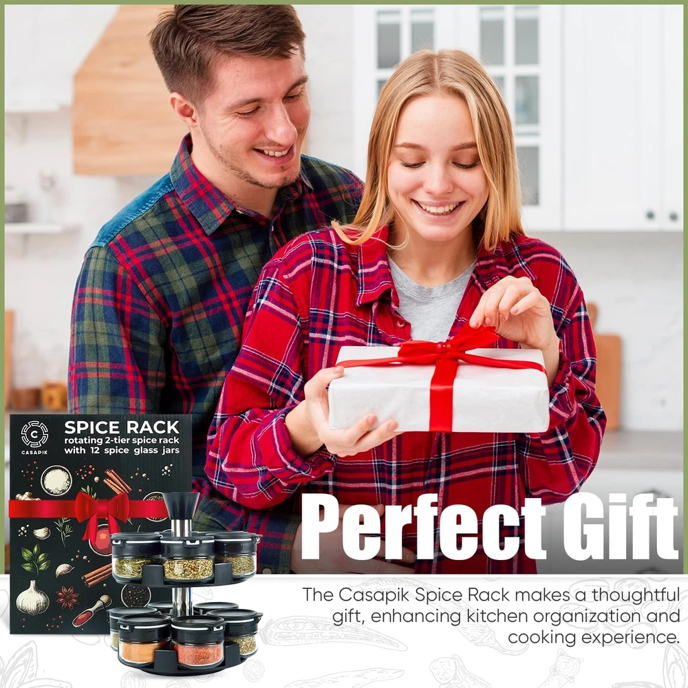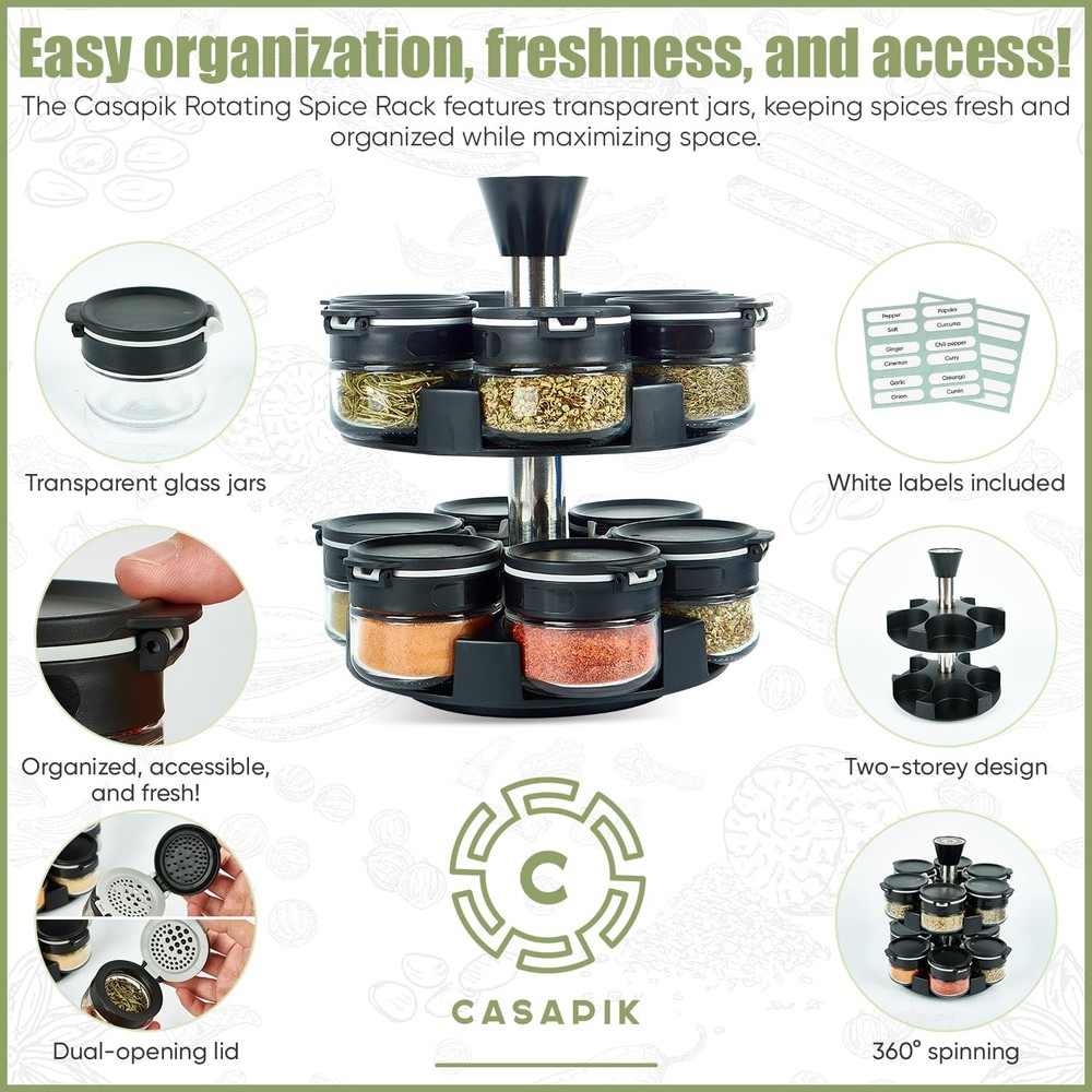 Rotating spice rack ARRANGE YOUR KITCHEN – Organize your spices and keep your kitchen clutter-free. Our 360° spinning spice rack ensures that your most-used seasonings are always within reach and perfectly organized. FLAVOR FRESHNESS – Glass Jars that lock in aroma and taste, never settle for dull flavors! The revolving spice rack comes with 12 glass jars designed to keep your spices fresh, preserving their aroma and taste for flavorful cooking. PRECISION SEASONING – Take control of your seasoning with our dual-lid design, which lets you sprinkle lightly or pour generously with total accuracy. Cook like a pro with ease! CUSTOMIZE YOUR SPICES – Personalize your spice rack with 12 pre-printed labels and 24 blank ones for your special blends. Never mix up your spices again with our clear, easy-to-read glass jars and labels! EFFORTLESS SPINNING ACTION – Say goodbye to kitchen chaos with our spice rack’s smooth 360° rotation. Instantly access your spices without any hassle, perfect for busy cooks who value convenience. PERFECT GIFT – Looking for a stylish, practical gift? This spice rack is a guaranteed hit for housewarmings, birthdays, or any occasion. It will arrive in a specially designed box.