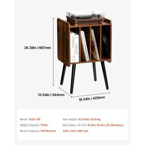 Record Player Stand 2-Tier Wood Vinyl Record Stand up to 100 Albums Brown Artistic Display Space Personalized Organization Attention to Detail Beauty Meets Function Built to Last Versatile Style Weight Capacity: 75 lbs,Record Capacity: 100 Records,Item Model Number: KLEC-05,Product Weight: 18.57 lbs / 8.45 kg,Product Dimensions: 16.54 x 13.54 x 26.38 inches / 420 x 344 x 667 mm *Photo Colors may vary on your device. With any product, the color may appear different based on device, monitor settings, configurations, browsers, the lighting/setting for the photograph, etc. Shades may slightly vary during manufacturing runs/processing. Photos are for informational purposes only and represent a basic design. Dimensions are approximated and may vary during manufacturing runs. Manufacturers may make modifications to the design of an item at any time. About Bargains Delivered Bargains Delivered gives personal attention that only a small business can offer. Wherever you prefer to shop, Bargains Delivered will be there with the widest selection possible for your convenience. See our feedback history with thousands of satisfied customers. We have been serving you since 2005, and we are committed to maintaining your trust! Returns/Refunds Our return policies are simple: brand new items may be returned up to 30 days from receipt. Customer covers shipping (initial and return) and no restocking fee applies if item is brand new. Brand new includes all packaging, tags, etc in perfect condition. Items which are not brand new may be subject to a 50% restocking fee or not accepted at all. All returns require a Return Merchandise Authorization number (RMA #).Please contact us for return RMA and return address. Please note that RMA # does not guarantee final disposition for a return and all returns are inspected before any credit would be given. Customer should use a trackable, insured return service. If item is damaged or lost in transit to us, customer would need to file a claim with their return carrier and we would not be able to process the return. Shipping fees are non-refundable, including expedited shipping, even if item is defective or arrives later than estimated. For any return requests involving variations in the color, shade, approximate dimensions, included accessories, or features listed in the description, normal return policies apply. If parts are missing or damaged, we will send replacement parts if available or it may be processed as a standard return. Shipping We ship fast, usually in 1-2 business days, with delivery expected 2-5 days later. Messages will be sent automatically with shipping updates. All items ship to the address provided in checkout. Please submit an order cancellation request if you need the item shipped to a different address. We may require Signature on any orders. All orders for bikes require Signature. Refusal of delivery, invalid address, unable to sign and receive, and any other reason beyond our cause of error will be treated as standard return, with all shipping and restocking fees deducted. Please inspect your package and merchandise as soon as possible to report any shipping damage or other concerns. Please save all packaging and materials until you are sure there is no damage and you will not be returning the item. If you need to return, we don't provide replacement packaging. For shipping damage, we can usually replace any specific part that is damaged. Let us know which parts need replacement. We do not provide any credits for work done to correct shipping damage (such as at local bike shops) or for the inconvenience of parts arriving damaged. We will work with you to correct any problems. Payment/Tax Sales Tax: Tax is charged for orders shipped to all states where such taxes are applicable. The amount of tax charged is based on current state and local tax rates. We collect Sales Tax for multiple states, and marketplaces also collect sales tax for some states. If your state requires the payment of use tax on out-of-state purchases, then that is fully the responsibility of the buyer. State and local tax rates are subject to change at any time By making a purchase from us, buyer agrees to above policies. Thank you!