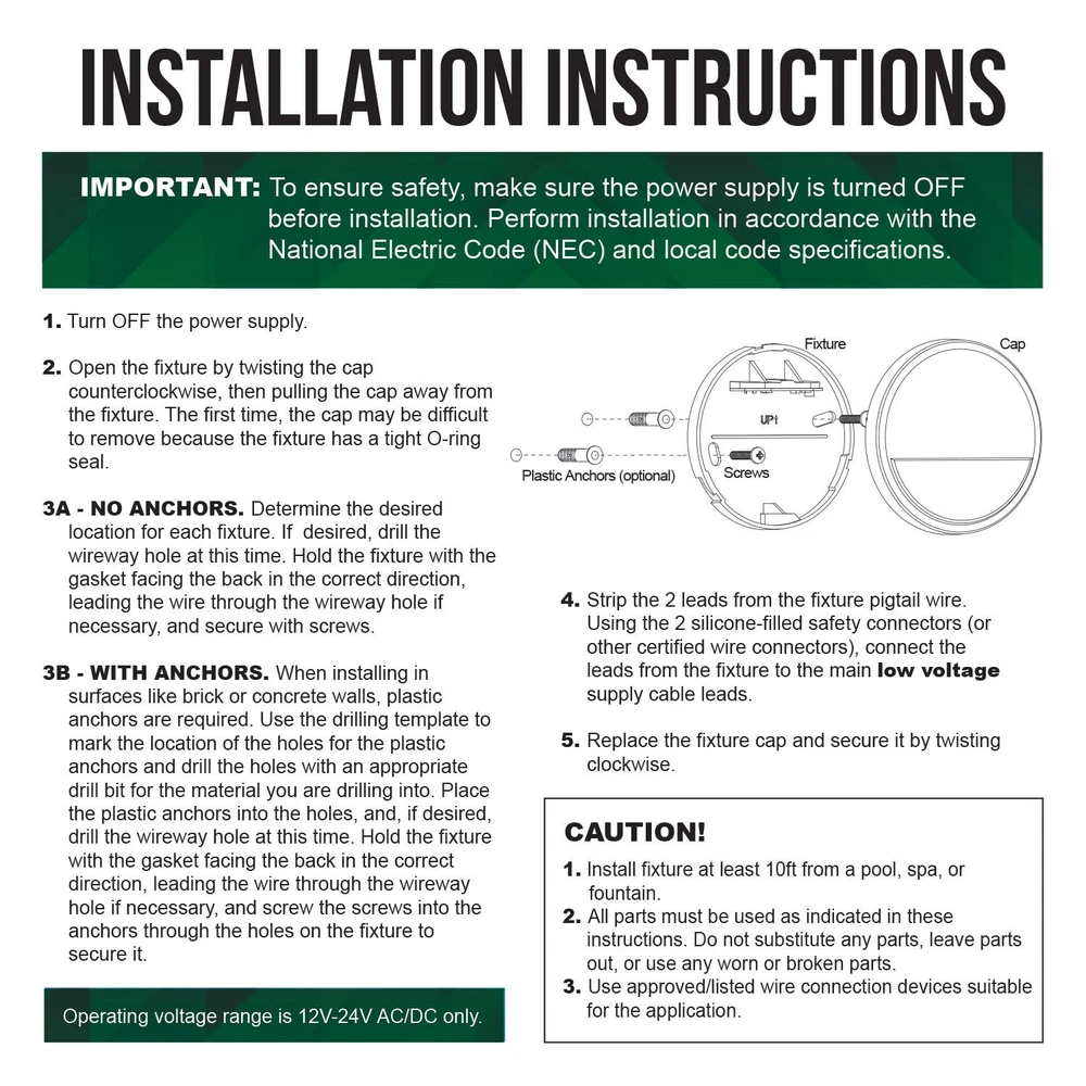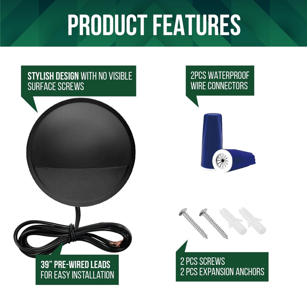 Sturdy and Durable: Solid die-cast aluminum housing with black powder coated finish provides great durability against environmental factors such as rain, snow, and UV rays. Suitable for wet locations. The black powder coated finish also gives the deck lights a sleek and modern look that will complement any outdoor space. Safe Operation & Reliable Performance: Designed to work with most 12V landscape lighting systems and has a working voltage of 9-15V AC/DC. Must be powered by 9-15V low voltage transformer (not included). This ensures that the deck lights are safe to use and will work with most lighting systems. Simple to Install: The fixture can be easily surface mounted with wire connectors (1 #14 w/1-3 #18 or 20 or 2 #14 w/1 #18), 2pcs screws & pre-wired 39" UL listed SPT-1W 18AWG leads included in each package. No screws at the surface. This makes it easy for you to install the deck lights yourself without needing professional help. (This fixture is only for downlight installation.) Wide Application: Comes with a 2W 2700K Integrated LED chip and full cutoff design which provides comfortable warm white light without annoying glare. Perfect for decks, stairs, and walkways etc. This makes it perfect for outdoor use and ensures that it will provide the right amount of light without being too bright or too dim. The full cutoff design also ensures that the light is directed downwards, reducing light pollution and making it more environmentally friendly. This product is covered for 2 years from the date of original purchase. us and we are here to help.