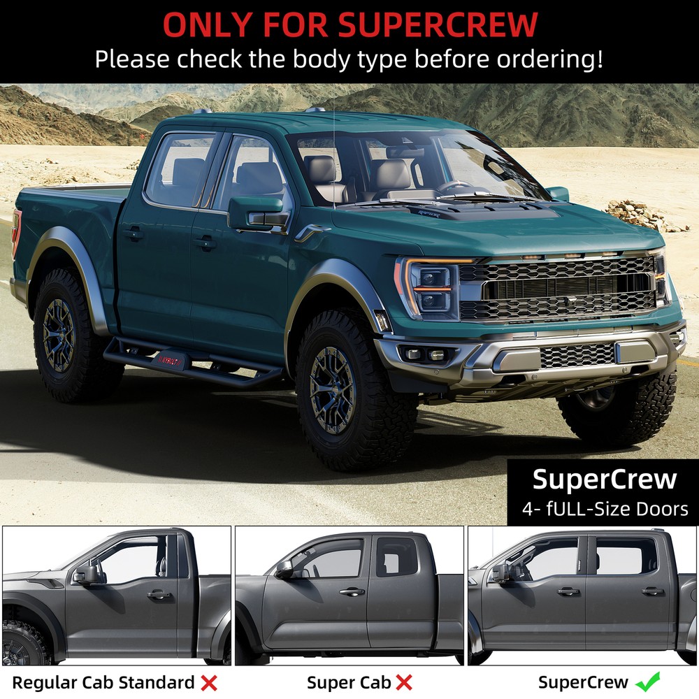 2X 6.5" Running Boards For 2015-24 Ford F150 Super Crew Cab Side Steps Nerf Bars Description: ---Robust Construction: Our steel two-step running boards are engineered with heavy-duty steel construction, providing exceptional strength and durability. The sturdy design ensures reliable support and enhances the overall rugged look of your car Enhanced Accessibility: Featuring two wide stepping platforms, Our two-step running boards offer improved accessibility for entering and exiting your car. The non-slip surface on each step provides added safety and stability, especially in challenging weather conditions. ---Aggressive Off-Road Look: The rugged design of Our steel two-step running boards not only ensures practical functionality but also adds an aggressive off-road aesthetic to your car. The appearance complements the vehicle's styling, making a statement both on and off the road. ---Precision Fit and Installation: Our steel two-step running boards are designed for a straightforward installation process. The included mounting hardware and precise fit ensure easy and secure attachment to the vehicle. Specifications: Color:Steel-Two Stairs Material:Alloy Steel Exterior Finish:Carbon Steel Features: Custom Fit: For 2015-2024 Ford F-150 SuperCrew Cab (4 Full-Size Doors) For 2017-2024 Ford F-250 F-350 Super Duty Crew Cab Note: Different displays may cause the color of the item in the picture a little different from the real thing. Manual measuring, please allow 1~3mm error,thank you. Payment Delivery details Returns details Feedback Payment We accept Payoneer only. All major credit cards are accepted through secure payment processor PayPal. Payment must be received within 7 business days of auction closing. If you have bought multiple items from me, you can send me one payment for all the items instead of paying for them individually. When you click the Pay Now button, eBay will automatically determine if there are other items you have won or purchased from me and will combine them for your review. NOTE: Import duties, taxes and chargers are not included in the item price or shipping charges. These charges are the buyer's responsibility. Please check with your country's customs office to determine what these additional costs will be prior to bidding buying. Delivery details 1. We will delivery out at the handing time when we receive the payment. 2. The delivery time is 3-5 business days to US by usually time.The parcel maybe delay 1-2day of the weekend.Due to the bad weather,Holidays,Hot Season ect.the parcel maybe delay,If you have any problems,mssage us,we will try our best to solve it. 3. We ship to your eBay address. Please make sure your eBay address is correct before you pay. 4. If you want to change the shipping address,message us before our send out. 5. We cannot deliver your order if your state is PR. Returns details 1. If you donot receive the items at the delivery time,the parcel has broken/missing,Please message us before you open case/return,we will try our best to solve it. 2. We offer a 30 day return policy from checkout winning date. 3. An RMA number is required for all returns. Message us for return instructions. Items Returned without a RMA number will not be processed. 4. Items defective upon receipt must be packaged in their retail packaging as if new and returned with a detailed description of the problem. 5. Return shipping fees are not refundable. We reserve the right to decline any returns if the above guidelines are not followed. Feedback If you are not satisfied with the item for any reason, please do not quick to leave negative/neutral feedback even open request and case without any communication with us. We devote ourselves making EVERY CUSTOMER in 100% Satisfactory and resolve any problem. Thank you for your understanding and recognition,we are always leave positive feedback to all our customers. Reply: All replies will be sent to your email box, if you do not get response within 24 hours (Sat. & Sun. excluded) please check your eBay My Messages in case that our emails will be filtered automatically by your settings.