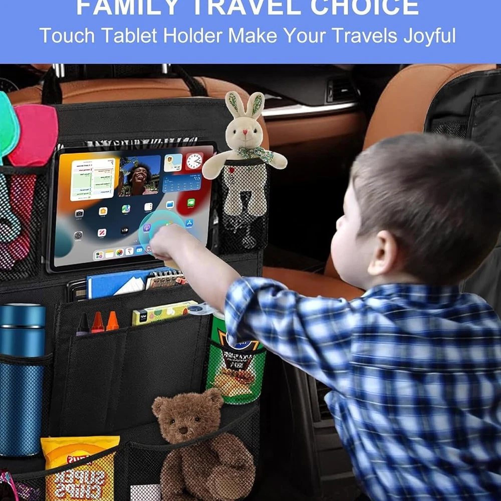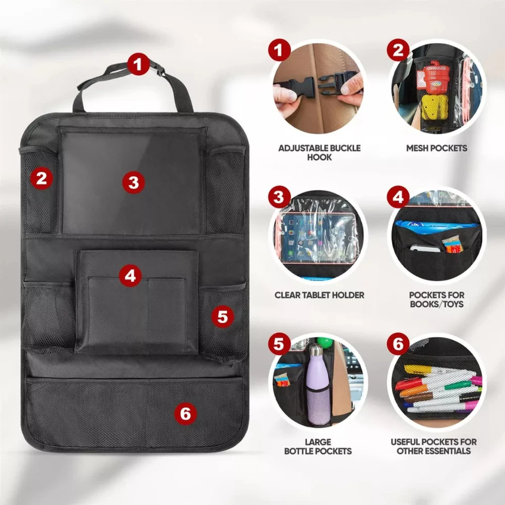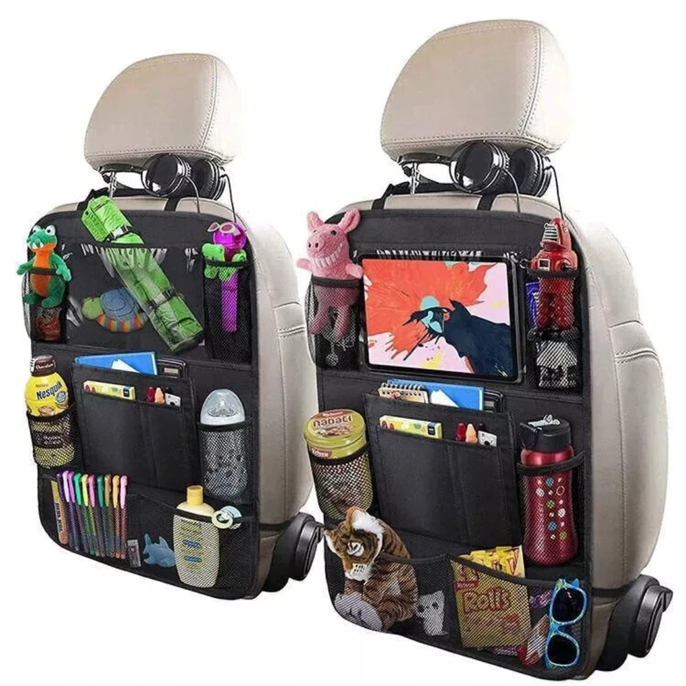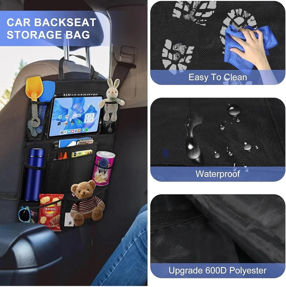Description: • Protect your car from kids dirty footprints, scribble, scratches etc. • An useful storage pockets to keep your car tidy and neat. • A tablet holder to take your ipad or tablet for children entertainment. • An organizer to hold kids' books, toys, bottles and some other small items. Features: -Suitable for most of cars and SUV -Waterproof, easy to clean -Environmentally friendly materials, health and safety -Extra-long straps to ensure a perfect fit for any car -Six organizer pockets, enough space for storage -Support tablet up to 9.7" -Fits the entire back seat of most vehicles, measuring 24" Wide x16" Long -Fold able storage, saving space and easy to carry Specifications: Material: Oxford Fabric+PVC Colour: Black Size: 16x24 Inch Package Included: 2x Car Back Seat Organiser