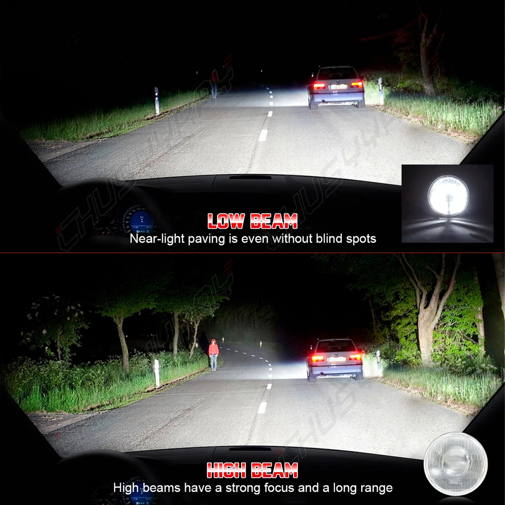 THESE ARE STOCK STYLE GLASS FACED / METAL BACKED HEADLIGHTS! INCLUDES (2) HIGH INTENSITY LED H4 6000K WHITE LIGHT BULBS! PAIR- 7" Stock Style H4 Headlights Glass Lens / Metal Backside High Intensity LED Bulbs Low And High Beam Functions (2) Low Beam / High Beam Headlights No Modifications Needed - Plug And Play Part Number Interchange: H6006 / 6006 For 12-Volt Systems Only DOT SAE Approved This listing is for a pair of new 7" stock style glass lens - metal back headlight bulbs. This set includes (2) low / high beam headlights with high intensity 6v LED light bulbs (no wiring or bucket modification needed). These have the original shaped prongs on the back so they will plug right into your original wiring harness plugs. These will fit any car or truck that has 2 round glass headlights & will fit into stock buckets. Each bulb is 7 inches in diameter. These are glass and we will take extra care in packaging. DOT SAE Approved INTERCHANGE: H6006 / 6006 All-In-One H4 6v LED Headlight Bulbs: 4,000 Lumen Bulbs - PAIR 4,000 LUMENS PER BULB! The LED conversion kit to rival HID power is finally here! The LED 12V conversion kits come in all different headlight and fog light bulb styles. Not only are the new LED conversion kits as bright as an HID system, but the new design from chusyyray, does not require a relay or harness or special drivers. The LED conversion kits from have the driver built in to the bulb, which means there are no external parts to mount or plug in, just replace your old halogen bulbs with the new ones and plug them in like the originals. The new u6s LED conversion kits from are the brightest on the market! Each dual beam 12v LED bulb produces 2,600 Lumens of light and draws 26 watts of energy on the low beam setting; but produces 4,000 Lumens of light and draws 40 watts of energy on the high beam setting. LED LIGHT BULB Specifications and Features: 2,600 Lumens Low Beam / 4,000 Lumens High Beam Light Output Per Bulb 360 Degree Light Beam Angle 26 Watts Low Beam / 40 Watts High Beam Energy Usage Per Bulb LED Light Color: 6,000K Weatherproof Rating: IP67 Waterproof Ball-Bearing Fan for Cooling Newest Technology All-In-One Design: No Ballast or Driver Required LED Protection Circuit to Protect from Reverse Polarity, Low Voltage or High Voltage Spikes Smart & Efficient Cooling System Uses Built-In Cooling Fan Greater Visibility - 3x Brighter than Factory Halogen Bulbs Voltage: 12-Volt High Quality Aluminum Heat Sink Ensures Proper Temperature Regulation Lower Power Consumption than Halogen Bulbs Vibration Proof Design 50,000 Hour Lifespan Easy Plug & Play Installation - No Modification Required No Splicing of Harnesses Required for LED Bulbs Uses 75% LESS Power than Halogen or HID Bulbs 3x Brighter than Stock Halogen Bulbs Dramatically Improves Visibility at Nigh