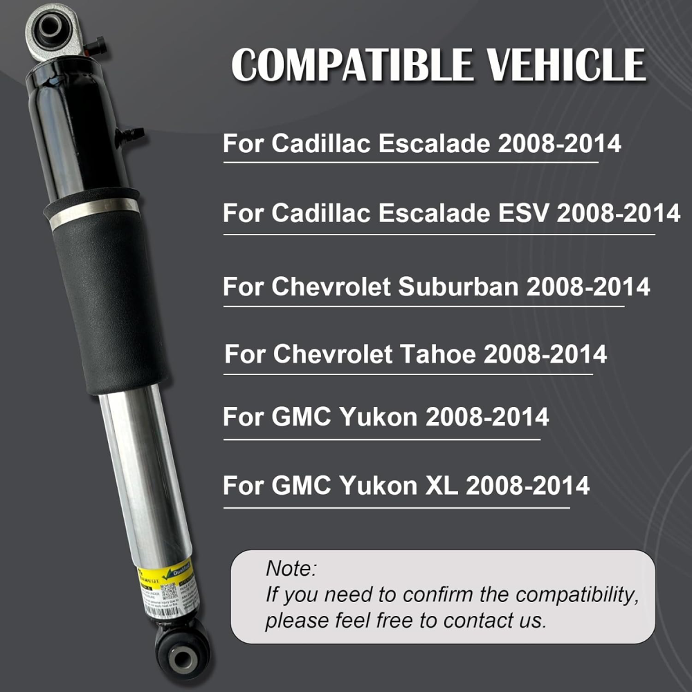 WHY OUR CUSTOMERS KEEP SHOPNG WITH US ✅All items are covered by manufacturer warranty. ✅FAST FREE SHIPPING. ✅Most orders ship within 1 business day with Tracking Number. Customer also can choose two-day or expedited shipping. ✅100% customer satisfaction is backed by a 30-Day Money Back Guarantee for New items and a 30-Day Money Back Guarantee for Recon. FEATURES 【Replacement Part Number】580-1091, 23487280, 19302786, 580-1057, 25871432, 19300046, 19331452, 23487281, 22187156, 580-458, 75-02197 ON, 75-02197ON, 17502197-101, 949-706, 949706. 2X Rear Shock Absorber Strut MagneRide Fit 2007-2014 Cadillac Escalade GMC Yukon WHY OUR CUSTOMERS KEEP SHOPNG WITH US ✅All items are covered by manufacturer warranty. ✅FAST FREE SHIPPING. ✅Most orders ship within 1 business day with Tracking Number. Customer also can choose two-day or expedited shipping. ✅100% customer satisfaction is backed by a 30-Day Money Back Guarantee for New items and a 30-Day Money Back Guarantee for Recon. FEATURES 【Replacement Part Number】580-1091, 23487280, 19302786, 580-1057, 25871432, 19300046, 19331452, 23487281, 22187156, 580-458, 75-02197 ON, 75-02197ON, 17502197-101, 949-706, 949706. 【Compatible Vehicle】Kalmaegee rear air shock struts are designed to fit Cadillac Escalade 2007-2014, for Cadillac Escalade ESV EXT 2007-2014, for Chevy Avalanche 2007-2013, for Suburban 1500/2500 2007-2014, for Tahoe 2007-2014, for GMC Yukon 2007-2014, for GMC Yukon XL 1500/2500 2007-2014. 【Improved Performance】The outer pipe is made of high strength, metal material with welding process, which has good strength and seismic performance. Our shock absorbers strut are engineered to provide higher damping force, less friction, and increased performance for a smoother ride. 【Easy Installation】Our rear struts shock assembly comes with air suspension spring bag included, making installation a breeze. No need to purchase additional parts or accessories. Simply replace your old, worn-out struts with our high-quality ones and enjoy a smoother, more comfortable ride. 【2-Year Warranty】We stand behind the quality of our products and offer a 2-year warranty for our rear shock absorbers. If you have any questions or concerns, please don't hesitate to contact us. We're here to provide you with comfortable service and ensure your satisfaction. FITMENTS For Cadillac Escalade 2007-2014 For Cadillac Escalade ESV EXT 2007-2014 For Chevrolet Avalanche 1500 2007-2014 For Chevrolet Suburban LS 2007-2014 For Chevrolet Tahoe LS 2007-2014 For GMC Yukon Denali 2007-2014 For GMC Yukon XL Denali 2007-2014 Note Easy to Install Fully-assembled unit includes everything you need for strut replacement. No need for coil spring compressor and special tools. Electrophoretic-coating Electrophoretic coating can improve corrosion resistance and oxidation resistance. Each Strut has been professionally tested. Superb Stability Each coil spring is specially designed to restore the ride height and support the weight of the vehicle, reducing body shaking and improve the handling performance. High Performance Detroit Axle parts are OE manufactured to meet expectations for fit, form, and function, offering high quality and great value. OEM NUMBER 580-1091,23487280,19302786,580-1057 25871432,19300046,19331452,23487281 22187156, 580-458,75-02197 ON 75-02197ON,17502197-101,949-706,949706 ITEM INCLUDES 2PCS Rear Air Shock Absorber Struts w/Magnetic Ride Control FREE RETURN If you are unhappy with your purchase for any reason, you can return it to us in an un-used condition in the original packaging within 30 days of purchase and we'll give you a refund or exchange. The refund/Exchange will not include postage/eBay costs. Please note you MUST contact us to obtain a Return Authorization Number before returning any part. Any parcel without the Return Authorization Number will be rejected *If your item is faulty or was incorrect, you must contact our sales representative before returning the parcel and we will endeavour to solve the problem effectively. Video or picture is required to show the item 、condition before we issue the Return Authorization Number. * Professional installation is highly recommended (No Instruction Included) * For any needs please contact us Item Specifics Brand : susucar Items Included : Strut, Rear Left & Right Struts with MagneRide Control, str Type : Rear Struts Shock Placement on Vehicle : Rear Features 1 : Equipped with Magnetic Ride Control Features 2 : 100% Accuracy of Fit, Adjustable, Easy to Replace Shock Absorber Type : Hydraulic Fluid OE/OEM Part Number : 580-1091, 23487280, 19302786, 580-1057, 25871432, 19300046 Interchange Part Number : 19331452, 23487281, 22187156, 580-458, 75-02197 ON Superseded Part Number : 75-02197ON, 17502197-101, 949-706, 949706. Shock Absorber System : Single Pipe Fitments 1 : For Cadillac Escalade 2007-2014 Fitments 2 : For Cadillac Escalade ESV EXT 2007-2014 Fitments 3 : For Chevrolet Avalanche 1500 2007-2014 Fitments 4 : For Chevrolet Suburban LS 2007-2014 Fitments 5 : For Chevrolet Tahoe LS 2007-2014 Fitments 6 : For GMC Yukon Denali 2007-2014 Fitments 7 : For GMC Yukon XL Denali 2007-2014 Material : High Density Rubber & Metal Fitment Type : Direct Replacement OE Spec or Performance/Custom : OE Spec About My Store : 100% SATISFACTION, 100% Source manufacturer Manufacturer : SUSUCARpartsWhosale Manufacturer Warranty : 2 Years Why choose US? Susucar is passionate about maintaining our culture of demonstrating value and building personal client relationships in perfecting the client experience. We are also a culture of giving back to the community and preserving our precious planet - a passion that runs deep throughout our Company. Every single item we sell goes through thorough inspection processes to make sure it works perfectly for you. If for any reason you are not satisfied with our product, please shoot us a message. We will do everything in our power to make things right Returns and