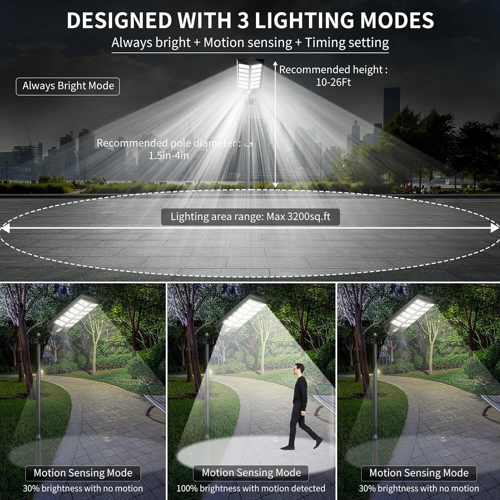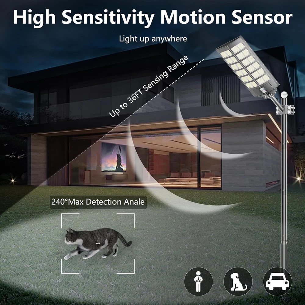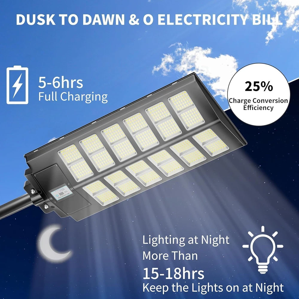Product Description 99000000LM 3000W Outdoor Commercial LED Solar Street Light Flood Light Road Lamp About this item [ INTEGRATED 220° WIDE ANGLE] solar parking lot lights is a commercial street light with double-sided multi-array design, High brightness new upgrade, Contrast flat lighting adds 40° range, Brightness increased by 80%. [ HIGH BRIGHTNESS - 0 ELECTRICITY BILL ] This 3000W solar outdoor street lights adopts 5730 model high brightness energy saving LED lamp beads, using polycrystalline A-grade solar panels, photoelectric conversion rate increased by 20%, about 6-8 hours can be fully charged, rainy days can also be charged. [ INTELLIGENT RADAR SENSOR CHIP ] Solar Street Lights Outdoor Dusk To Dawn run automatic operation without maintenance, Outdoor solar powered street light has 3 modes 1. Dusk to Dawn sensor 2. Motion Sensor 3. Remote Control. Remote control: remote on/off, 4 kinds of brightness switching. 2/3/5/6/8 hour countdown off. [ EASY TO INSTALL ] solar powered street lights waterproof comes with all the assembly accessories needed to install on a wall, pole, tree, balcony or anywhere outdoors. The suitable diameter of lighting pole is 1.5 IN- 4 IN. No wiring is required and is suitable for courtyard,commercial square and other outdoor places. Best choice for electricity bills free. [ DURABLE AND WATERPROOF ] IP66 waterproof LED street solar light adopts high-quality ABS and die-cast aluminum frame, which is sturdy and durable, suitable for outdoor environment, no matter rainy days, high temperature.low temperature and other harsh environments. Brand:PFCTART Color:Black Material:Aluminum Style:Modern Light fixture form:Wall Room Type:Outdoor Product Dimensions:34*8*75cm Specific Uses For Product:Yard Indoor/Outdoor Usage:Outdoor Power Source:Solar Powered Special Feature:Waterproof, Motion Sensor, Water Resistant Control Method:Remote Light Source Type:LED Finish Type:outdoor light Shade Material:Aluminum Number of Light Sources:1 Voltage:6 Volts Shape:Trapezoid Lighting Method:Dusk to dawn, motion sensing Item Weight:4.2KG Number of Items:2 Wattage:3000 watts Controller Type:Remote Control Unit Count:1.0 Count Brightness:120000 Lumen Mounting Type:Wall Mount Shade Color:Black Fixture Type:Non Removable Assembly Required:Yes Manufacturer:PFCTART Country of Origin:China Finish types:outdoor light Maximum Compatible Wattage:3000 Watts Special Features:Waterproof, Motion Sensor, Water Resistant Batteries Included?:Yes Wattage:3000 Watts Color Temperature:7000 Kelvin Average Life:50000 Hours Included Components:2 * Mounting bracket, 2 * Set of mounting accessories, 2* Remote control(Including batteries), Manual, 2* Solar powered street light About Us Payment Shipping Returns Contact Us Welcome to our store, your support is the biggest driving force for us to move forward. Our main businesses are solar panels, lithium iron phosphate batteries, electric vehicle chargers, solar outdoor/indoor lights, travel solar panels, etc . The product is directly connected with the factory to ensure product quality. Please rest assured to buy, we will provide you with a perfect shopping experience! We accept payment via Paypal only. Payment must be completed within 7 days. If you have any problems about payment, please contact us by ebay message. We only ship to confirmed eBay addresses. Please comfirm that your eBay address is in line with your shipping address. Most of our products are provided with shipping services. Also, the each additional item means exactly the the same color and size. The item shipping from USA. It takes about 5-10 working days to your addresses; Transit time may be a little delayed because of the bad weather. If you do not receive your item within 15 working days since payment finished, please contact us immediately for further assistance. If you have any issue about Item. Please contact us with 7 days since you receive the item and and return to us within 30 days from the delivery date for exchange or refund. If you need return, please contact our customer service representative, let us know the detailed problem and send us some pictures for confirmation. We strive for 100% customer satisfaction! Positive Feedback is very important to us. If you have any questions, please feel free to contact us via "Ask seller a question" . We will reply your email within 24 working hours. About Us Welcome to our store, your support is the biggest driving force for us to move forward. Our main businesses are solar panels, lithium iron phosphate batteries, electric vehicle chargers, solar outdoor/indoor lights, travel solar panels, etc . The product is directly connected with the factory to ensure product quality. Please rest assured to buy, we will provide you with a perfect shopping experience! Payment We accept payment via Paypal only. Payment must be completed within 7 days. If you have any problems about payment, please contact us by ebay message. Shipping We only ship to confirmed eBay addresses. Please comfirm that your eBay address is in line with your shipping address. Most of our products are provided with shipping services. Also, the each additional item means exactly the the same color and size. The item shipping from USA. It takes about 5-10 working days to your addresses; Transit time may be a little delayed because of the bad weather. If you do not receive your item within 15 working days since payment finished, please contact us immediately for further assistance. Returns If you have any issue about Item. Please contact us with 7 days since you receive the item and and return to us within 30 days from the delivery date for exchange or refund. If you need return, please contact our customer service representative, let us know the detailed problem and send us some pictures for confirmation. Contact Us We strive for 100% customer satisfaction! Positive Feedback is very important to us. If you have any questions, please feel free to contact us via "Ask seller a qu