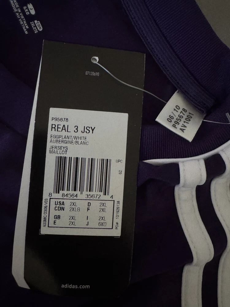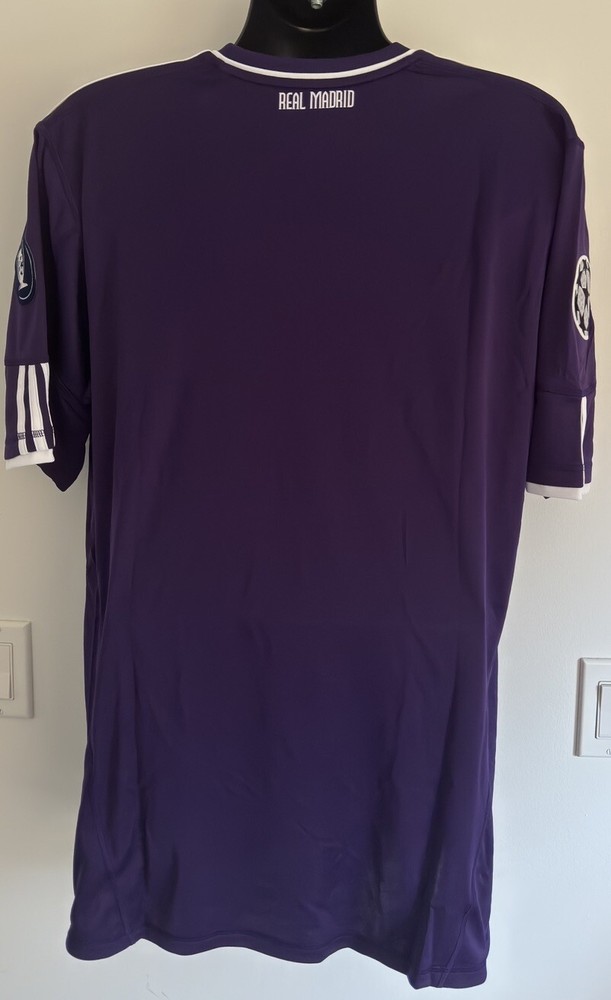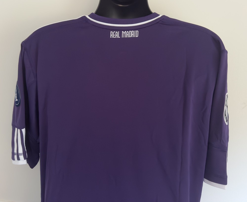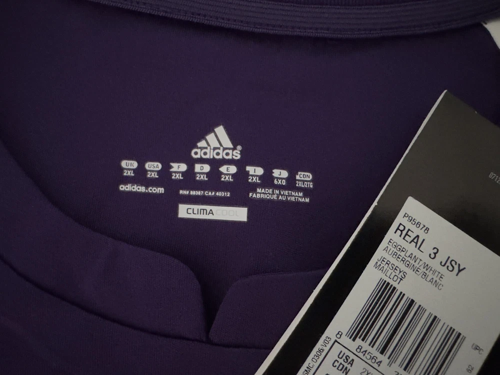 Product: Shirt Team: Real Madrid Brand: adidas Officially Licensed: Yes Size: 2XL Sport: Soccer Player: Real Madrid Bwin Soccer Jersey Event/Tournament: LaLiga Gender: Men Color: Purple Country/Region of Manufacture: Vietnam