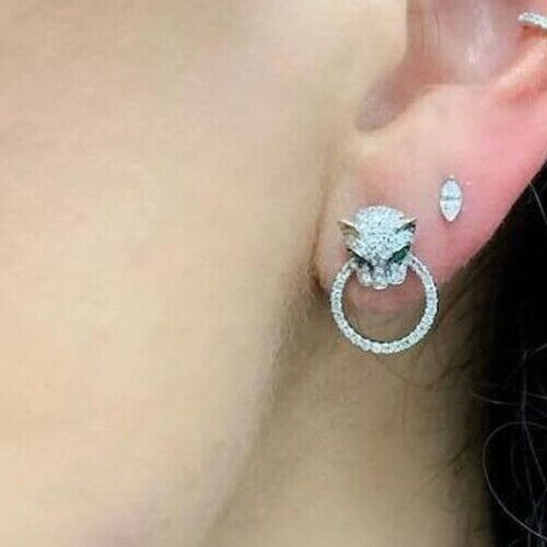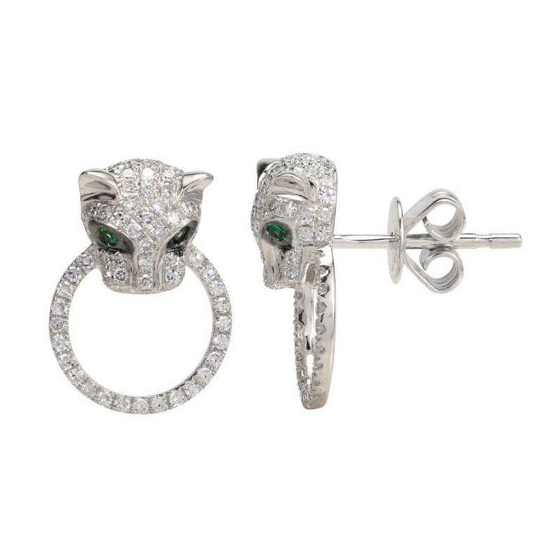These unique Panther Stud Earrings feature 2 Ct Round Simulated Emerald stones set in 14k White Gold Plated Sterling Silver. The earrings showcase a butterfly closure and a stylish design perfect for various occasions like engagements, weddings, birthdays, and more. The green main stones are complemented by simulated diamonds and have a width of 3.5 mm, with an overall item length of 15 mm. These handmade earrings can be personalized and are nickel-free, making them a beautiful and versatile accessory option for any jewelry lover.