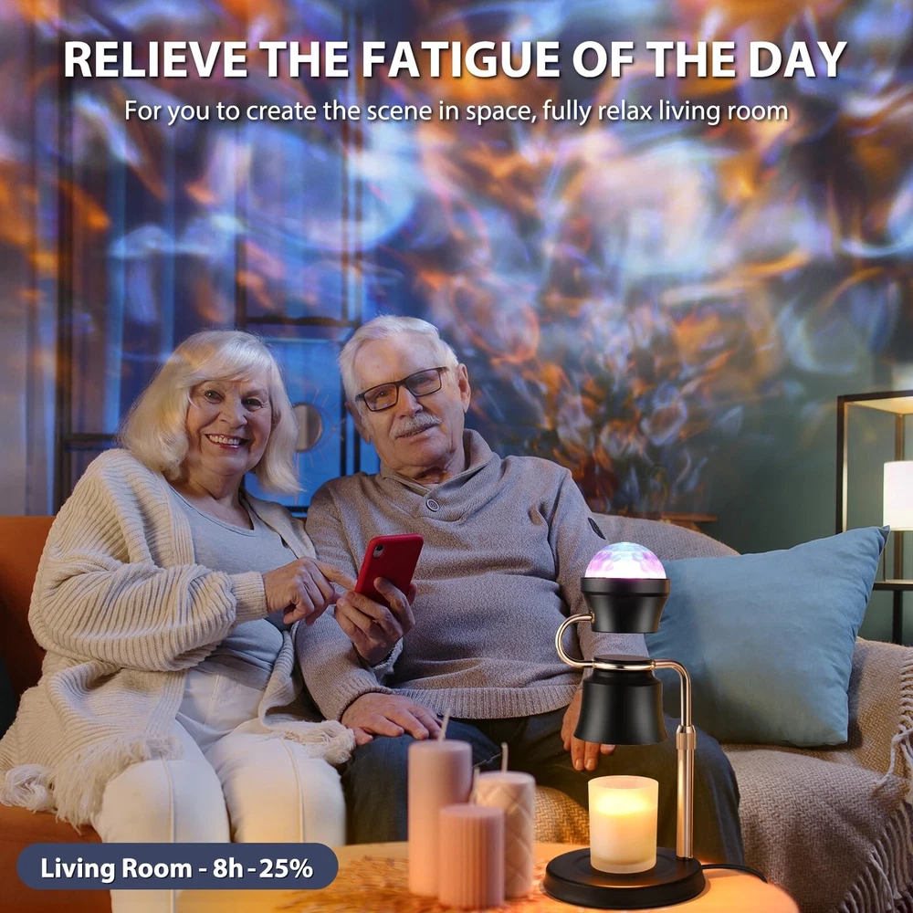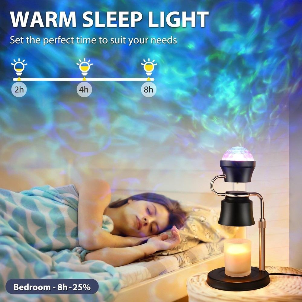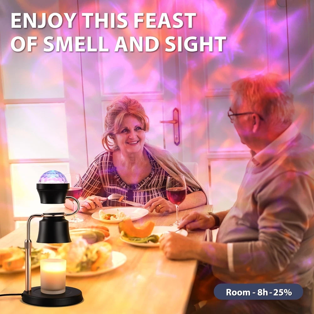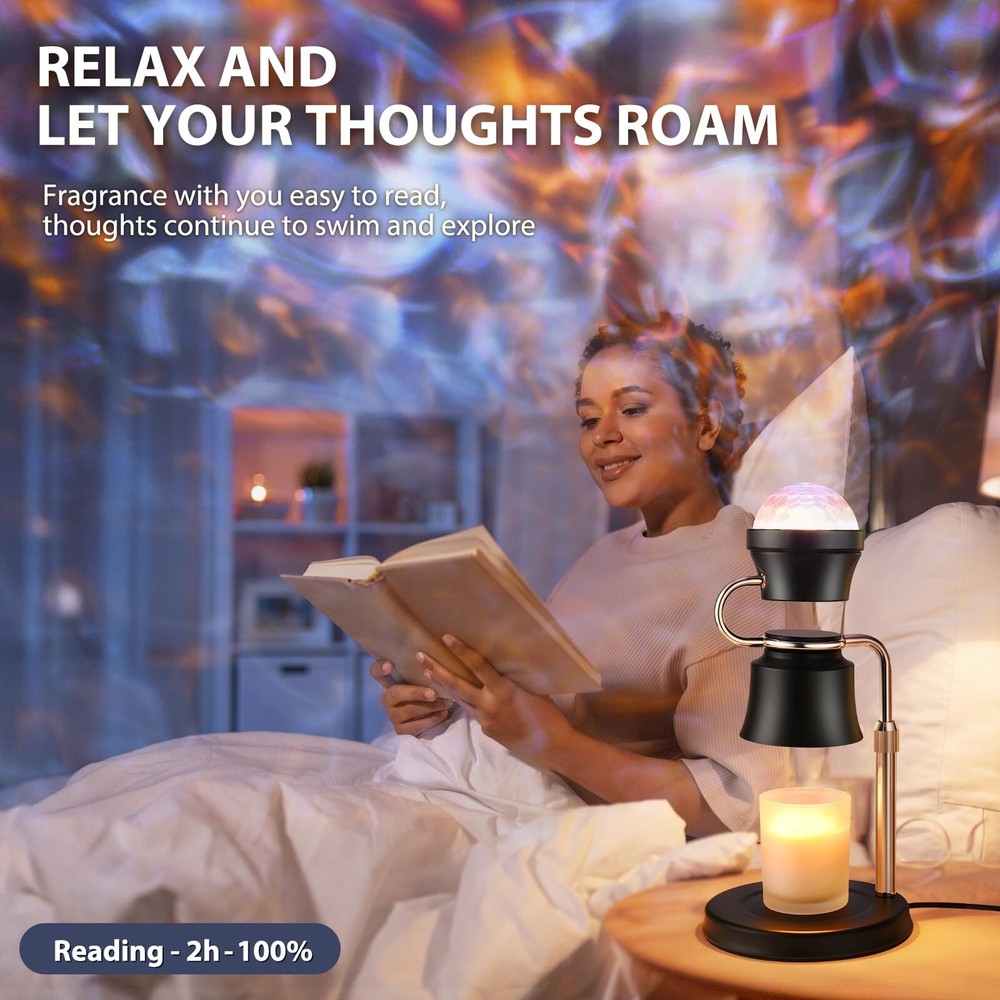 2 in 1 Adjustable Candle Warmer Lamp with Timer and 180° Rotating Light Projector,Electric Candle Warmer, Mom,House Warming Gifts New Home Bedroom Decor Dimmable Candle Lamp Product Details Finish Type: Painted Base Material: 铸铁 Bulb Base: GU10 Product Dimensions: 6.3"D x 6.3"W x 11.6"H Item Weight: 2.2 Pounds Product Dimensions : 6.3 x 6.3 x 11.6 inches; 2.2 Pounds Item model number : 01 Date First Available : September 25, 2024 Manufacturer : PRISESSA Country of Origin : China Customer Reviews: 4.4 4.4 out of 5 stars 38 ratings Finish Type: Painted Base Material: 铸铁 Bulb Base: GU10 Product Dimensions: 6.3"D x 6.3"W x 11.6"H Item Weight: 2.2 Pounds Lamp Type: Night Light Shade Color: Black Shade Material: Metal Switch Type: Touch Style: Contemporary Brand: PRISESSA Color: Black Light Source Type: Halogen Material: Cast Iron Power Source: AC adapter Number of Light Sources: 2 Included Components: Bulb Is Waterproof: false Bulb Shape Size: G16 1/2 Mounting Type: Tabletop Wattage: 5E+1 Number of Items: 1 Lighting Method: Incandescent Indoor/Outdoor Usage: Indoor Number of Pieces: 1 Efficiency: Energy Efficient Is Cordless?: No UPC: 753584375674 Manufacturer: PRISESSA Shade Height: 5.3 Inches Part Number: 001 Item Weight: 2.2 pounds Country of Origin: China Item model number: 01 Finish types: Painted Batteries Required?: No Date First Available: September 25, 2024 INNOVATIVE DESIGNCreatively combining the functions of the warming candle lamp and the projector lamp, you can enjoy the scent of the candle while appreciating the soft light of the projector lamp. Our candle warmer lamp will create a warmer and more romantic environment for you, helping you sleep or relax.Our candle warmers is the better choice for relaxing and creating a romantic atmosphere SAFE CANDLE WARMEROur candle warmer kit comes with two 50W GU10 bulbs(NO CANDLES INCLUDED), providing a safer way to light candles than traditional open flames in homes with pets, children or the elderly, eliminating the risk of fire, burns and smoke, and satisfying the need to enjoy soothing fragrance and soft light without having to worry about open flames BETTER GIFT FOR MOM Whether the candle warmer with timer is a housewarming gift, new home necessities, birthday gifts for women, Valentine's Day gifts, or anniversary, wedding, Mother's Day, Father's Day, Christmas gift, our candle warming lamp is a thoughtful and unique gift, whether it can be used in the bedroom, office, study, living room PERFECT HOME DECOR GIFT This electric candle warmer adopts a stylish metal lampshade design, with a beautiful projector lamp, adding a touch of elegance to the home, office. The unique lamp candle warmer plus projector lamp design adds a sense of fashion and science fiction, suitable for a variety of environments, from living room to office, Valentine's Day decoration, bedroom decoration aesthetics, etc. Our candle light warmer can also be used as a night light ELECTRIC DIMMER & TIMEROur candle warmer lamp with timer has 4-level adjustable brightness and projector lamp has a 90 adjustable, allowing to create the perfect atmosphere for any occasion. With the dimmer control, can adjust the melting speed of the candle. The higher the setting, the faster the wax melts. The dimmable candle warmer lamp's built-in timer function of 2, 4, or 8 hours allows the candle to be used longer, which is a cost-saving and environmentally friendly choice