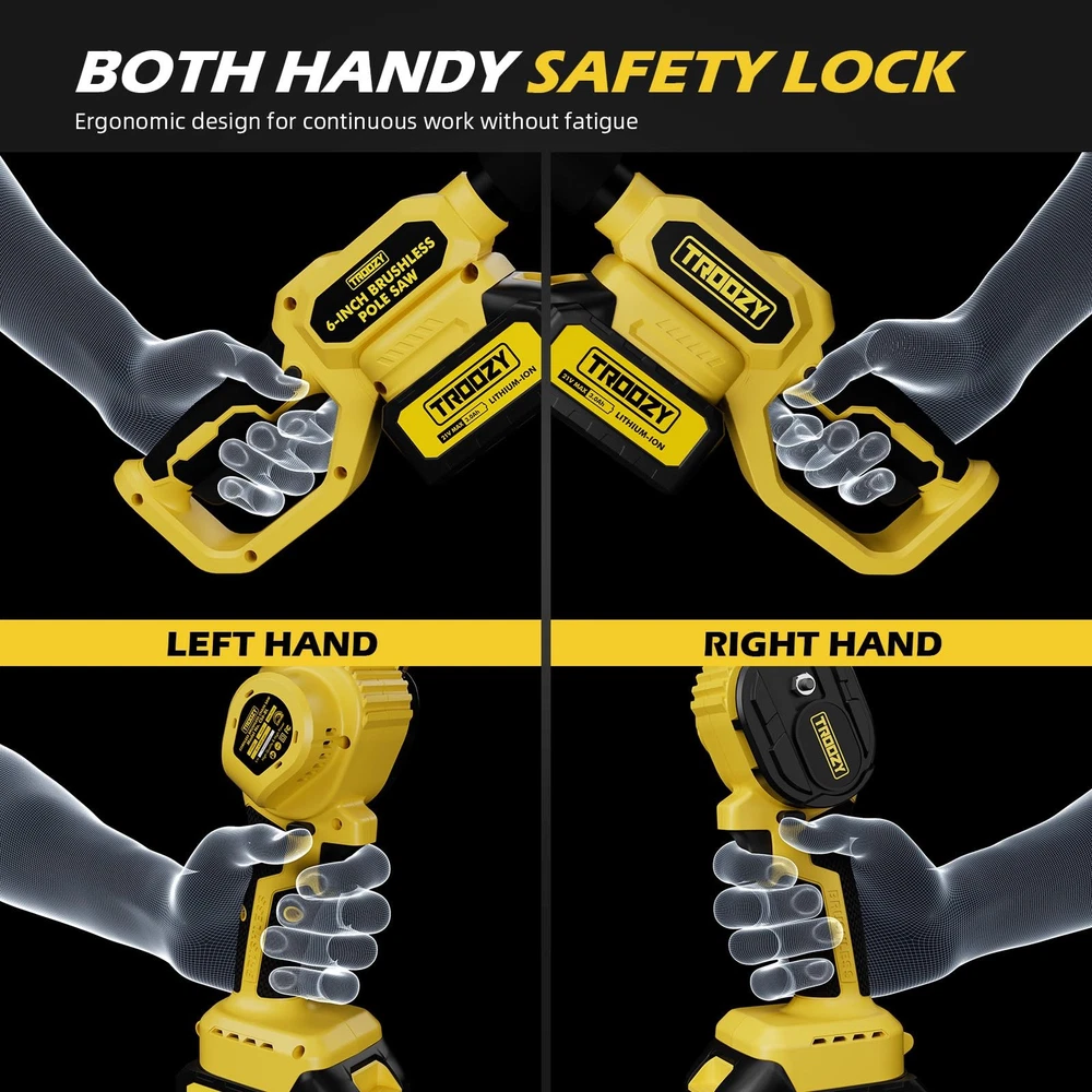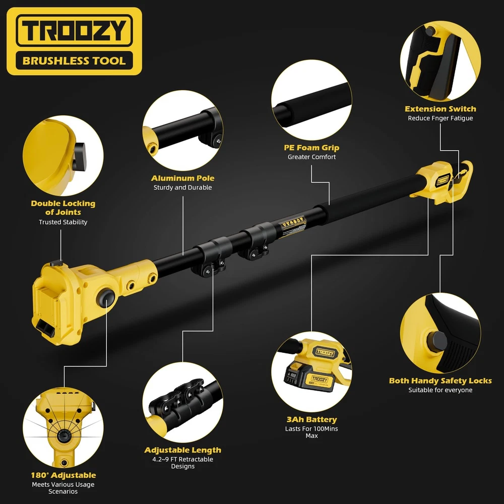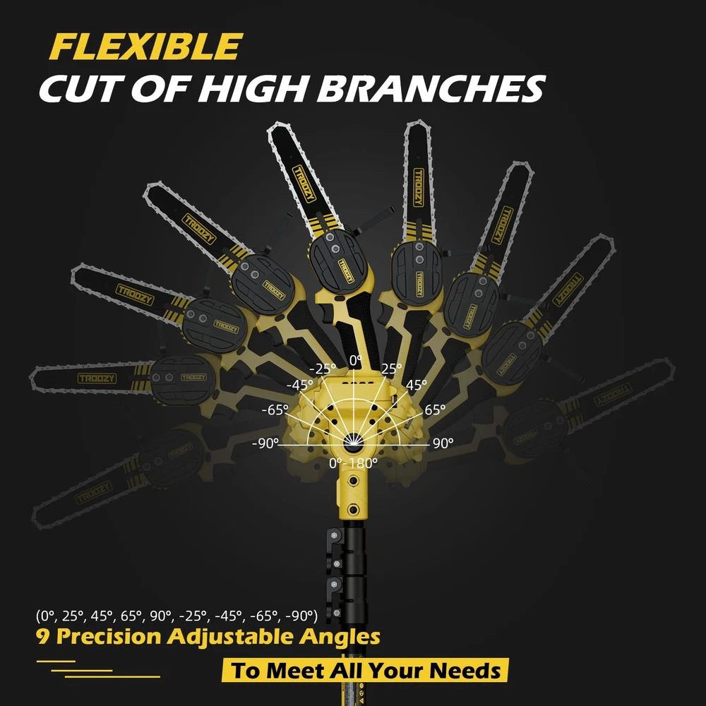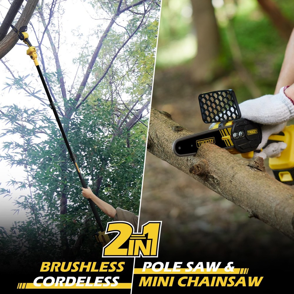 【Adjustable Multi-Angle Cutting Extension Pole】The pole saw makes tough jobs safer without relying on unstable ladders, and the upgraded extension pole swivels to adjust different cutting directions for different cutting situations and has multiple adjustable angles so you can easily trim branches in different locations. The extension pole extends from 4.2 ft. to 9 ft. for up to 15 ft (based on a 6-foot tall person holding the pole saw in an extended position at shoulder level). 【2-IN-1 POLE SAW & CHAINSAW】pole saw combine 6" brushless chainsaw & 9ft telescopic pole. You can use it for high branches & tree trimming or use the mini chainsaw alone for wood cutting, which makes it a perfect trimming assistant 【UP TO 100MIN】Powered by the 21V 3000mAh battery, this electric pole saw can last 3-4 times longer than a 2Ah chainsaw. The fast charging can fill up in 2 hours with up to 100 minutes of battery life, virtually eliminating interruptions 【ADJUSTABLE MULTI-ANGLE & REACH OF 15FT CUTTING】The upgraded rotated pole has a telescoping range of 4.2~9ft and adjustable multi-angle 0~180°. You no longer need to stand on an unsafe ladder to cut. Easily trim branches in different locations and angles 【POWERFUL & DURABLE】professional ultra-powerful brushless chainsaw takes only 7 seconds to cut a 6-inch tree. The Aluminum pole shell is anti-scratch, and the upgraded internal structure lets repeated stretching is not easy to break