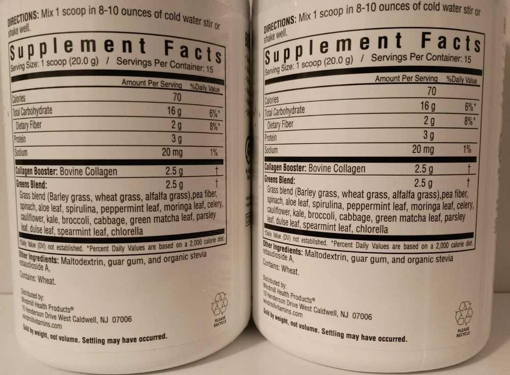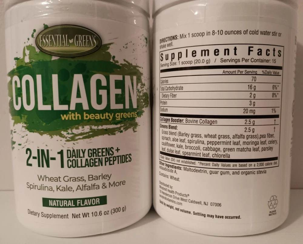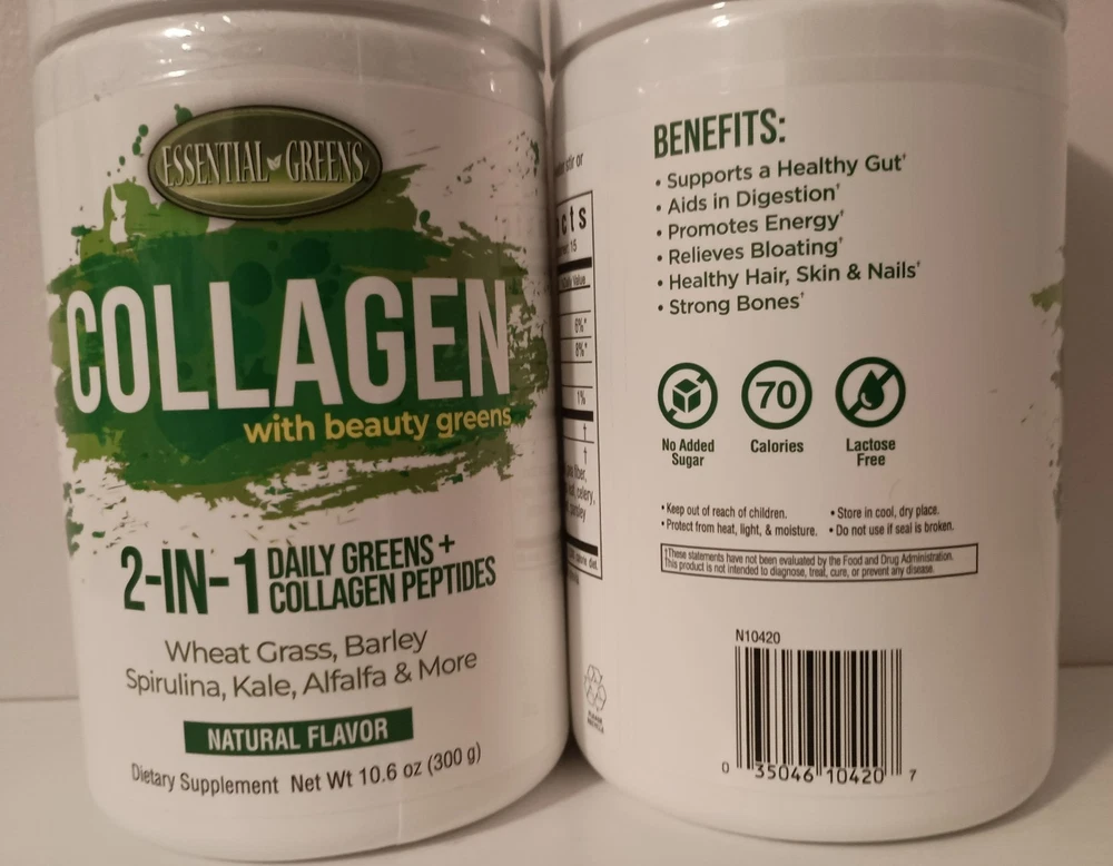 Volume: 10.6 OZ Formulation: Powder Main Purpose: Anti-Aging, Cognitive Health, Digestive Support, Hair, Skin & Nail Health, Immune Support, Joint Support, Sports and Fitness Performance, Strong Bones, Gut Health Custom Bundle: Yes Brand: ESSENTIAL GREENS gtin13: 035046104207 Active Ingredients: Barley Grass, Spirulina, Wheatgrass, Alfalfa, Kale & more....., Bovine Collagen Number of Pills: Powder Flavor: NATURAL Item Weight: 10.6 OZ Nutrition Facts Label: Yes When to Take: Before Meal UPC: 035046104207 Country/Region of Manufacture: United States Department: Unisex MPN: N10420 Expiration Date: 01/2028 Type of Diet: REGULAR Type: Collagen with Beauty Greens Features: All Natural, Lactose-Free, No Added Sugar