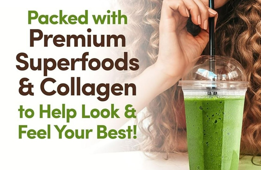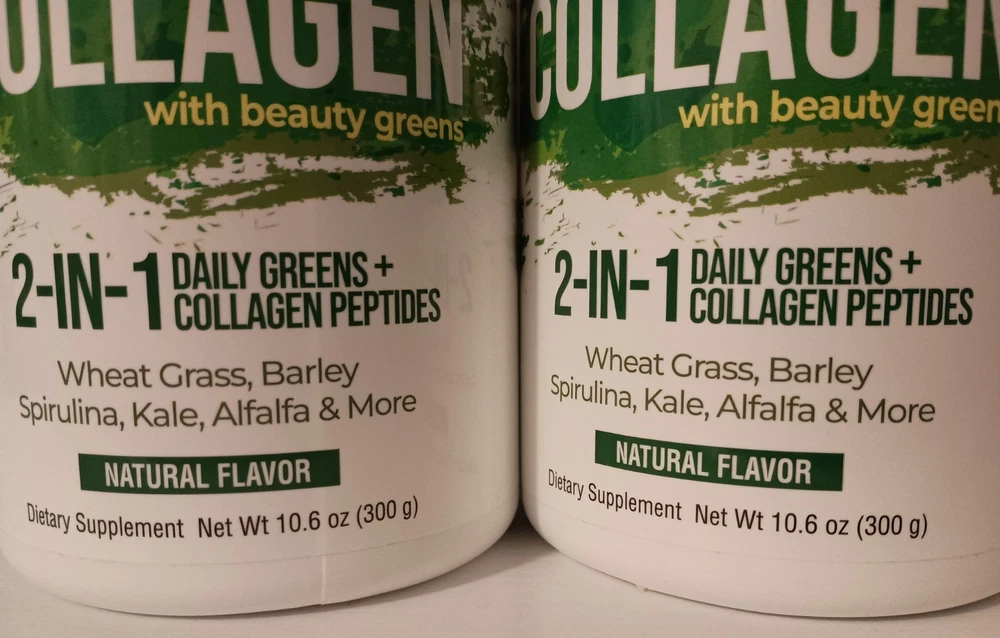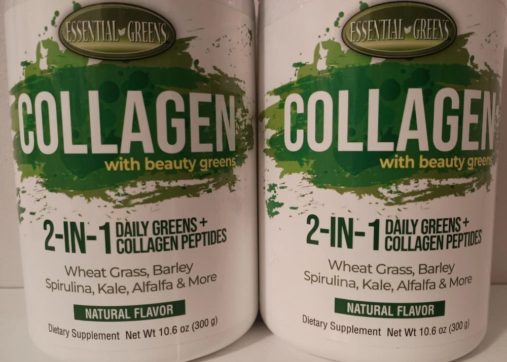Essential Greens Collagen with Beauty Greens with Bovine Collagen Peptides, 2-IN-1 Daily Greens + Collagen Peptides & Wheat Grass, Barley, Spirulina, Kale, Alfalfa & More. Natural Flavor, Dietary Supplement - 10.6 oz (2 Pack) by Essential Greens Aging stress, diet and hormonal changes affect the health of your body. Collagen is the most abundant protein in the body and is a key constituent of all connective tissues. This natural anti-aging powerhouse will help support youthful skin, healthier hair, stronger nails and helps keep bones healthy and strong. Features: • Natural flavor dietary supplement • Perfect for mixing into juices or smoothies • All-in-one formula with essential greens and collagen • Promotes healthy skin and strong bones • With Bovine Collagen Peptides This Collagen Dietary Supplement from Essential Greens comes in a Natural flavored powder that can be added to smoothies or juices. It's formulated with Bovine Collagen Peptides & contains wheat grass, barley, spirulina, kale, alfalfa and more. Taking this helps promote healthy skin and strong bones.