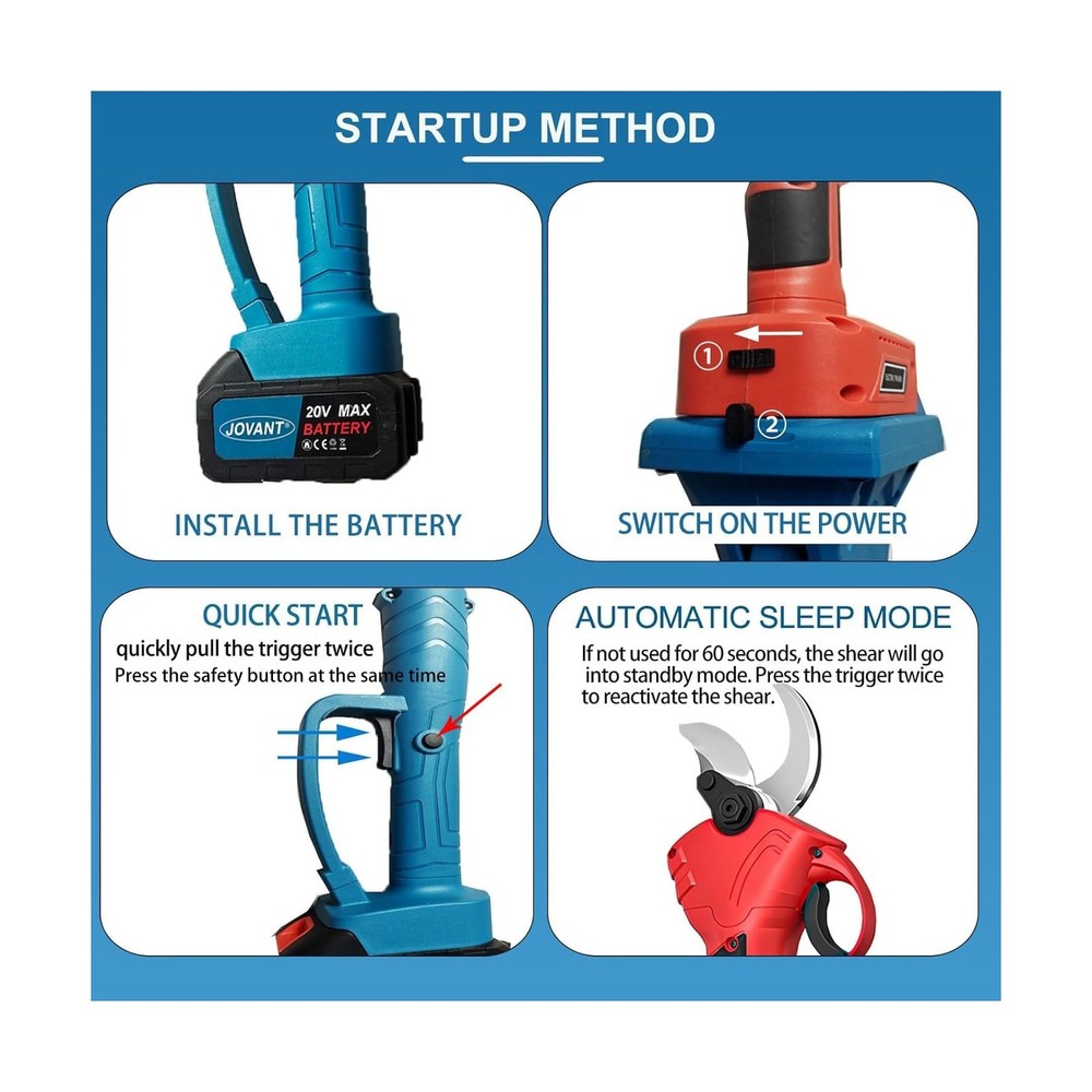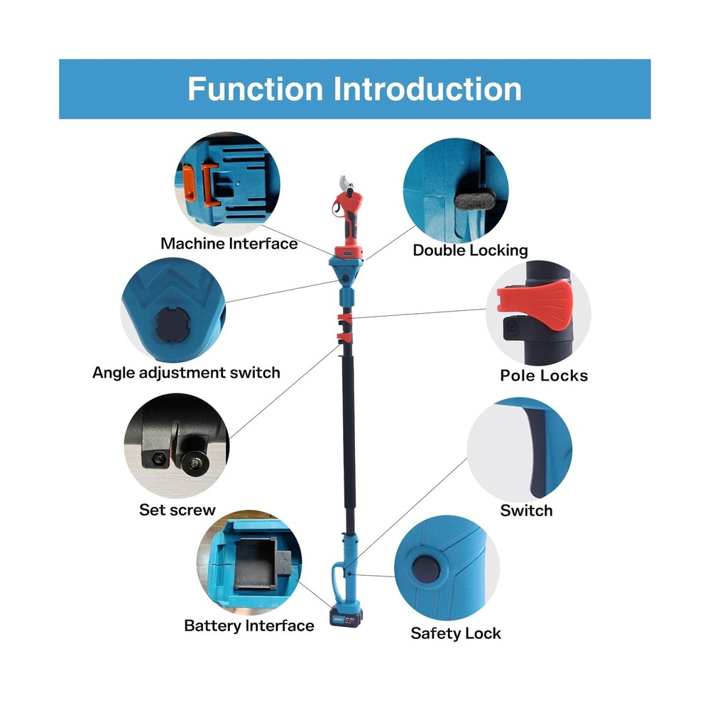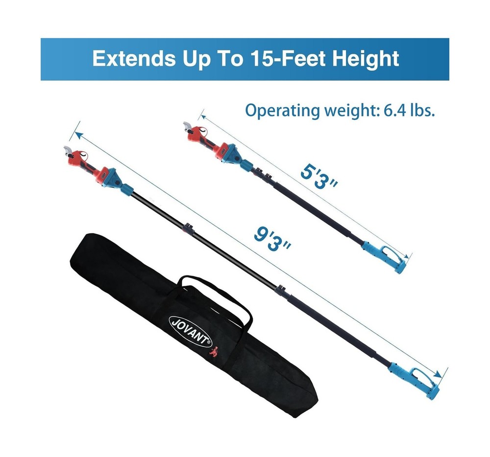 2-in-1 Electric Pruning Shears Cordless with Pole, 20V Cordless Pruning Shears,4.0Ah Battery Operated Pruning Shears, 9.3Ft -Up to 15.3Ft Telescopic Electric Shears for Gardening JOVANT Description Features: Electric Pruner with Two cutting diameters: Jovant Cordless Pruner has a maximum pruning diameter of 1.2(30mm),which can reduce strain to safely cut off thick branches high up,and a half-open pruning diameter of 0.8(20mm),which is more efficient,more power-saving, and quickly cuts through thinner branches. Battery Pruning Shears(pole shears + handheld): Equipped with a 15-foot extension pole for tree maintenance without a ladder or heavy equipment,this electric pruning shear for tree trimming combines power and precision with a maximum diameter that can handle most small to medium-sized branches. SK5 High-Carbon Steel Blade & Brushless Motor: Cordless pruning shears Ultra-sharp blades made of SK5 high carbon steel cut through live wood up to 30 mm thick in less than 1 second and last for 500-1000 pruning cycles on a single charge,while the superior sharpness of the blades creates a smooth surface that protects the health of the plant and speeds healing. Lightweight Design & Dual-Safety Protection: This electric pruners cordless weighing just 6.4 lbs including(battery+pole),features an ergonomic grip for fatigue-free overhead pruning,electric pruning shears cordless Dual safety system - Requires two button presses to operate,while auto idle lockout engages after 60 seconds. Battery Powered Pruning Shears package includes: 1.2" electric pruner x 1,15ft Reach Pole x 1,4000mAh lithium battery x 1,100-240V universal charger x 1 ,waterproof storage case x 1,and illustrated manual x 1. The electric pole pruner comes with a 12-month warranty covering the motor and body (the blades and batteries are not included). Product Details: Brand: jovant Item Weight: 6.4 Pounds Style: Pole Pruning Shears Blade Material: High Carbon Steel Blade Length: 1 Inches Brand: ‎jovant Item Weight: ‎6.4 Pounds Style: ‎Pole Pruning Shears Blade Material: ‎High Carbon Steel Blade Length: ‎1 Inches Handle Material: ‎Rubber, Plastic Blade Type: ‎Bypass Hand Orientation: ‎Ambidextrous Point Style: ‎Round point Cutting Width: ‎1.2 Inches Size: ‎15.3 feet Manufacturer: ‎jovant Item Weight: ‎6.4 pounds Package Dimensions: ‎51 x 8 x 4.5 inches Item model number: ‎PTJ-008-02 Batteries: ‎1 Lithium Ion batteries required. (included) Material: ‎High Carbon Steel, Plastic Power Source: ‎Battery Powered Voltage: ‎20 Volts Special Features: ‎Lightweight Included Components: ‎Batteries, Charger, Electric Pruning Shears, Pole Batteries Included?: ‎Yes Batteries Required?: ‎Yes Battery Cell Type: ‎Lithium Ion Date First Available: January 22, 2024 Delivery We Do Not Ship Outside of the Continental US. Return Policy All items qualify for returns within 30 days of receipt. Buyer is responsible for return shipping on any item that is not damaged. Feedback We take our reputation seriously, we buy and sell online, so we understand the value of trust. If you are unsatisfied with your order, please contact us and we will work with you to resolve it to your satisfaction.