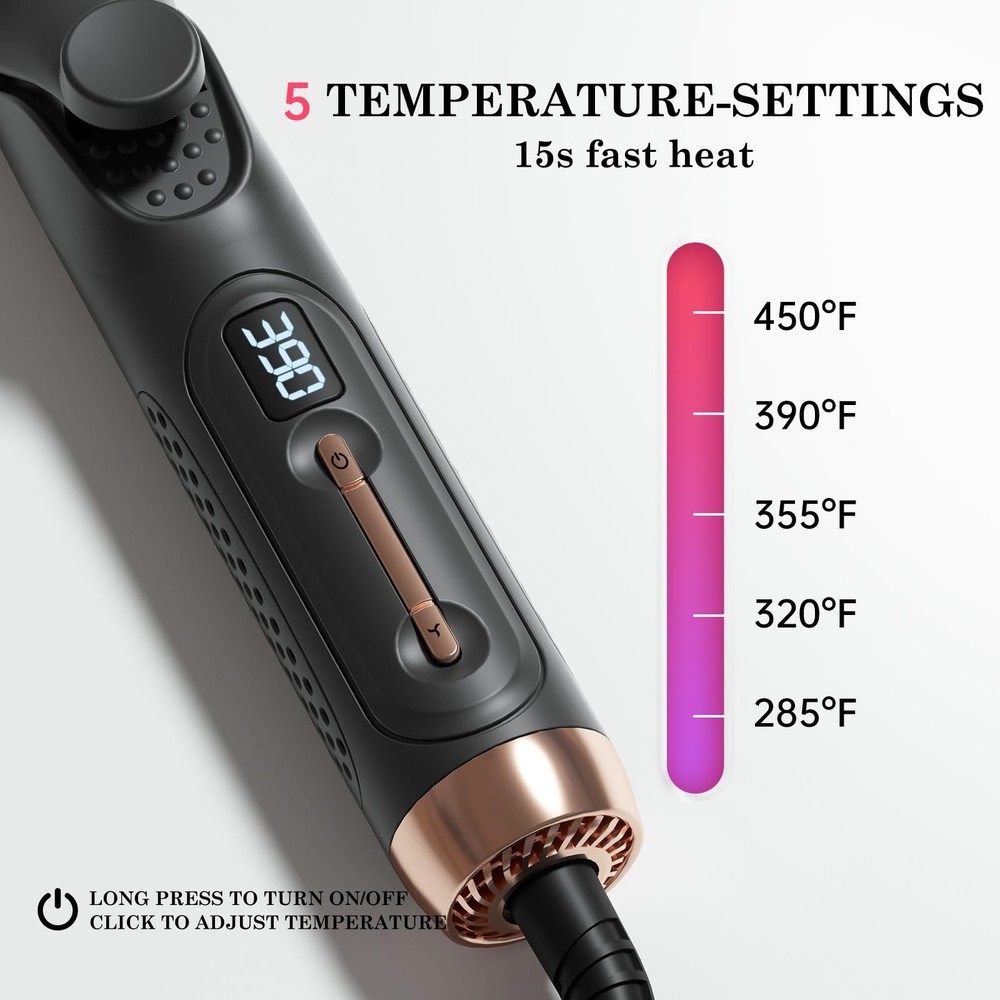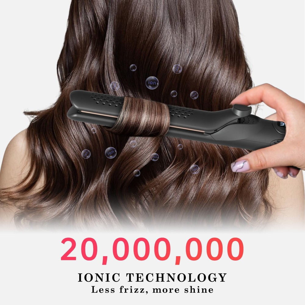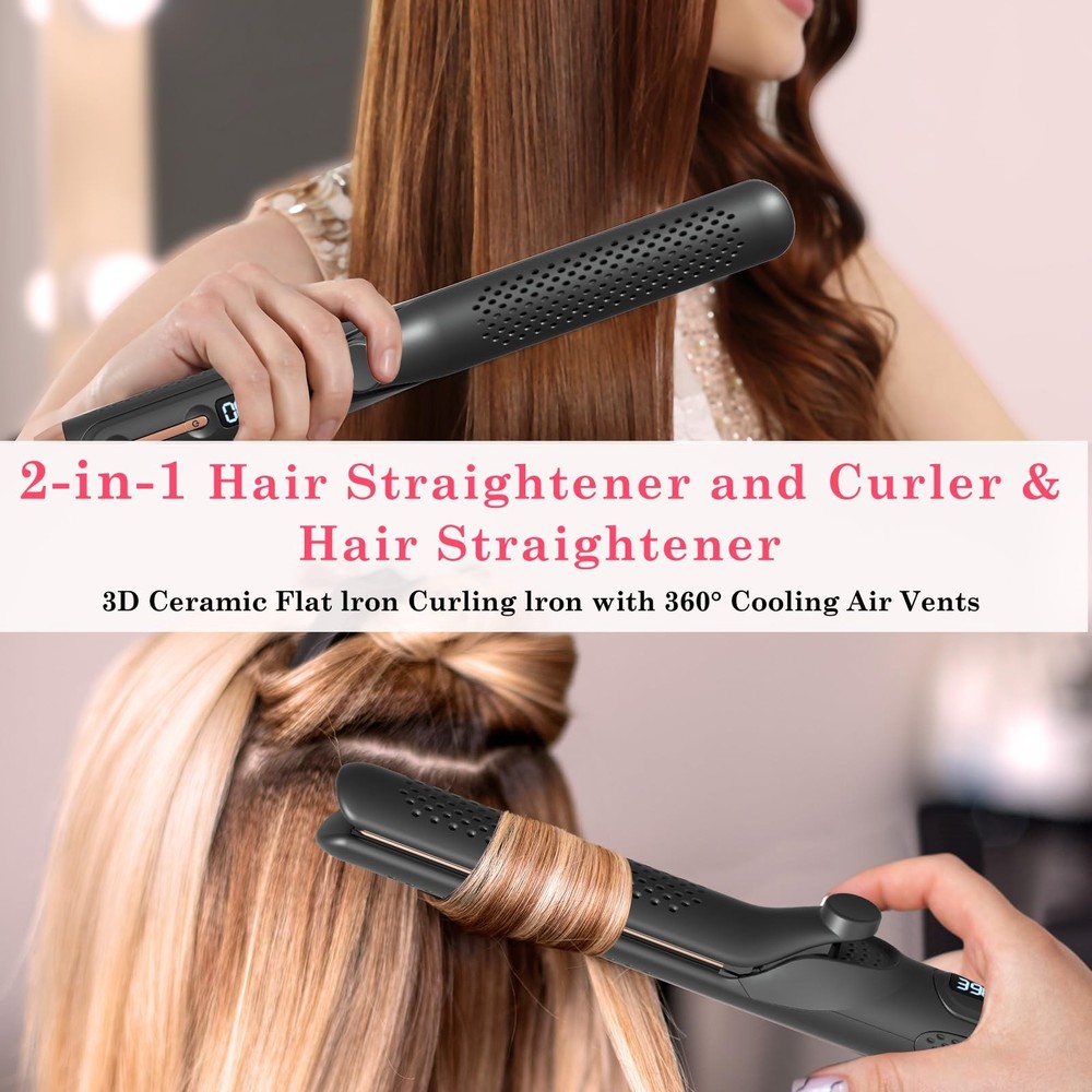 Are you a fan of versatile styling tools? We've delved into the market and identified the top two favorites – straighteners and curling irons. Now, we introduce a revolutionary 2-in-1 straightening and curling hair tool, equipped with negative ion technology that not only styles but also nourishes each strand, resulting in lustrous, bouncy curls. This tool allows you to straighten your hair effortlessly with its premium ceramic coating that glides smoothly without tugging. Alternatively, you can use it as a curling wand to create enchanting curls with visibly stunning results that will surely amaze you. Its compact yet elegant design ensures perfect curls every time. Innovation extends beyond aesthetics; it's embedded in practical functions, offering you a convenient solution that adds a touch of variety to your routine. Make styling simpler and elevate your daily life with this brilliantly designed tool. Innovative Airflow System: Unlocking the secret to lasting style, with 30,000 RPM airflow velocity and a comprehensive 360° cooling air circulation system. The air hole on the curling iron can evenly distribute air to shield your hair from thermal damage, 2-in-1 hair straightener and curler can give you a perfect sleek straightening or bouncy curls, more lasting and deliver instantly noticeable results. Negative Ion Hair Care: The waver curling wand with 20 million negative ions, combining styling and hair care functions, effortlessly creates lustrous and bouncy curls or straightens hair while reducing thermal damage from flat irons, gently nurturing every strand of your hair. Intelligent Temperature Control: 2-in-1 hair curling wand straightener utilizes advanced PTC heating technology, just 15 seconds to heat up. And automatic power-off function after 1 hour, ensuring safety while preventing unnecessary power consumption. Experience a safer, more efficient hair styling with humanized design. 5-Level Temperature Settings: By long-pressing to turn on, you can access temperature settings ranging from 285°F to 450°F. The hot tools curling iron use LED digital display to adjust temp. No need to worry about finding the right temperature, just explore and discover what suits you best! User-Friendly Design: Curling iron plate surface employs a special ceramic technology, no need to worry about pulling hair hurts or tangling, easily make straightening or curling. The thumb grip is designed for comfortable handling during styling. With a travel-friendly universal voltage range of 100-240V, and the 2-meter-long, 360-degree swivel cord provides both convenience and safety throughout your styling process.