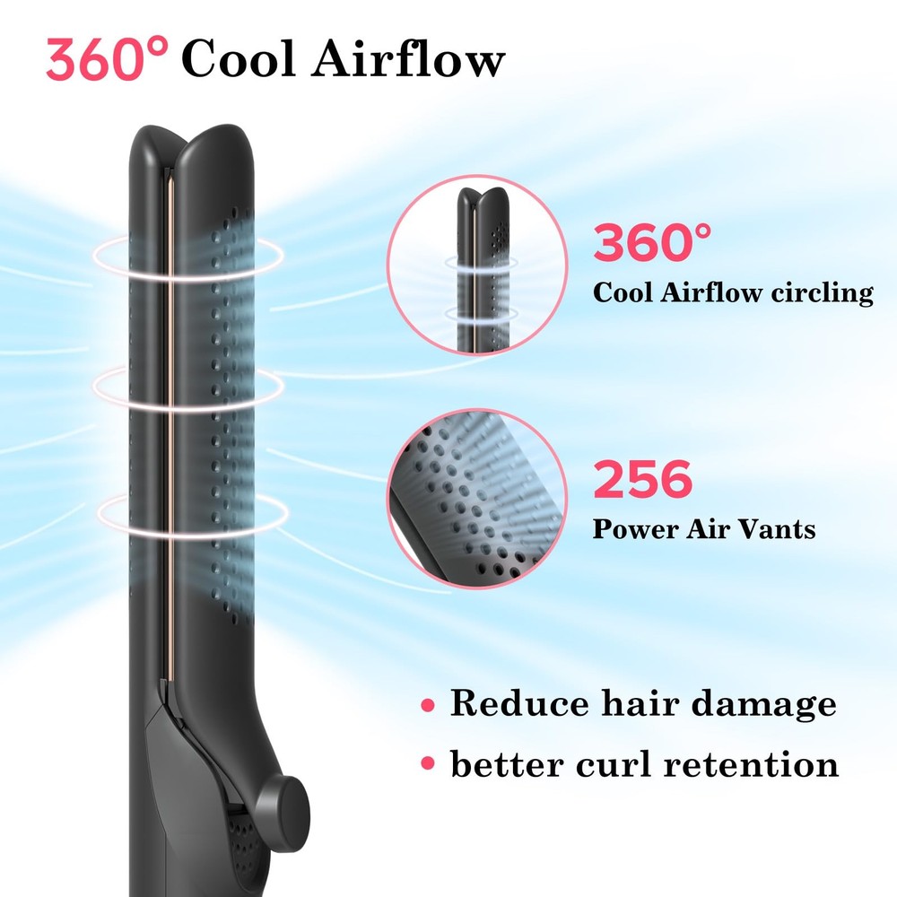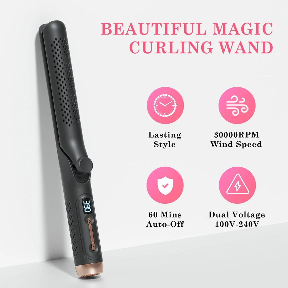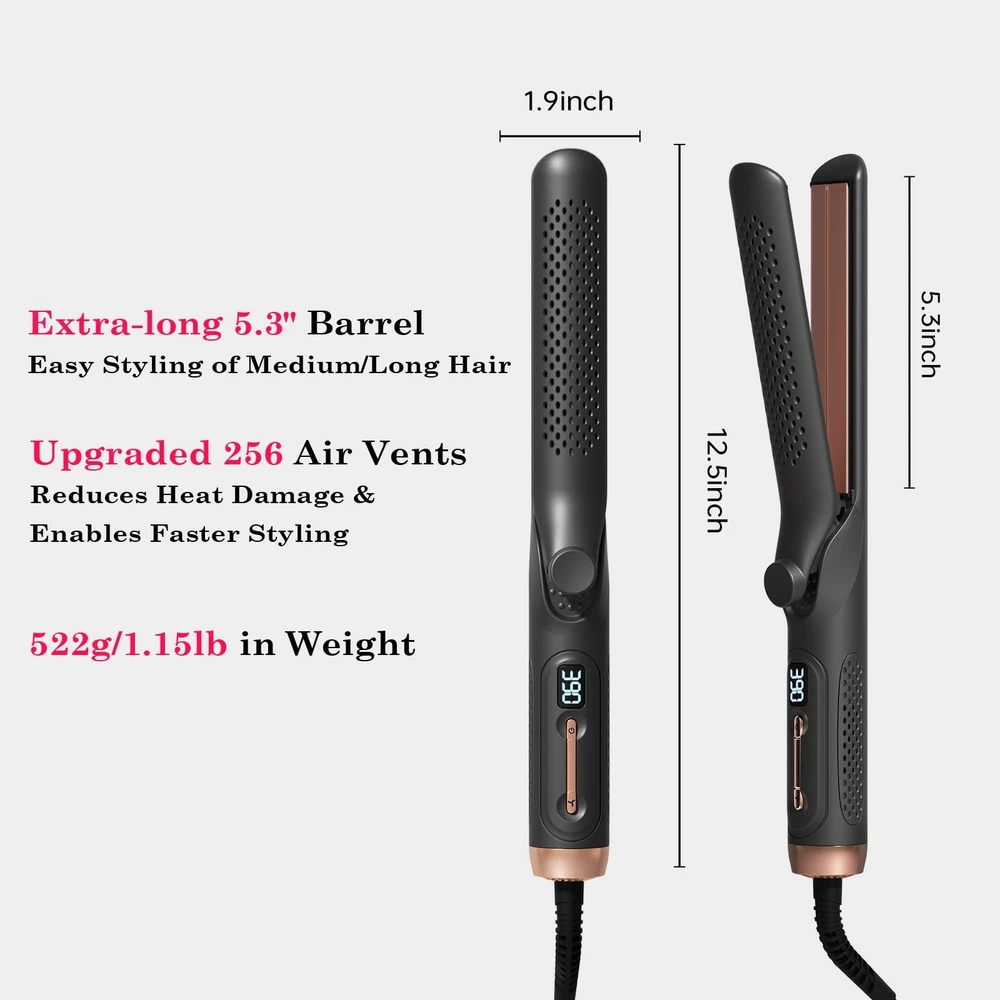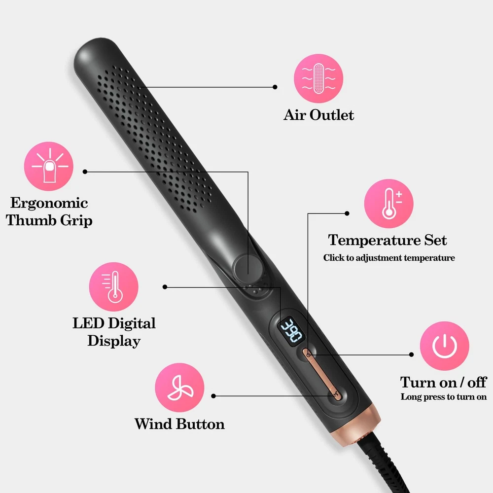 Are you a fan of versatile styling tools? We've delved into the market and identified the top two favorites – straighteners and curling irons. Now, we introduce a revolutionary 2-in-1 straightening and curling hair tool, equipped with negative ion technology that not only styles but also nourishes each strand, resulting in lustrous, bouncy curls. This tool allows you to straighten your hair effortlessly with its premium ceramic coating that glides smoothly without tugging. Alternatively, you can use it as a curling wand to create enchanting curls with visibly stunning results that will surely amaze you. Its compact yet elegant design ensures perfect curls every time. Innovation extends beyond aesthetics; it's embedded in practical functions, offering you a convenient solution that adds a touch of variety to your routine. Make styling simpler and elevate your daily life with this brilliantly designed tool. Innovative Airflow System: Unlocking the secret to lasting style, with 30,000 RPM airflow velocity and a comprehensive 360° cooling air circulation system. The air hole on the curling iron can evenly distribute air to shield your hair from thermal damage, 2-in-1 hair straightener and curler can give you a perfect sleek straightening or bouncy curls, more lasting and deliver instantly noticeable results. Negative Ion Hair Care: The waver curling wand with 20 million negative ions, combining styling and hair care functions, effortlessly creates lustrous and bouncy curls or straightens hair while reducing thermal damage from flat irons, gently nurturing every strand of your hair. Intelligent Temperature Control: 2-in-1 hair curling wand straightener utilizes advanced PTC heating technology, just 15 seconds to heat up. And automatic power-off function after 1 hour, ensuring safety while preventing unnecessary power consumption. Experience a safer, more efficient hair styling with humanized design. 5-Level Temperature Settings: By long-pressing to turn on, you can access temperature settings ranging from 285°F to 450°F. The hot tools curling iron use LED digital display to adjust temp. No need to worry about finding the right temperature, just explore and discover what suits you best! User-Friendly Design: Curling iron plate surface employs a special ceramic technology, no need to worry about pulling hair hurts or tangling, easily make straightening or curling. The thumb grip is designed for comfortable handling during styling. With a travel-friendly universal voltage range of 100-240V, and the 2-meter-long, 360-degree swivel cord provides both convenience and safety throughout your styling process.
