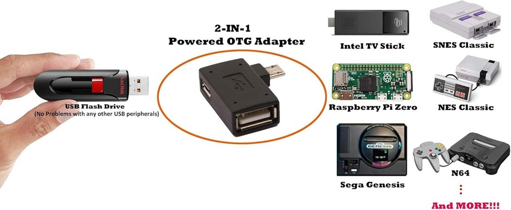 2-in-1 Powered Micro USB to USB OTG Adapter 90 Degree Right Angled for FireStick, S/NES Classic Mini, Sega Genesis and More - 2 Pack π Specially designed for adding any USB peripherals to your host devices, Suitable for Android, Windows and other systems, no system restrictions. π Expansion Capability - Add on any USB peripherals such as keyboards, mouse, flash drives, external hard drives, USB card readers, USB ethernet adapter, game controllers or whatever to your Host devices with the 2-in-1 OTG Adapter. π Provide power for USB peripherals so that the battery of your android smart or tablet will not be drained so quickly like others ordinary OTG cable. Note: It can not power your android smart or tablet itself. π Plug and play - Simply connect the micro USB male port to your host devices and the micro USB female port to your usb power cable, then it is ready to go. Set it up in minutes without any extra effort or configuration. π 24/7 customer service, add to cart & get 2-in-1 Micro USB OTG Adapter Now! NOTE: Please make sure that your devices support OTG function before you place an order! 2-in-1 Powered OTG Adapter provides an all-new solution for your host devices to connecting any USB peripherals such as keyboards, mouse, flash drives, external hard drives, HDD, SSD, USB card readers, USB ethernet adapter, game controllers or whatever to enjoy more fun. Suitable for Android, Windows and other systems, no system restrictions. Matters Need Attention: It can NOT charge any or does NOT work with PlayStation Classic or Roku devices. So why we still have to choose ? Because the can not only support OTG function for your Android Smart or Tablet, But also it can provide power for any USB peripheral devices which attached to your Android devices so that the battery of your Android devices will not be drained so quickly when compared to others ordinary OTG cable. Besides, we can also connect HDD, SSD to our android or tablet now with the powered OTG adapter. WHAT'S MORE, the can provide both Power and OTG simultaneously for your Streaming TV Stick, Chromecast, Raspberry Pi Zero, Sega Genesis Mini, S/NES Classic Mini, Google home mini. Package Included: 2 x Right Angled OTG Adapter