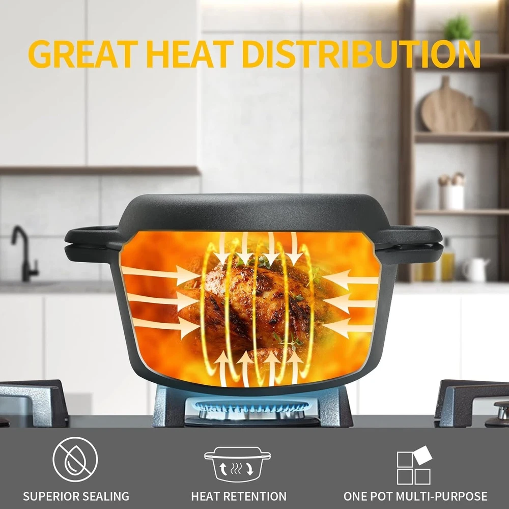 Pre-seasoned 2-in-1 cast iron dutch oven: The 2-In-1 cast iron dutch oven pot with skillet lid has been burned with vegetable oil,(no synthetic coatings or chemicals). The shallow skillet that can be used as a lid Integrated sturdy loop handles making cooking convenient: Cast iron skillet set come with two integrated helper handles on each pot and skillet to help you transport your family recipes smoothly and safely to the dinner table Many of cooking styles: Cast iron dutch oven with lid can meet all your cooking styles, from soups to stews; baking; roasting; frying; grilling; broiling; braising; sautéing meats; vegetables and more Easy to care: Clean by hand washing in warm water. Dried thoroughly on the stove at medium heat and seasoned with natural oils. A super-thin coat is all you need. Wipe off excess oil with a cloth or paper towel Heat transfer: Our dutch oven is made of cast iron. Good heat transfer and the special surface structure of cast iron allow heat to be stored and transferred efficiently