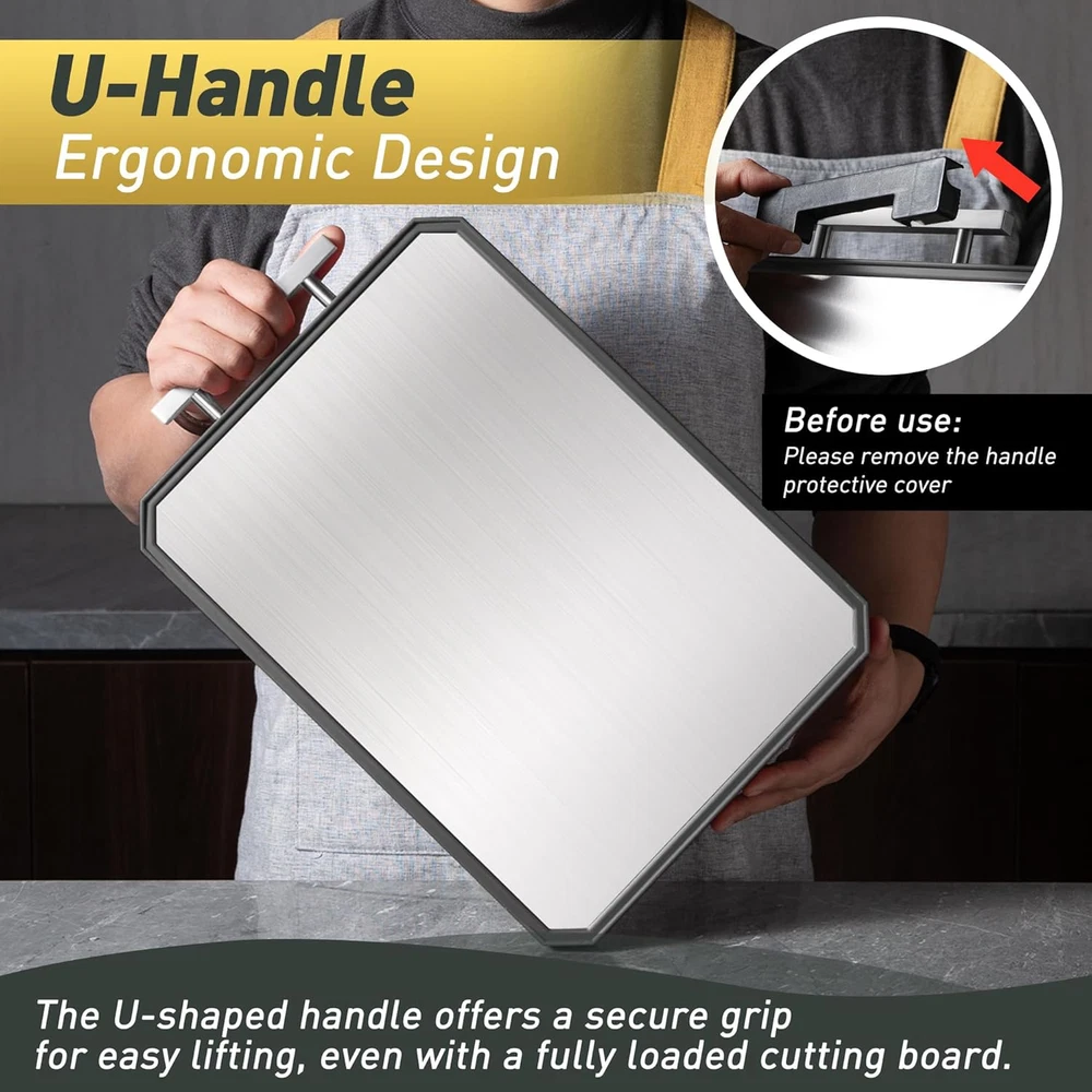 Dual-Sided Cutting for Versatile Use:The Socisen cutting boards for kitchen features a stainless steel side for slicing meats and a PP side for fruits and vegetables. This dual-sided design ensures food safety and versatility, letting you handle different ingredients efficiently. Perfect for everyday cooking, this cutting board providing a durable and practical cutting solution for your kitchen needs. Good Design:The unique U-shaped handle, combining sleek aesthetics with ergonomic design, offers a comfortable and secure grip, making it easy to carry around the kitchen or take along for outdoor cooking. The built - in juice groove is a practical addition, efficiently catching the juices from meats, fruits, and vegetables, thus keeping your kitchen countertops clean. Complemented by non - slip mats on all four sides, the cutting board ensures stability during use. Durable & Food-Safe Materials: The Socisen cutting board features 304 stainless steel on one side and food-grade PP on the other, ensuring durability and safety. This dual-sided cutting board is BPA-free, making it safe for direct food contact. Perfect for slicing meats or chopping fruits and vegetables, its sturdy construction resists wear and tear, providing a reliable, long-lasting solution for all your kitchen tasks. Easy to Clean & Dishwasher Safe:The Socisen stainless steel cutting board is designed with non-stick surfaces, allowing for easy cleaning by simply rinsing with water and wiping dry. The cutting board is also dishwasher safe. We suggest using Quick Wash, Gentle Wash, or Normal Wash cycles for optimal results. Our cutting board's easy - clean features make it a great kitchen essential. Ideal Gift for Any Occasion: With its stylish design and elegant packaging, the Socisen stainless steel cutting boards for kitchen makes a thoughtful gift for Thanksgiving Day, Christmas, Mother's Day, Father's Day, birthday, anniversary, or housewarming event.And this cutting board can be used in the office or camping. Its versatile functionality and durable build appeal to anyone who loves cooking. Whether for a professional chef or a home cook, it’s a practical gift they’ll use every day. Product Description The video showcases the product in use. The video guides you through product setup. The video compares multiple products. The video shows the product being unpacked. Socisen Double-sided Cutting Board Merchant Video 1 Grip Handle 2 Hygienic Design 3 Non-Slip Design 4 Deep Juice Groove 5 Easy to Clean What materials are used in this stainless steel cutting board? Are they safe for food preparation? The non toxic cutting board features a dual-sided design: one side is made of food-grade 304 stainless steel, and the other side is crafted from wheat straw polypropylene (PP). How should I properly use each side of the double-sided cutting board? The stainless steel side is great for meats and easy to clean. The wheat straw side is ideal for fruits and veggies, and features a juice groove to help reduce mess on your countertop. Does the cutting board have features to prevent slipping during use? Yes, the 2 sided cutting boards for kitchen is designed with anti-slip rubber-wrapped edges and bottom, reducing noise and ensuring stability during use. This feature helps prevent the board from moving on the countertop while cutting. Can the stainless steel side be used as a defrosting tray? Yes, the 304 stainless steel side has good thermal conductivity, allowing it to function effectively as a defrosting tray for frozen foods, facilitating quicker thawing. Can I use this board for serving food as well? Absolutely! Its sleek, modern design and dual textures make it suitable for light serving — such as placing bread, cheese, or fruit. Just be sure to wash thoroughly between uses if switching between raw prep and serving. Socisen OTHER PRODUCTS! Add to Cart Add to Cart Add to Cart Add to Cart Add to Cart Add to Cart Add to Cart Customer Reviews 4.4 out of 5 stars 53 4.4 out of 5 stars 53 4.4 out of 5 stars 53 4.4 out of 5 stars 53 4.7 out of 5 stars 146 4.7 out of 5 stars 146 4.7 out of 5 stars 146 Price $18.99 $ 18 . 99 $28.49 $ 28 . 49 $29.99 $ 29 . 99 $28.49 $ 28 . 49 $23.99 $ 23 . 99 $35.99 $ 35 . 99 $45.99 $ 45 . 99 Quantity 1 1 1 1 1 1 2 Size 16.2"L x 11"W 16.2"L x 11"W 16.2"L x 11"W 16.2"L x 11"W 16"L x 11"W 16"L x 11"W 16"L x 11"W+18"L x 12"W Food Grade ✔ ✔ ✔ ✔ ✔ ✔ ✔ Easy to Clean ✔ ✔ ✔ ✔ ✔ ✔ ✔ Multiple Options ✔ ✔ ✔ ✔ ✔ ✔ ✔