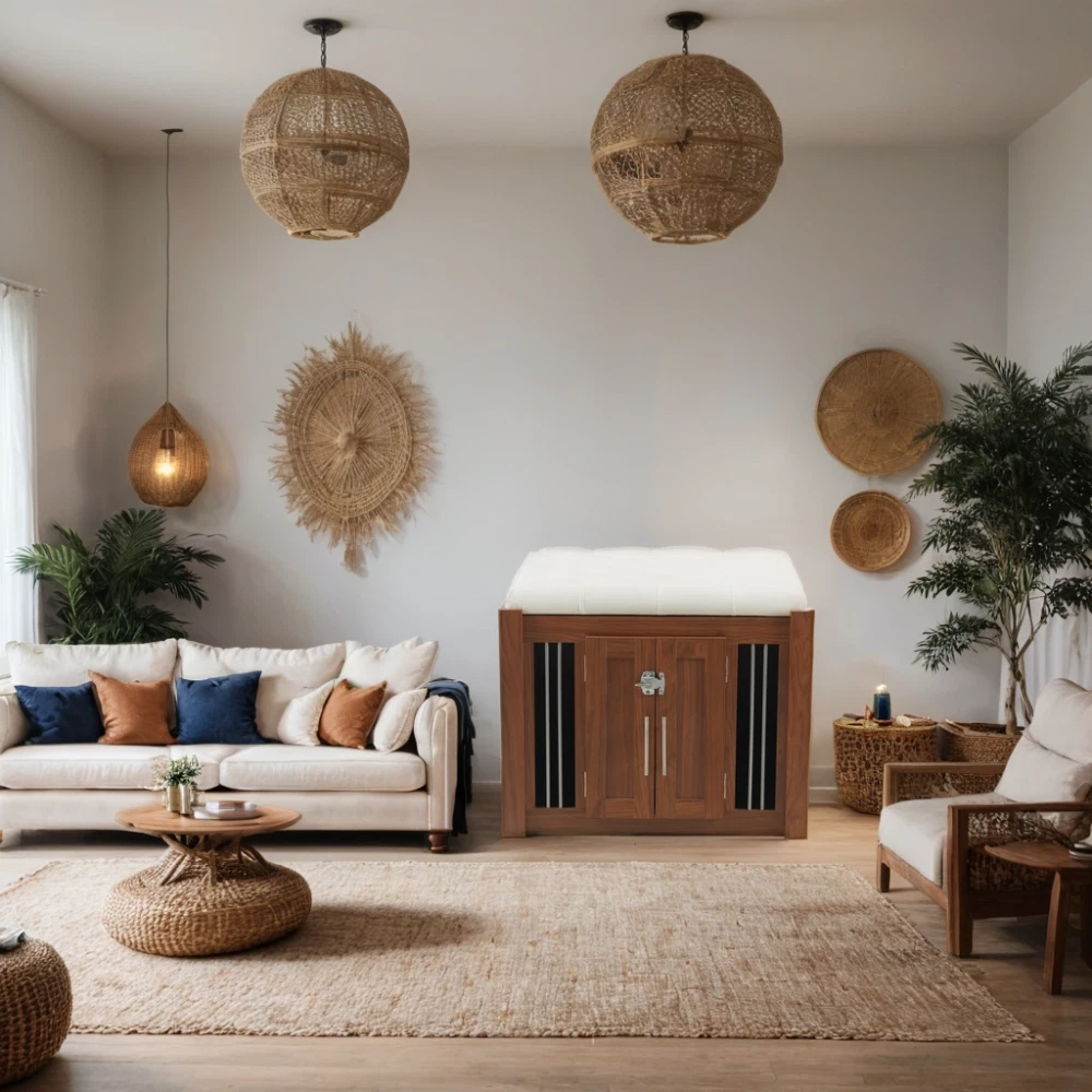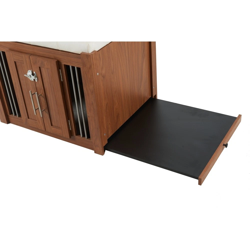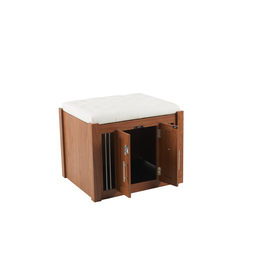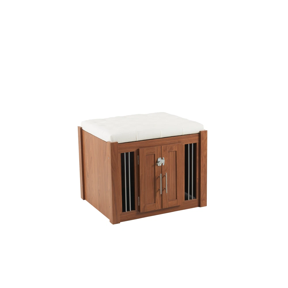 MULTI-USAGE AND VINTAGE DESIGN: Our multi-functional dog crate end-bench combines elegance and practicality. This unique piece of furniture doubles as a comfortable seating area and a secure pet space, effectively utilizing your living area. COMFY AND ROBUST SEATING: This wooden dog ottoman comes equipped with a high quality easy clean cushion, offering a comfortable seating option. Whether you're taking a break or putting on your shoes, this sturdy structure can handle up to 300 lbs, promising durability. DURABLE METAL AND DESIGNED LOCKER: This Pet Friendly ottoman features specially designed style buckles and sturdy, durable metal components that make it easy and safe for both you and your pet to use. MOVABLE BASE WITH WHEELS: This product is equipped with a movable base featuring wheels, providing convenient functionality and making it easier to clean and maintain. ROOMY AND SAFE: The bench dog ottoman measures 30.25"L x 25.1"W x 25"H, providing ample internal space of 28.9"L x 22.6"W, suitable for small to medium dogs. It features a designed sturdy vintage door with black metal locks and handles, ensuring easy access and safety for your pet. The steel bars offer excellent ventilation and visibility, making a comfy space for your pet. EASY UPKEEP: This dog crate bench design prioritizes your convenience. With a removable cushion and easily accessible doors, cleaning and maintenance are effortless, promoting a clean living space for your pet. MORE APPLICATIONS: May in various home space, as a organizer, decor piece, storage solution, it is very stylish and cozy. EFFORTLESS ASSEMBLY: We strive to make assembly as smooth as possible. Detailed instructions and essential hardware are provided for an easy assembly journey. DETAIL&CARE Product Dimensions 30.25”L x 25.1”W x 25”H, 64.46 LBS Package Size 34”L x 27.5”W x 9”H, 68.45 LBS Material Particle Board+MDF Style Mid-Century Modern Color Walnut Indoor Outdoor Usage Indoor Country of Origin CHINA About Finish Liquids should be immediately blotted with a damp cloth. Do not use surface cleaners that could remove the finish. About Hardware Hardware may loosen over time; periodically check to make sure all connections are tight. About Color Real Product's Color may be a little different from the image due to the different lighting or monitor's display. MORE APPLICATIONS May in various home space, as a organizer, decor piece, storage solution, it is very stylish and cozy. COMFY AND ROBUST SEATING This wooden dog ottoman comes equipped with a high quality easy clean cushion, offering a comfortable seating option. Whether you're taking a break or putting on your shoes, this sturdy structure can handle up to 300 lbs, promising durability. DURABLE METAL AND DESIGNED LOCKER This Pet Friendly ottoman features specially designed style buckles and sturdy, durable metal components that make it easy and safe for both you and your pet to use. MOVABLE BASE WITH WHEELS This product is equipped with a movable base featuring wheels, providing convenient functionality and making it easier to clean and maintain.