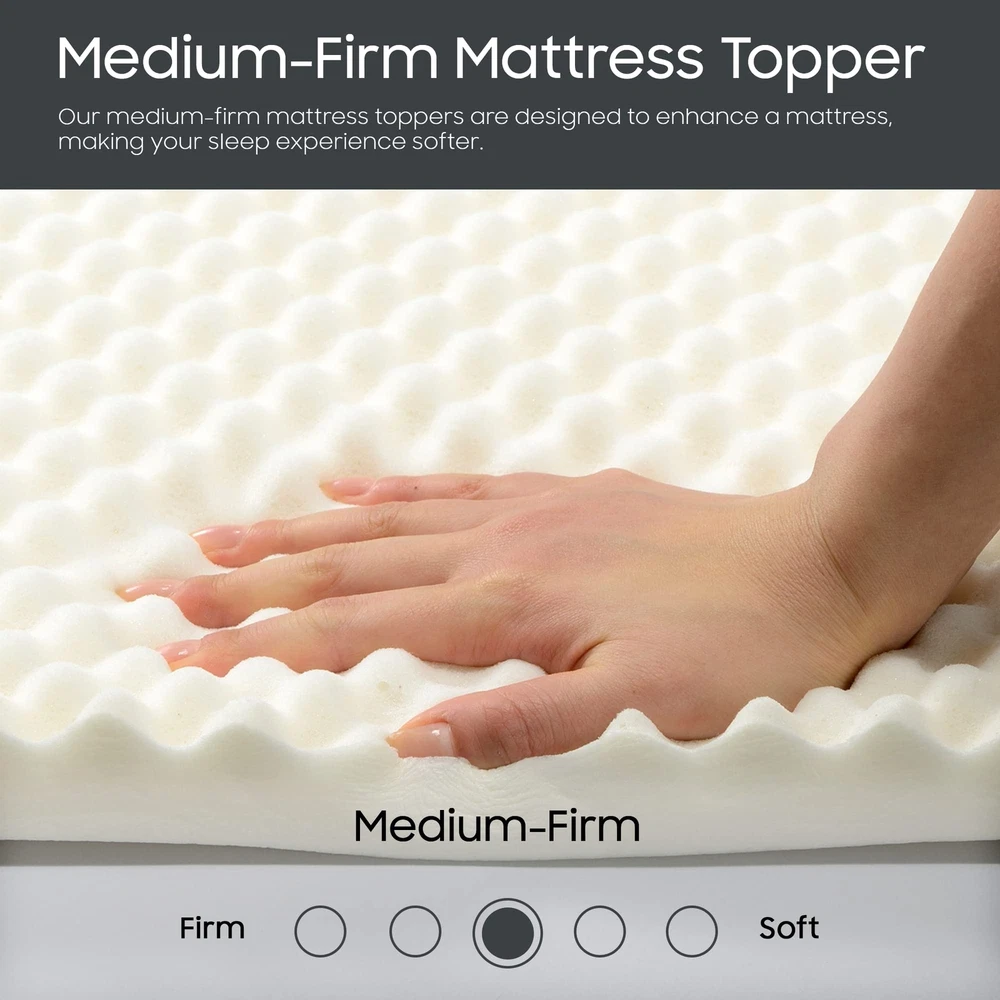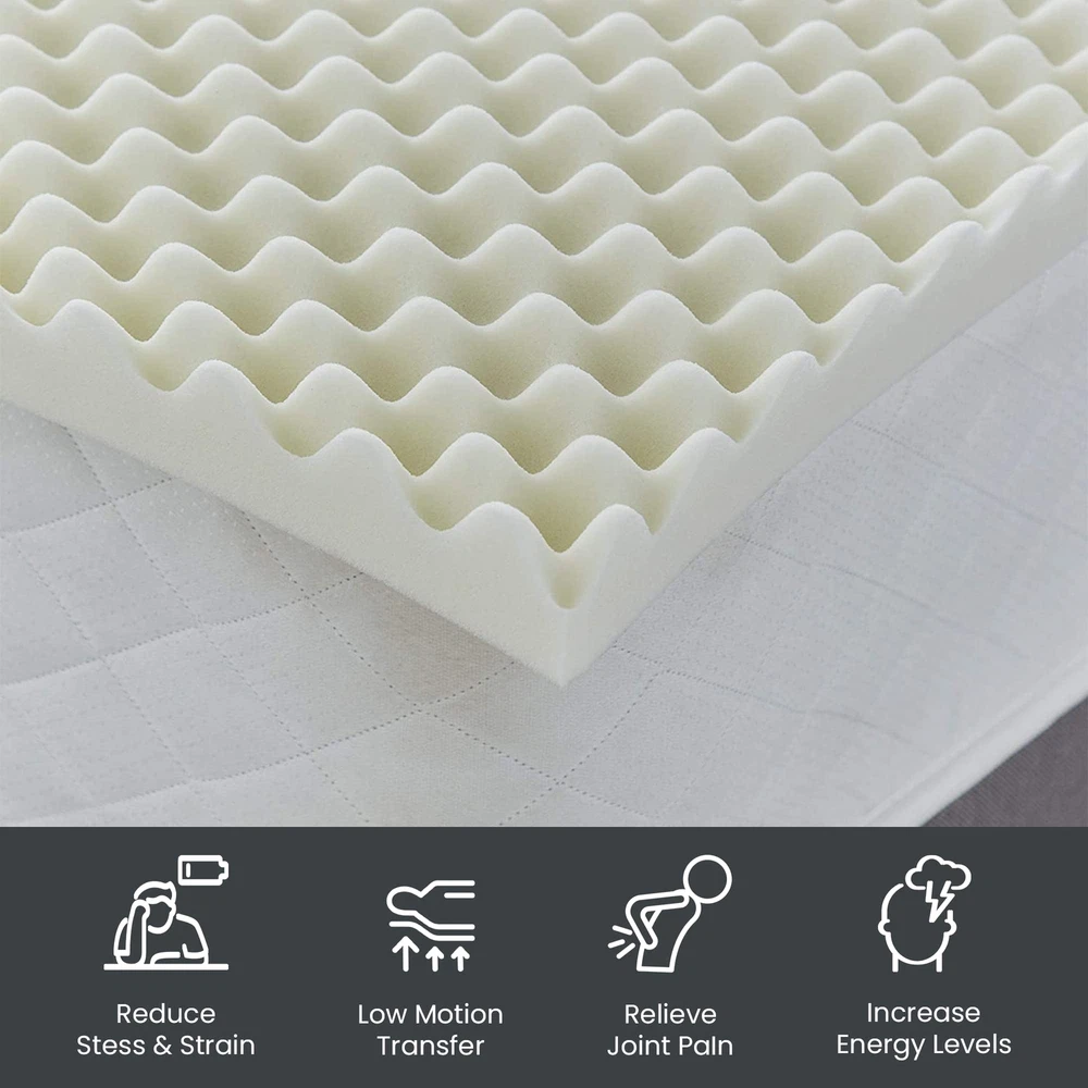The premium foam adds luxurious softness while not taking away from the support of the mattress. These bed toppers have been effective in enhancing the comfort level of new and old mattresses alike, providing a better sleep experience for most people. This Convoluted Egg Shell Breathable Foam Topper is made from good quality foam that gently cradles you in individualized comfort and support. It also provides you with pressure-relieving cushioning in the hip and shoulder areas while still supplying enough support, so the body doesn't get imbalanced. These unique mattress toppers are to be used on top of your mattress for additional comfort. This prevents your body from sinking and curling while sleeping and promotes a better posture, which reduces and strain on your spine and increases energy levels during the day. Our premium-level mattresses are here to help you get the best possible comfort at all times when you sleep or lie down to relax. Pressure : The convoluted design of the foam helps to distribute weight evenly, which can help reduce pressure points on the body. This can be particularly helpful for people who suffer from joint pain or other conditions that make it difficult to get comfortable in bed. Increased comfort: The convoluted design can also make the mattress topper feel softer and more comfortable, which can lead to a more restful night's sleep. CertiPUR-US certified foam: Rest easy knowing that the topper's foams are CertiPUR-US certified, meeting stringent standards for durability, performance, and content. Quality you can trust. Motion isolation: The convoluted foam design can help to absorb movement, which can be helpful for people who share a bed with a partner. This can prevent motion from transferring across the bed and disturbing the other person's sleep. Versatility: Convolute foam mattress toppers are making them versatile and suitable for use with different types of mattresses. Toppers can be used on a variety of surfaces, such as futons or camping cots, to provide extra cushioning and comfort.