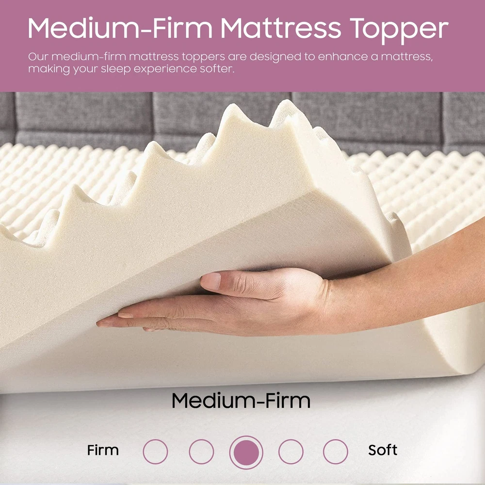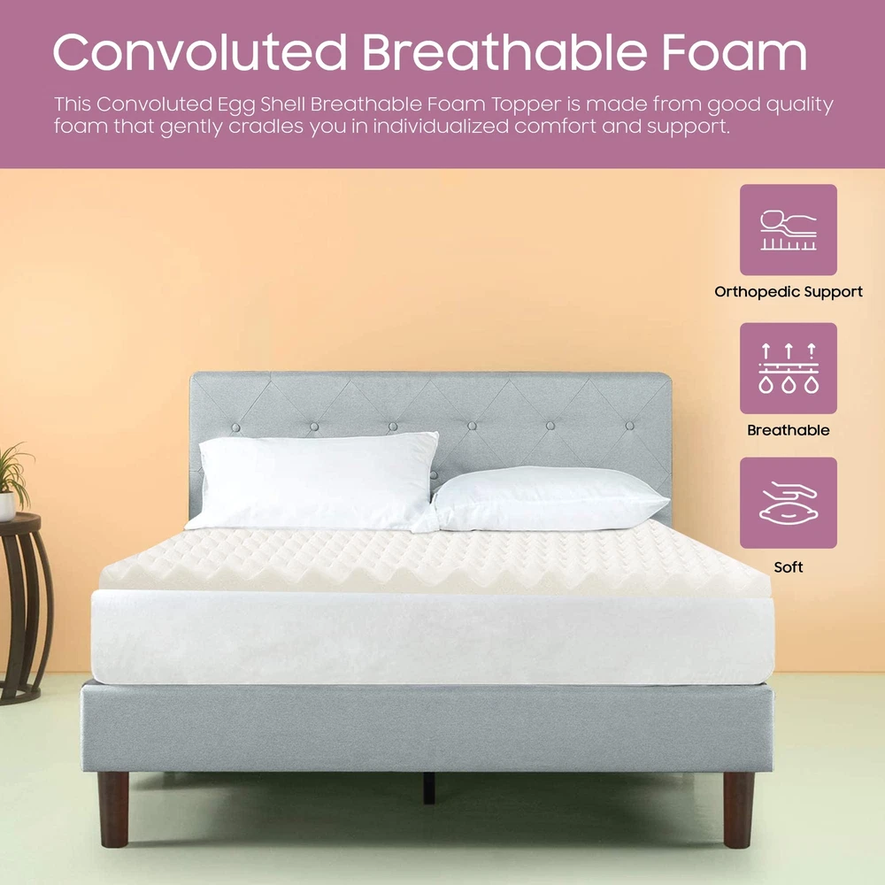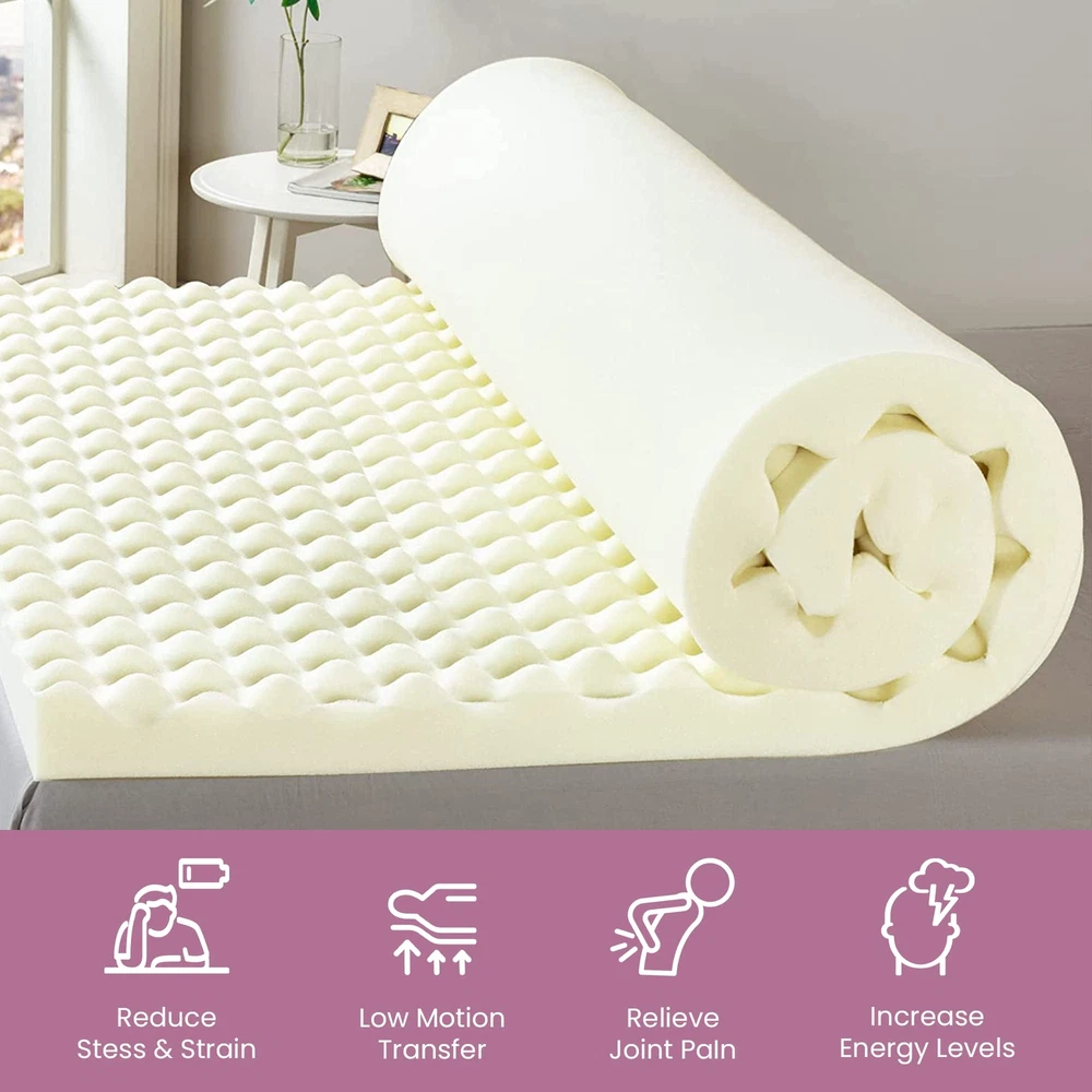The premium foam adds luxurious softness while not taking away from the support of the mattress. These bed toppers have been effective in enhancing the comfort level of new and old mattresses alike, providing a better sleep experience for most people. This Convoluted Egg Shell Breathable Foam Topper is made from good quality foam that gently cradles you in individualized comfort and support. It also provides you with pressure-relieving cushioning in the hip and shoulder areas while still supplying enough support, so the body doesn't get imbalanced. These unique mattress toppers are to be used on top of your mattress for additional comfort. This prevents your body from sinking and curling while sleeping and promotes a better posture, which reduces and strain on your spine and increases energy levels during the day. Our premium-level mattresses are here to help you get the best possible comfort at all times when you sleep or lie down to relax. Pressure : The convoluted design of the foam helps to distribute weight evenly, which can help reduce pressure points on the body. This can be particularly helpful for people who suffer from joint pain or other conditions that make it difficult to get comfortable in bed. Increased comfort: The convoluted design can also make the mattress topper feel softer and more comfortable, which can lead to a more restful night's sleep. CertiPUR-US certified foam: Rest easy knowing that the topper's foams are CertiPUR-US certified, meeting stringent standards for durability, performance, and content. Quality you can trust. Motion isolation: The convoluted foam design can help to absorb movement, which can be helpful for people who share a bed with a partner. This can prevent motion from transferring across the bed and disturbing the other person's sleep. Versatility: Convolute foam mattress toppers are making them versatile and suitable for use with different types of mattresses. Toppers can be used on a variety of surfaces, such as futons or camping cots, to provide extra cushioning and comfort.