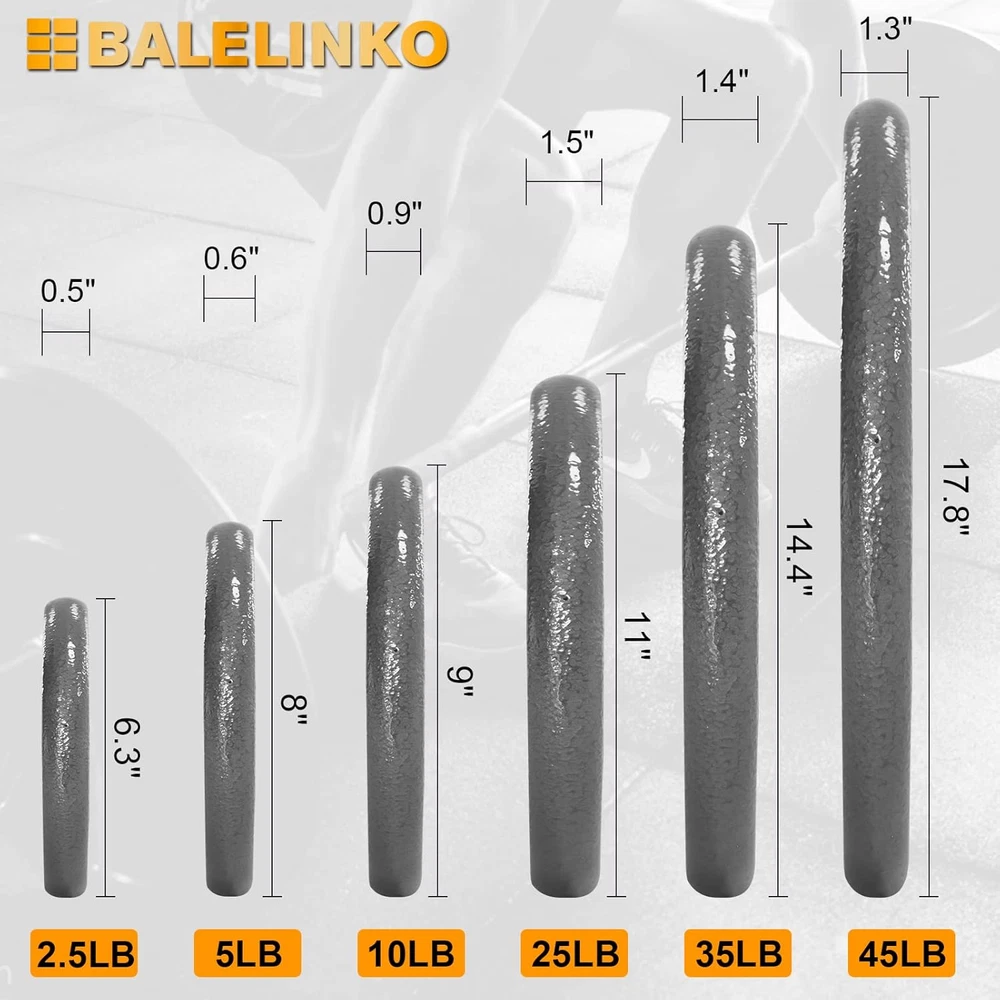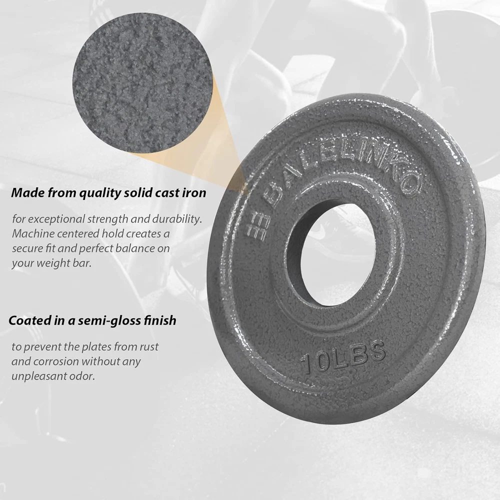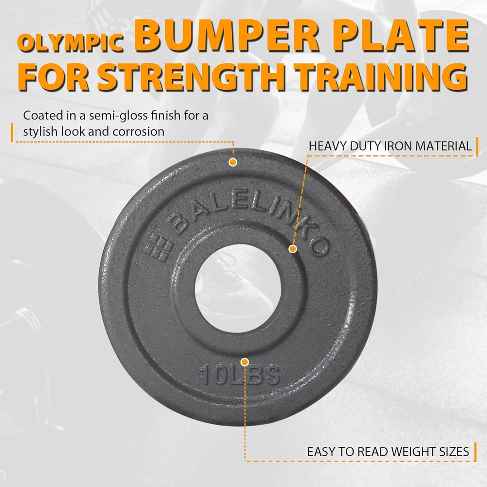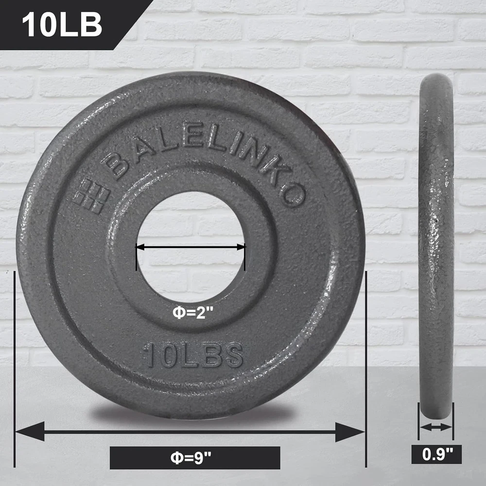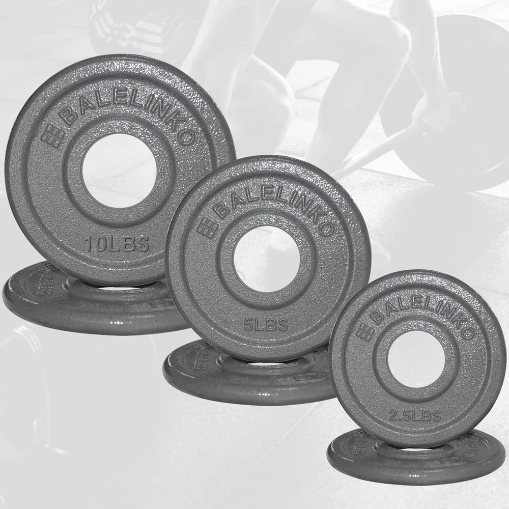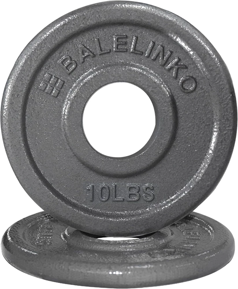 Set of 2 Cast Iron Grip Weight Plates (Each 10 lbs, Total 20 lbs): Crafted from solid cast iron with a baked enamel finish, these grip weight plates are designed to endure regular use and enhance durability. They fit snugly onto any Olympic bar with a diameter of 2" or less and can also be used with 2" dumbbell bars. Provide a secure hold and a variety of Strength Training Exercises: These weight plates , enable a wide range of strength training exercises, whether with or without a barbell. Regular use can lead to increased muscle strength, making them a valuable addition to both home and professional gyms. Stylish Design : These weight plates not only perform well but also have a stylish appearance. The weight plates are clearly labeled in pounds for easy identification. Versatile Weight Selection: Choose from a variety of weight options with Balelinko's cast iron 2-inch grip weight plates, available in 2.5, 5, 10, 25, 35, and 45 lb weights. Quality Assurance: Balelinko stands by the quality of their Grip Plates. We offer a one-year guarantee against defects in workmanship and materials under normal residential use and conditions. Please note that cosmetic damage is not covered by the guarantee. Product Description Balelinko 2" Olympic Grip Plate Sold as pair - 2.5 Pounds, 5 Pounds, 10 Pounds Made of solid cast iron with baked enamel finish to withstand regular use and improve durability. Fits any Olympic bar with diameter 2" or less, can be used with 2" dumbbell bars too. Balelinko Olympic 2-Inch Grip weight plates are perfect for building a strong figure,can be used to perform muscle strengthening exercises. Long-lasting quality is what you can expect from Balelinko,making our products an excellent addition to any gym. Features 2" inner ring diameter Cast iron plates Can choose different weights Long in service life Improve strength training Quality Structure Made of high quality cast iron with a durable, baked enamel finish. Weight Selection Choose preferred weight from 2.5 lbs, 5 lbs, 10 lbs, 25 lbs, 35 lbs, 45 lbs. Identifiable Labeled in LB for easy recognition. 2-inch Inner Ring With 2-inch center, Plates fit any Olympic bar with diameter 2” or less. Versatility The Olympic Grip weight plates are not only be used with a barbell, but also great for single bumper plate workouts,can help you make an effective workout. Increase Strength Balelinko weight plates can build muscle and increase your strength with different action training. Such as Over head lunge, Clean and Jerk, bench press, Squat, push-ups.