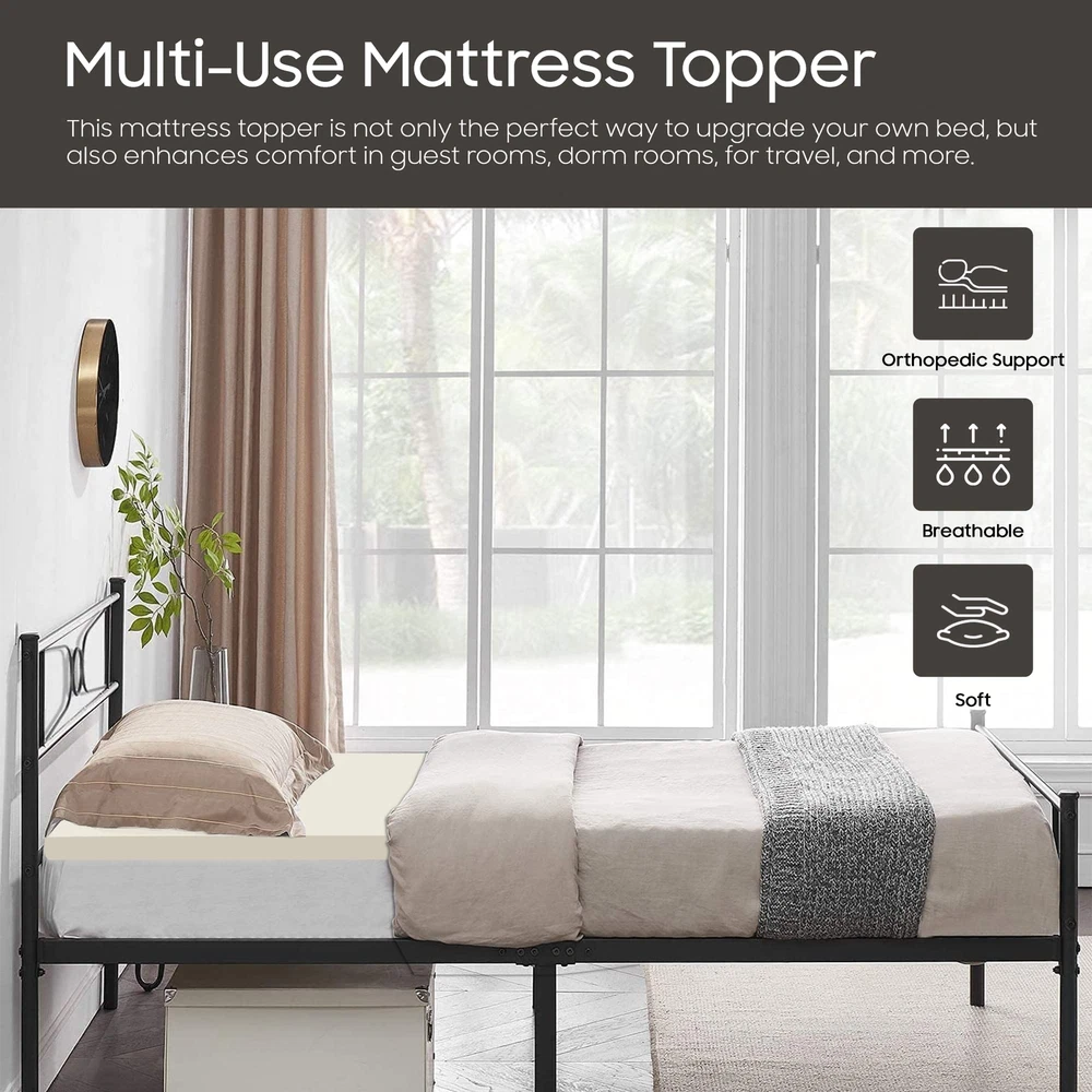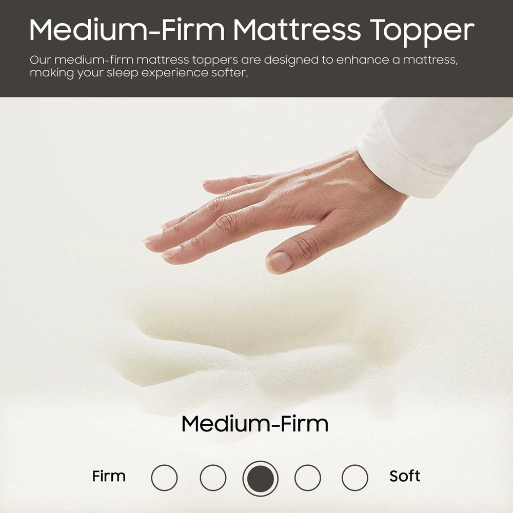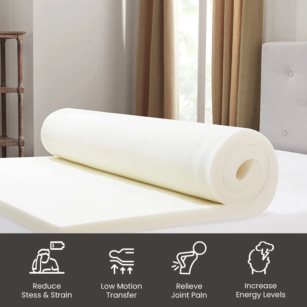 The premium foam adds luxurious softness while not taking away from the support of the mattress. These bed toppers have been effective in enhancing the comfort level of new and old mattresses alike, providing a better sleep experience for most people. This Breathable Foam Topper is made from good quality foam that gently cradles you in individualized comfort and support. It also provides you with pressure-relieving cushioning in the hip and shoulder areas while still supplying enough support, so the body doesn't get imbalanced. These unique mattress toppers are to be used on top of your mattress for additional comfort. This prevents your body from sinking and curling while sleeping and promotes a better posture, which reduces and strain on your spine and increases energy levels during the day. Our premium-level mattresses are here to help you get the best possible comfort at all times when you sleep or lie down to relax. Comfort: A mattress topper can add an extra layer of comfort to your mattress, making it feel softer and more luxurious. This can be especially beneficial if you have a firm or uncomfortable mattress. Support: Toppers can provide additional support to your body while you sleep. This can help alleviate pain and pressure points and promote better alignment of your spine. CertiPUR-US certified foam: Rest easy knowing that the topper's foams are CertiPUR-US certified, meeting stringent standards for durability, performance, and content. Quality you can trust. Temperature regulation: Mattress toppers are designed to regulate temperature and keep you cool during the night. This can be especially beneficial if you tend to overheat while you sleep. Cost-effective: If you're not ready to invest in a new mattress, a mattress topper can be a cost-effective solution to improve your sleep experience. It's also easier to replace a topper than a mattress, which can be a more affordable option in the long run.