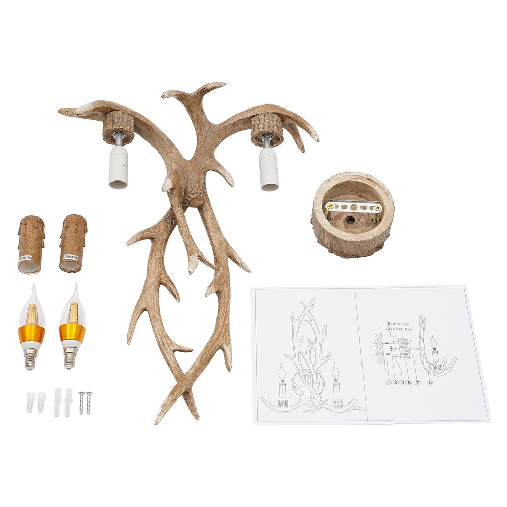 Specifications Material: Resin, Iron Color: Brown Style: Retro Process: Painting, Hand Coloring Efficiency: E Shape: Antler Mount Type: Wall Mount Assembly Required: Yes Indoor/Outdoor Usage: Indoor Light Fixture Form: Wall Light Light Source: 2* 5W E14 Bulbs(Included) Light Color: Warm Control Method: Wall Switch(Not Included) Luminous Flux: 300-400LM Voltage: 110V Maximum Suitable Bulb Power: 40W Applicable Area: 3-5m²/32.29-53.82ft² Product Size: 38*50cm/14.9*19.7in Gross Weight: 4.12kg/9.08lbs Net Weight: 3.83kg/8.44lbs Package Size: 54*44*21cm/21.26*17.32*8.27in Package Included 1* Antler Wall Lamp 2* E14 Bulbs 1* English Manual Other Accessories for Assembly 2-light Antler Wall Light Fixture Indoor Farmhouse Wall Sconce Wall Lamp Description Description This antler wall lamp uses high-quality LED light sources to ensure a soft light, which can be used as ambient lighting to create a quiet and peaceful night, but also can provide enough light for reading or working when needed, combining practicality and artistry. Put it in the living room, bedroom, or study, which not only can enhance the overall style of the space, but also awaken people to the natural beauty of the infinite desire, so that every corner of the home is filled with a warm and elegant atmosphere. Key Features Sturdy and Durable: This product is made of high-quality resin and iron with painting and hand-coloring processes, which are corrosion resistance, and wear resistance, and can be used for a long time without frequent replacement. Comfortable Bedtime : Turn on this wall lamp at night when you come home from a hard day's work. A bright and soft light can fill your heart with warmth and emotion, making your monotonous life and room more vivid, and enhancing your sense of happiness in life. Beautiful Lighting Effect: The LED wall lamp can produce bright warm light, making a beautiful lighting effect and creating a relaxing atmosphere in your living room. Excellent Light Source: The environment-friendly and energy-saving LED light can effectively avoid glare and stroboscopic, protect your eyes, restore the most authentic color of objects, extend longer service life, and save your costs. Elegant Appearan ce: Its appearance is inspired by the mysterious deer from the forest, integrating the beauty of nature into the modern living space, interpreting a kind of transcendent ethereal beauty that can blend with most home styles. Exquisite Gift: Thanks to its exquisite design, unique appearance, and great lighting effect, you can give it as a gift to your friends, lovers, and colleagues on Christmas, Thanksgiving, Valentine's Day, family gatherings, or other special occasions. Easy Maintenance: A simple construction and smooth surface make this product easy to clean, and you just need a soft cloth to remove dust and residue. Protective Package: To prevent the product from being damaged during transportation, we packed it with foam to protect your products to the maximum extent possible. Good Customer Service: We stand behind all our guests and look forward to assisting you with your purchase. It is our pleasure to answer your confusion and questions. The end of the story between us is not "we sell and you buy". Details Rounded Corners : They can protect your hands from being scratched during installation and use and also enhance the aesthetics of the product. Sturdy Base: The round base increases stress area and makes the wall lamp fixed firmly on the wall without easily falling. Application With an application area of 32.29-53.82ft², it is suitable for front doors, bedrooms, living rooms, dining rooms, study rooms, kid's rooms, offices, cafes, restaurants, hotels, etc. Specifications Material: Resin, Iron Color: Brown Style: Retro Process: Painting, Hand Coloring Efficiency: E Shape: Antler Mount Type: Wall Mount Assembly Required: Yes Indoor/Outdoor Usage: Indoor Light Fixture Form: Wall Light Light Source: 2* 5W E14 Bulbs(Included) Light Color: Warm Control Method: Wall Switch(Not Included) Luminous Flux: 300-400LM Voltage: 110V Maximum Suitable Bulb Power: 40W Applicable Area: 3-5m²/32.29-53.82ft² Product Size: 38*50cm/14.9*19.7in Gross Weight: 4.12kg/9.08lbs Net Weight: 3.83kg/8.44lbs Package Size: 54*44*21cm/21.26*17.32*8.27in Package Included 1* Antler Wall Lamp 2* E14 Bulbs 1* English Manual Other Accessories for Assembly Notes Please check the product size before ordering to make sure it fits your home. Please use the lamp within the applicable voltage range and clean it regularly. Please cut off the power supply when you clean the light. Please make sure that the power supply has been cut off before installation, and conduct a power test before installation. Please wear gloves (not included) when installing the lamp, otherwise, fingerprints will be left on the lamp, which will easily cause dust accumulation and affect the brightness and beauty of the lamp. Please do not install the light next to hot objects such as a fireplace, exhaust pipe, or in unstable places to avoid damage. Please allow the slight color difference caused by the shooting light and the 1-3 cm error due to manual measurement, and make sure you do not mind before ordering. Payment Delivery details Terms of sales About us Contact us Payment We accept ebay payment 。 Fees such as import duties, taxes are not included in the item price or shipping costs. These charges are the buyer's responsibility. Delivery details Shipping: 2-9 working days to: USA Terms of sales We maintain high standards of excellence and strive for hundred percent customer satisfaction. Feedback is very important to us. We hope that you contact us immediately before you give neutral or negative feedback, so that we can address your concerns. It is impossible to address issues if we do not know about them! About us Your satis faction is our ultimate goal. We work hard to earn your trust and future business. Our certified technicians have tested each item before shipping. 