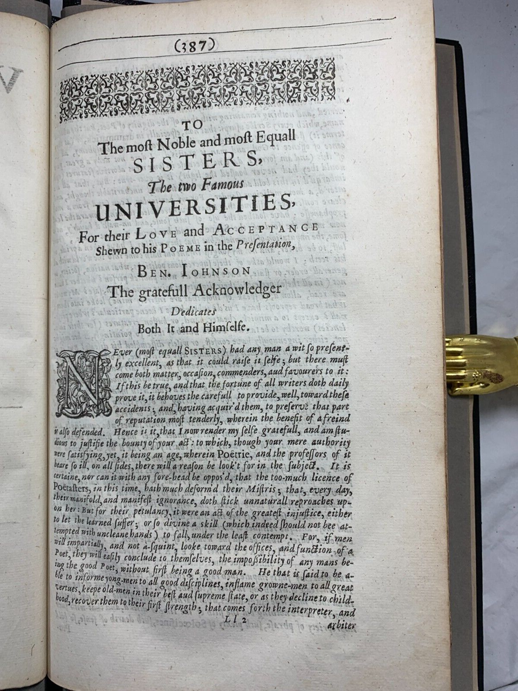 Original 2nd Folio Ben Jonson's Fox And Alchemist Plays 1640, Shakespeare's Contemporary This is part of an original Ben Jonson folio in very good condition pages are crisp and not torn despite being 385 years old. These are two of the most popular plays made by Ben Jonson the Fox and the Alchemist. These were first acted in 1605 and 1610 respectively. This is interesting as Ben Jonson and Shakespeare were not only contemporaries but actively interacted one another. Ben Jonson wrote a eulogy, that then became, the introduction for Shakespeare's first folio in 1623. These plays have been recently rebound with black leather. Dimensions: Weight - 710g Height - 34.5cm Width - 23cm Thickness - 2.5cm Damage (Please see above photos for reference): NOT original binding A very small amount of foxing predominantly found on the title page. Occasional writing in pencil can be found