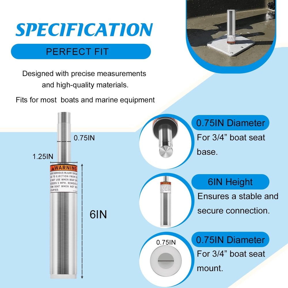 2-pack 3/4" Boat Seat Pin Boat Pedestal Post 6IN for Pontoon, Fishing/Bass Boats (2- PACK) 3/4" Boat Seat Pin Boat Pedestal Post– 6 Inches Tall, 1.5-Inch Diameter, Non-Threaded, Aluminum Pin for Marine Applications for Pontoon, Fishing & Bass Boats SP-2064 (6IN) 3/4" Diameter: The Lock'N-Pin has a 3/4" diameter, which is a standard size that makes it suitable for a wide range of boat seats. This specific size is designed to fit into corresponding holes and receptacles on fishing, pontoon, or cruising boat seats, ensuring a proper and secure fit. Non-Threaded Design: The non-threaded feature of this pin post simplifies the installation and removal process. It allows for quick and easy adjustment of the boat seat position without the need to screw or unscrew a threaded pin. This is especially convenient when you need to reposition the seat frequently during a fishing trip or a cruise. Versatile Use: It can be used for various types of boat seats, including those on fishing boats, pontoon boats, and cruising boats. Whether you're casting a line on a fishing boat, relaxing on a pontoon, or enjoying a cruise, this pin post helps to keep the seat in the desired position, enhancing the overall comfort and functionality of the seating arrangement. Strength and Longevity: Made from high-quality materials, this pin post is built to withstand the harsh marine environment. It is constructed from corrosion-resistant stainless steel and aluminum. Its durable construction ensures a long-lasting performance, reducing the need for frequent replacements. Easy Removal and Adjustment: When it's time to adjust the seat position or remove the seat entirely, the Lock'N-Pin can be quickly and easily removed. This flexibility allows boat owners to customize their seating arrangements according to their needs and the activities they are engaged in, such as fishing, socializing, or simply enjoying the view. Payment Delivery details Terms of sales Returns Contact us Payment 1. All major credit cards are accepted through our secure payment processor Payoneer. 2. Please make sure your Shipping address is correct before you pay, cause it cannot be changed once the order shipped out. Delivery details 1. We only ship to confirmed ebay addresses. Your ebay address MUST MATCH your Shipping address. 2. Please read the shipment and payment detail carefully before you bid. Terms of sales ★If there are any problems with our products, Please feel free to contact us. We will always here to solve them for you. We should try our best to make a happy easy transaction. ★If you are satisfied with our products and our service, please tell your friend and leave us positive feedback. If you are not satisfied with our products or service, please DO tell us. Returns 100% Satisfaction Guarantee: Your satisfaction is our priority. We strive to give our customers excellent service.All our products support 60-Day money-back guarantee, 12-Month warranty for quality-related issues. Simply return it for your warranty. Contact us Any Questions,Just feel free to contact us on eBay.We will reply you in 1-2 business day.