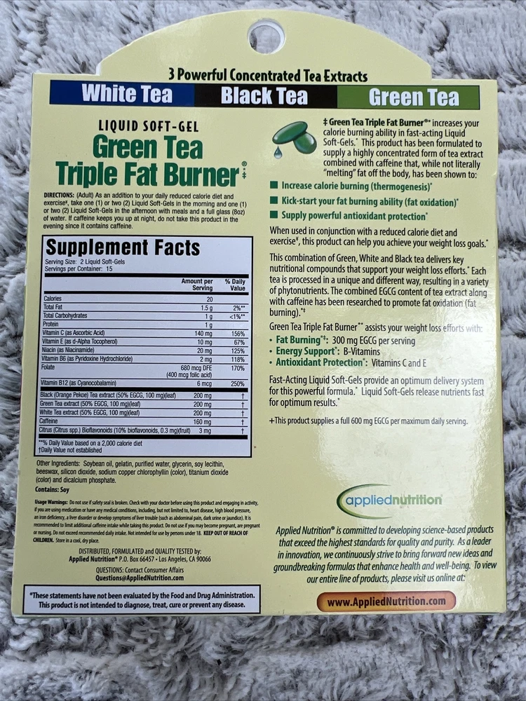 Brand:Applied NutritionMPN:AN056983gtin13:0710363568450Number of Pills:30Item Weight:0.9 lbsType:SupplementUPC:0710363568450Active Ingredients:Vitamin C (Ascorbic Acid), Black Tea, Green Tea, CaffeineMain Purpose:Weight LossFormulation:SoftgelIngredients:Water, White Tea, Vitamin E, Beeswax, Soy Lecithin, Silicon, Green Tea, Caffeine