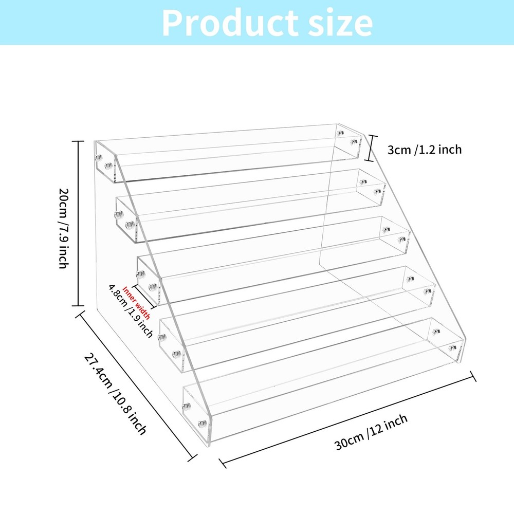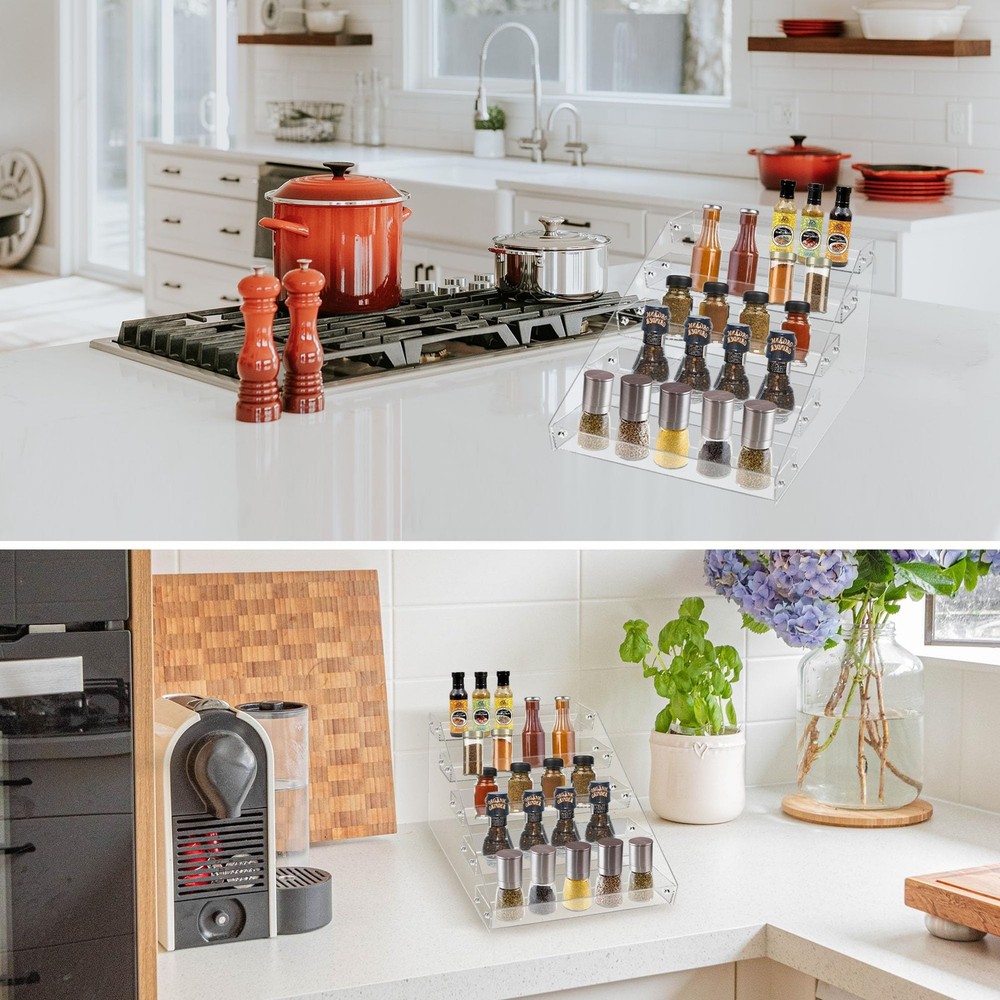tiered spice rack organizer can make better use of your precious kitchen cabinet or countertop space. Spice up your kitchen organization skills for easy meal prep and avoid the hassle of searching through cluttered cabinets for desired ingredients. WHAT YOU GET:2 pack Five-layer Spice Rack.Each tier of the vertical seasoning organizer is combined with a raised front shelf lip to ensure that your jars and bottles are safe and stable, and will not slip and break, play a protective role, and give you and your belongings a sense of security.The size can be seen in Figure 2. DURABLE MATERIAL: The spice rack is made of acrylic board, which has good hardness and high transparency. Compared with plastic plates, stainless steel and wood materials, these acrylic plates are more durable, lighter and thinner, and can better display what you put on the shelf while still having good protective properties. SIMPLE TO ASSEMBLE - Just open the package and take out the parts, remove the protective layer and screw on the screws and nuts. There are many parts and it may take some patience when installing. MULTIPLE FUNCTIONS: The acrylic tiered spice racks could be used to storage and organize spice jars, sauces, bottles, medicine bottles, etc. The items are within reach, and you can even use it outside the kitchen. Organize your dressing table, bathroom, cabinets, etc. to maximize storage space. CONVENIENT TO CLEAN: The stepped spice rack is made of durable acrylic, which is very suitable for cleaning with mild soap and water. Be careful not to put it in the dishwasher .