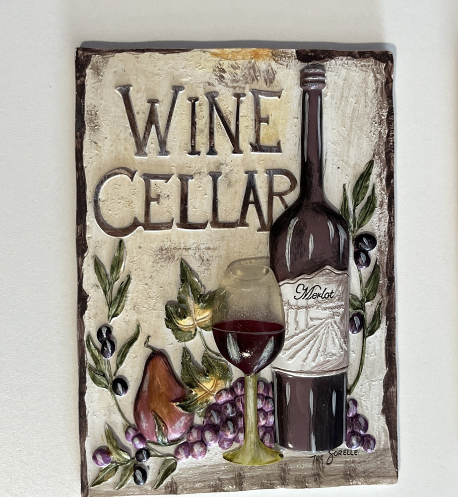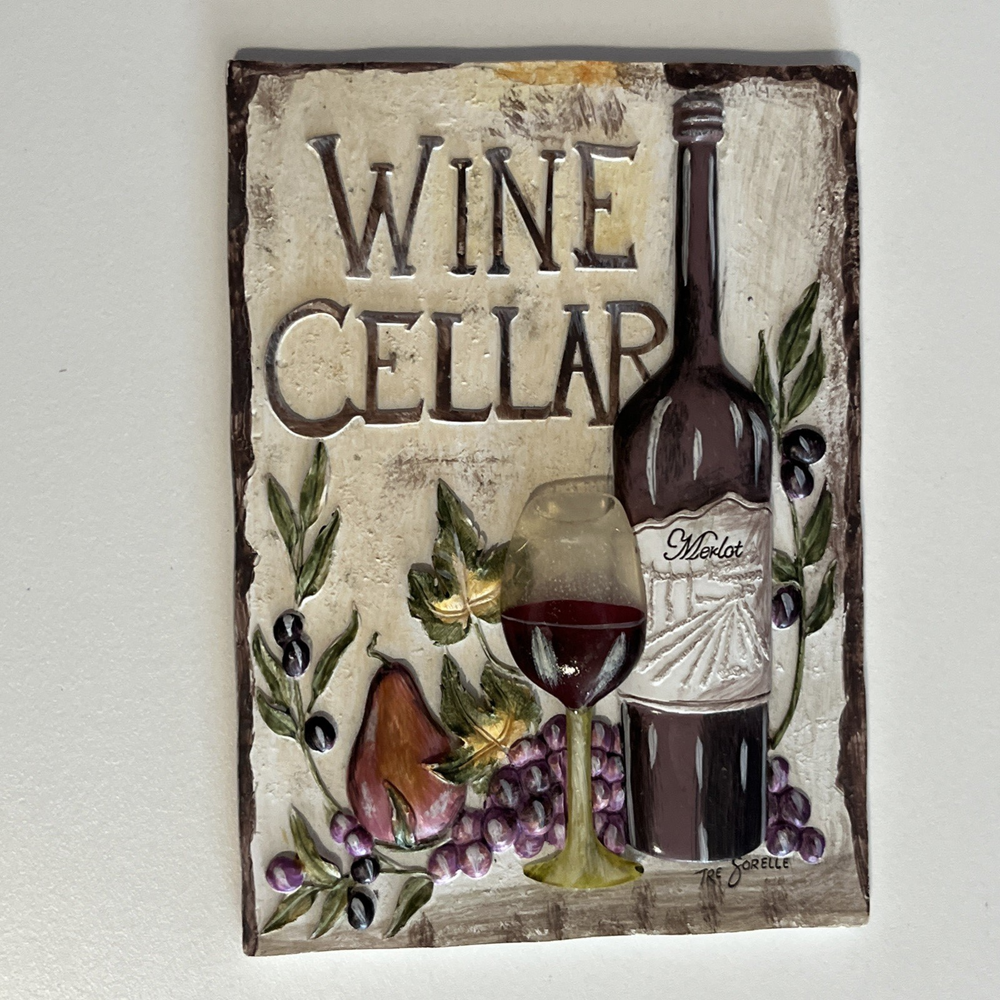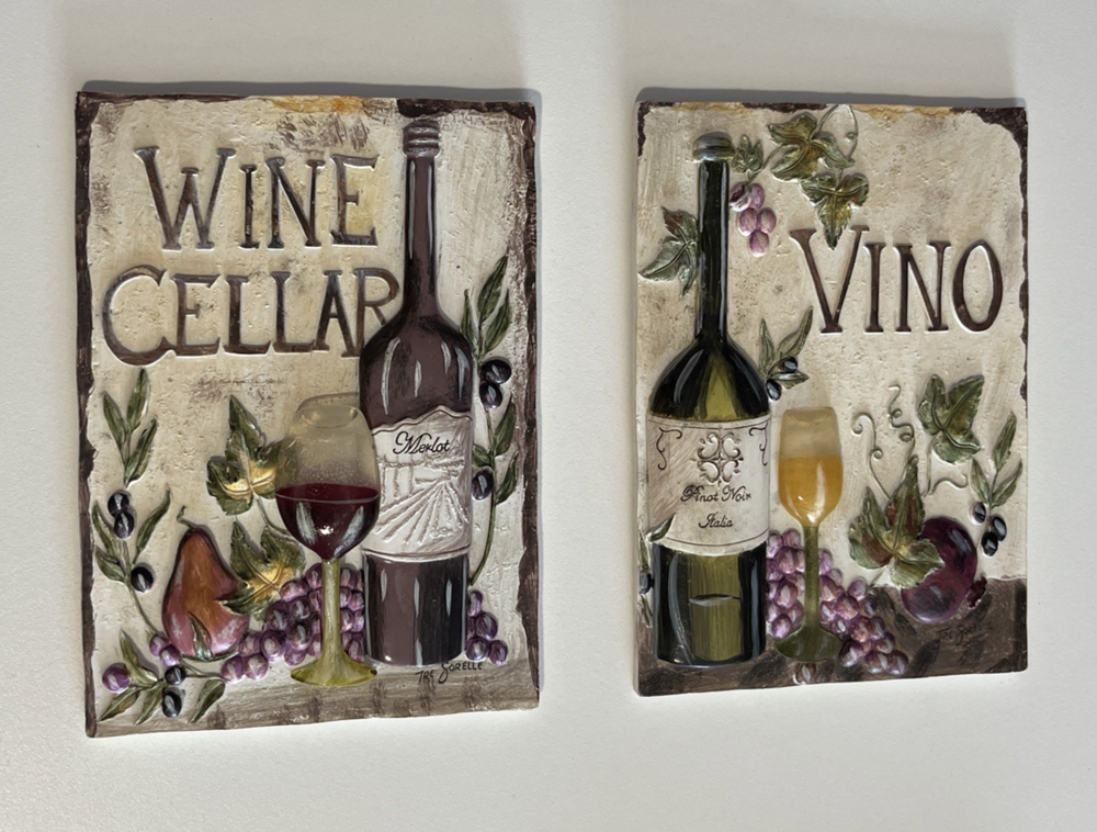 2pc 3D The Rustic Wine™ Vino & Wine Cellar Wall Plaques - Approximately 6.25" Tall x 3.5" Wide This pair is pre-owned and shows some wear, such as rust on one metal hanging piece on back, but there is much life left to live. They will add ambience to a kitchen, wine room, den and more. Please review all pictures carefully as they are part of the descrption. Questions are welcome.