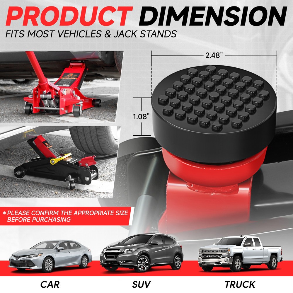 Welcome to Speed Daddy Store Home About Us Feedback Add To Favorites New Arrivals Ending Soon Contact Us 2pcs 2.48" Floor Jack Stand Rubber Pad Adapter Car Frame Rail Protector Guard 2x Product Description Jack pad can protect the chassis, paint, frame railsof your beloved car; Helps alleviate stress while avoiding the damage it may cause Specifics and Features : Made of high-strength Rubber material Dimension:1.08"H x 2.48"D(Please confirm the appropriate size before purchasing) Suitable for various vehicles, widely used in car repair tasks in garages or professional DIY mechanics Maximum load-bearing capacity reaches 4Ton Anti-Slip surface texture design Includes : 2 X Jack Pad Notes : 100% Brand New Professional Installation is Highly Recommended Installation Instruction is NOT Included Shipping Payment Returns Terms & Conditions Feedback Contact Us DOMESTIC LOWER 48 US STATES: FREE SALES TAX: CA ONLY VERY IMPORTANT: Double check shipping address. We are not responsible for incorrect or undeliverable addresses. Please use Shipping & Payments tab on top of page for shipping details for your location. Shipping to PR, HI, AK and PO Box addresses will be charged the same as shipping to Canada. GU, VI, SAIPAN will be charged the same as international shipping rate. For Canada shipping please select the lowest price. We do not offer expedited shipping. US Territories such as GU, VI, SAIPAN will be charged the same as CANADA shipping rate. Transaction will be held until a full shipping amount received. Some of the packages cannot be delivered to a PO Box. Customer is responsible to ensure PO Box address given is deliverable by the shipping company. Package will be held until a valid physical address is provided. Customer assumes shipping charges incurred in shipping to undeliverable address. International buyers are responsible for all customs duties, taxes, and other applicable fees incurred by the country's customs/border regulations. Please contact customs for more information. We ship 98% of all orders the same or next business day after payment received/cleared. Please understand that once orders are shipped, we cannot control the transit times thereafter. Most orders will ship via USPS First Class/Priority Mail or FedEx/UPS or the best suitable carrier for the specific size of the product. We are not responsible for any changes to address after item has been shipped. Item will be shipped out within 24 hours after payment cleared, except for weekends and holidays. PayPal e-check takes 3-7 business days to be processed. We will not ship until an e-check has been cleared. 30 Days Free Returns, please notify us within 30 days after you've received your order. Please email us or call us to obtain a RMA (Return Merchandise Authorization) number from us, and have the RMA number written on the return package. Items to be returned must be in resalable condition. All returns are for refund ONLY. No exchange accepted. For emissions related items, please check with your local jurisdiction for emission specific requirements before purchasing. All items do not come with installation instruction unless otherwise specified. If item is questionable, please consult your local professional/mechanic before making purchase. Shipping DOMESTIC LOWER 48 US STATES: FREE SALES TAX: CA ONLY VERY IMPORTANT: Double check shipping address. We are not responsible for incorrect or undeliverable addresses. Please use Shipping & Payments tab on top of page for shipping details for your location. Shipping to PR, HI, AK and PO Box addresses will be charged the same as shipping to Canada. GU, VI, SAIPAN will be charged the same as international shipping rate. For Canada shipping please select the lowest price. We do not offer expedited shipping. US Territories such as GU, VI, SAIPAN will be charged the same as CANADA shipping rate. Transaction will be held until a full shipping amount received. Some of the packages cannot be delivered to a PO Box. Customer is responsible to ensure PO Box address given is deliverable by the shipping company. Package will be held until a valid physical address is provided. Customer assumes shipping charges incurred in shipping to undeliverable address. International buyers are responsible for all customs duties, taxes, and other applicable fees incurred by the country's customs/border regulations. Please contact customs for more information. We ship 98% of all orders the same or next business day after payment received/cleared. Please understand that once orders are shipped, we cannot control the transit times thereafter. Most orders will ship via USPS First Class/Priority Mail or FedEx/UPS or the best suitable carrier for the specific size of the product. We are not responsible for any changes to address after item has been shipped. Payment Item will be shipped out within 24 hours after payment cleared, except for weekends and holidays. PayPal e-check takes 3-7 business days to be processed. We will not ship until an e-check has been cleared. Returns 30 Days money back, please notify us within 30 days after you've received your purchased item. All return requests must be submitted through your eBay account. You have to obtain a RMA (Return Merchandise Authorization) number from us, and have the RMA number written on the return package. Buyers pay for return shipping fee. Items to be returned must be in resalable condition. All returns are for refund ONLY. No exchange accepted. Returns for refund are subject to a 20% restocking fee. Terms & Conditions For emissions related items, please check with your local jurisdiction for emission specific requirements before purchasing. All items do not come with installation instruction unless otherwise specified. If item is questionable, please consult your local professional/mechanic before making purchase. Feedback Contact Us Store Home About Us Feedback Add To Favorites New Arrivals Ending Soon Contact Us Need Help? Contact Us on eBay Subscribe to 