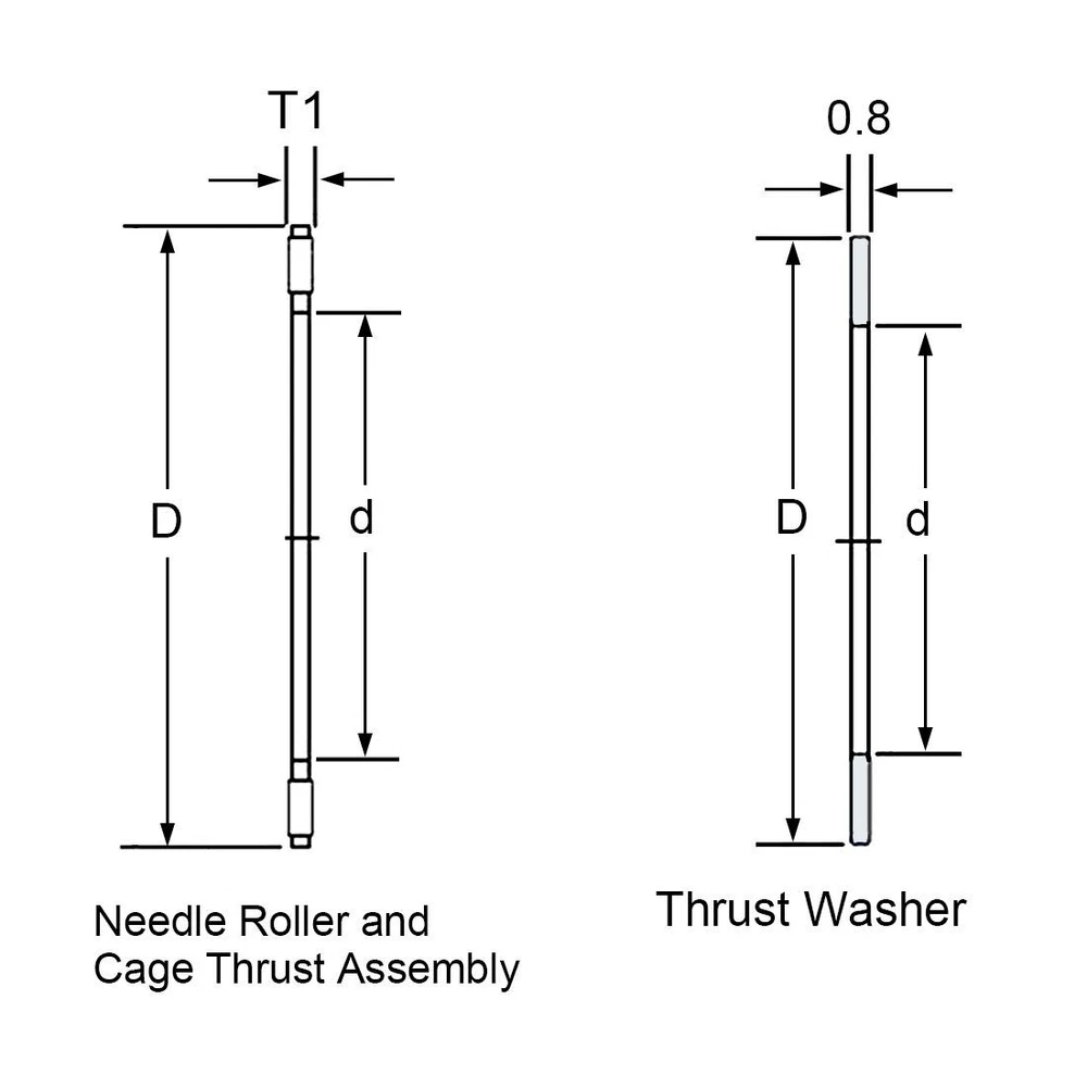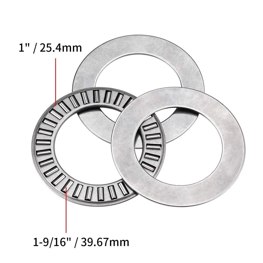2pcs NTA1625 Thrust Needle Roller Bearings with Washers 1" Bore 1-9/16" OD 5/64" Material Alloy Steel Item Weight 1.06 Ounces Bearing Number TC1625 Bearing Type Roller Bearing [MODLE] - Bearing Model: TC1625 (I.D.=1", O.D.=1-9/16", Thickness=5/64"); Washer Model: TRA1625 [MATERIAL] - Chromium steel rollers for heat tolerance and durability under heavy loads; Steel cage guides and evenly spaced rollers for reduced friction, vibration, and noise [FEATURES] - Needle Roller Thrust Bearings can accommodate axial loads in one direction only [WASHER] - Combined with 2 washers for applications where adjacent machine components cannot serve as raceways [CAPABILITY] - 43.9kN Static Load Capacity, 10.76kN Dynamic Load Capacity, 11000RPM Maximum Rotational Speed