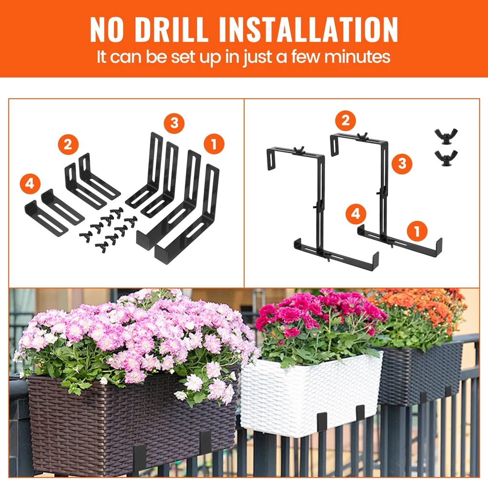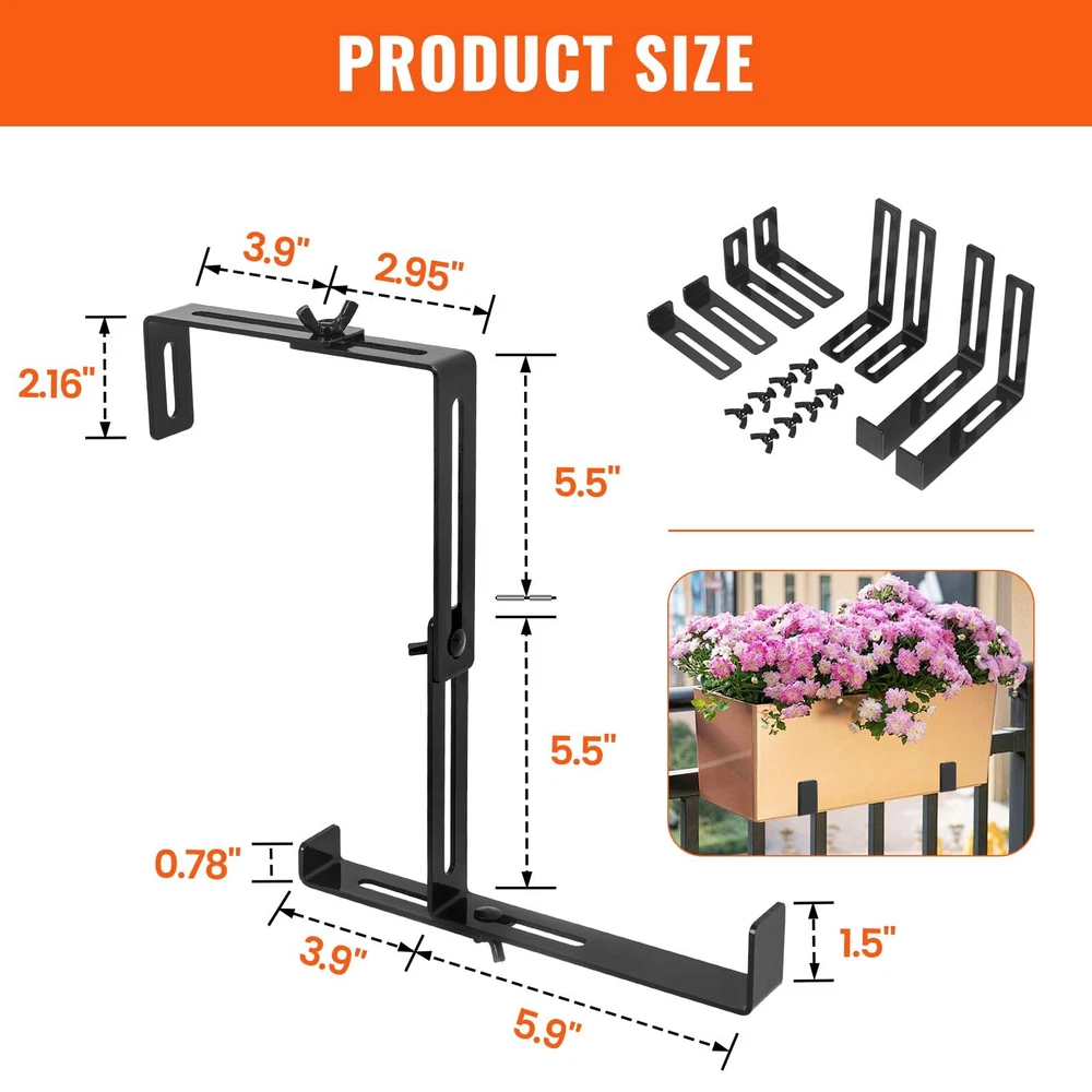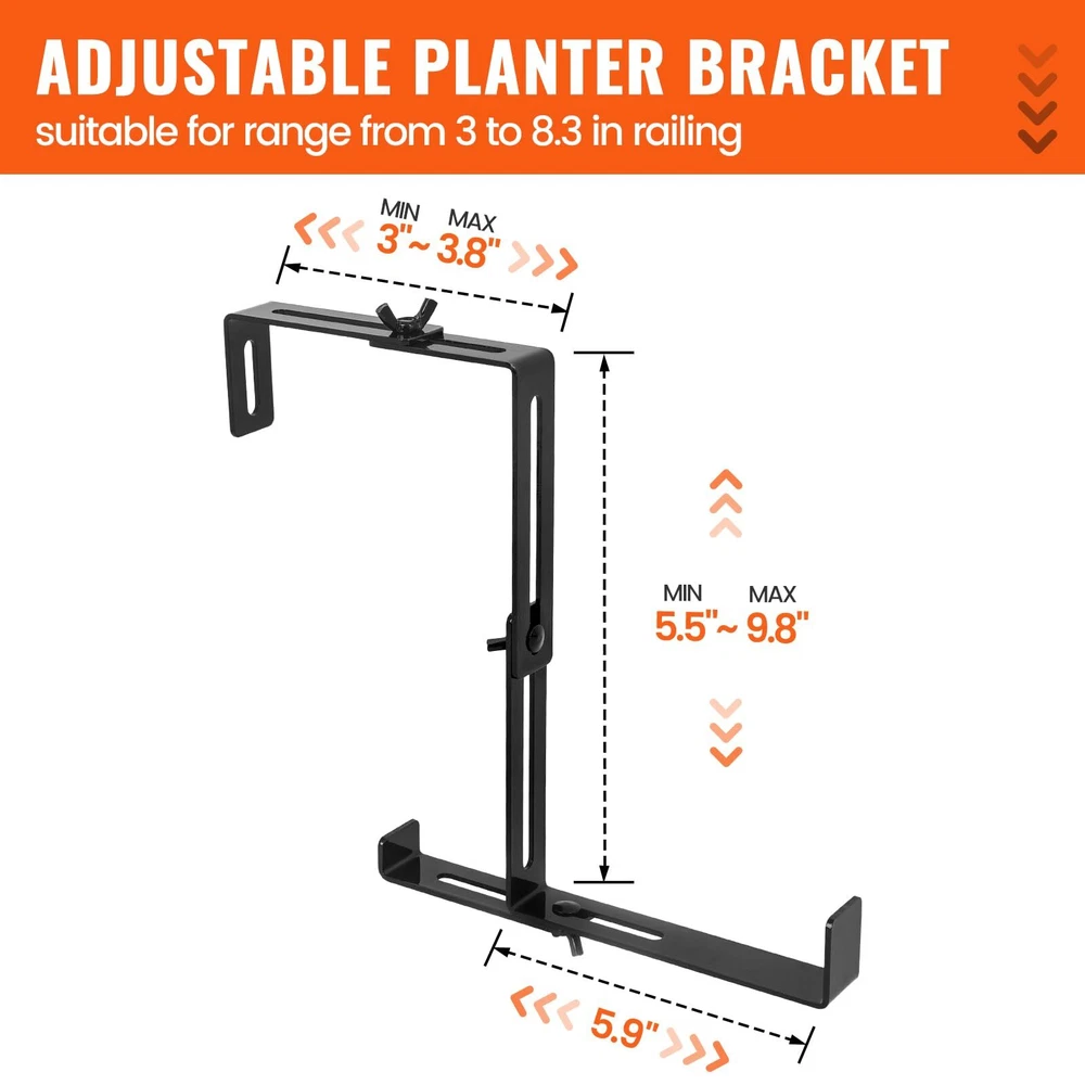 2pcs Planter Box brackets Adjustable Universal Window Box Brackets Details: 【Adjustable Planter Bracket】 The set of 2 window box brackets feature an adjustable top and middle design. The top width can be freely adjusted to accommodate your railing width, ranging from 3 to 8.3 inches, while the middle height can be adjusted from 5.5 to 9.8 inches, allowing you to customize the size to meet your specific needs. Enjoy the freedom to personalize your space with ease! 【Sturdy & Durable】 Made of high-quality steel with a 3mm/0.12in thickness and coated with a protective powder finish to prevent fading and corrosion. Featuring non-rusting, enduring carbon steel screws, guaranteed to provide great support for your planters. The maximum load capacity is up to 90 lbs. 【Excellent Design】 Are you still worried about the flower pots being too heavy or the railings being too thin and tilting? To prevent this issue, we've added a flexible support bar at the bottom. This component allows you to adjust it to your specific usage requirements, ensuring optimal positioning of your pot. 【No Drill Installation】 Say goodbye to drilling holes or damaging surfaces. These no-drill planter box brackets are easy to install without the need for any tools, saving you time and effort. You can set it up in minutes and enjoy its stability for years to come. 【 Wide Application】 Our flower box brackets are ideal for indoor and outdoor use, and suitable for places where hanging flower pots are required, such as courtyard walls, balconies, terraces, railings, etc. Enjoy the freedom to hang your plant or flower pots wherever you'd like! Specifications: Material: Carbon Steel Quantity: 2 Pcs Color: Black Thickness: 3mm/0.12in Adjustable Top Width Range: 3 to 8.3 inches Adjustable Middle Height Range: 5.5 to 9.8 inches Net Weight: 2.2lb Package Included: 8 x Brackets 8 x screws 8 x nuts 2 Pcs Adjustable Planter Window Box Brackets Sturdy & Durable, Simple Installation. Enhance the beauty of your outdoor space with the LFGUD 2 Pcs Window Box Brackets. These adjustable planter box brackets are designed to securely hold flower boxes, making it easier than ever to create a stunning display of vibrant blooms. The top width can be freely adjusted to accommodate your railing width, ranging from 3 to 8.3 inches, while the middle height can be adjusted from 5.5 to 9.8 inches Made of high-quality steel with a 3mm/0.12in thickness and coated with a protective powder finish to prevent fading and corrosion. The adjustable design allows you to easily customize the sizing to fit your specific needs, ensuring a perfect fit every time. To prevent this issue, we've added a flexible support bar at the bottom. This component allows you to adjust it to your specific usage requirements, ensuring optimal positioning of your pot. These no-drill planter box brackets are easy to install without the need for any tools, saving you time and effort. You can set it up in minutes and enjoy its stability for years to come. 8 x Brackets 8 x screws 8 x nuts Our flower box brackets are ideal for indoor and outdoor use, and suitable for places where hanging flower pots are required, such as courtyard walls, balconies, terraces, railings, etc. Enjoy the freedom to hang your plant or flower pots wherever you'd like! FAST SHIPPING WARRANTY EASY RETURNS CONTACT US FAST SHIPPING We only ship to US mainland 48 states and worldwide via ebay international shipping program. We don't offer direct international shipping. Consult us if you live in Hawaii, Alaska or Virgin Islands. Also we don't ship to any APO/FPO/PO BOX address. We offer FedEx Ground or Home delivery in optional which can make it faster, charge additional shipping fee. Delivery is any day from 1-5 business days (Monday through Friday, excluding weekends and holidays) WARRANTY This item is covered by our 12 months unlimited mileage warranty. Any customer may use the same outlets to facilitate a return or warranty claim. Any item must be returned within 30 days of the original purchase for refund; item(s) retaining a warranty may be returned beyond 30 days but within the remaining warranty period. Returns that are not subject to warranty may accrue a restocking fee and should be returned at the customers cost. We reserves the right to request proof of purchase and mechanical failure in the event of any warranty claim; any returns or claims that violate Ebay's Online Return policies will be reported. We holds no responsibility or liability for additional repairs, damages (punitive or non-punitive), loss of time, or any other extraneous circumstances created by a purchase made from said party. EASY RETURNS We understand that sometimes you need to make a return or an exchange. All we ask is you send it back in the same condition it was received - new and un-used. If the product you receive is not the one you ordered, please take photos of any visible of visual reference and contact us directly; photos must be CLEAR and VISIBLE. Logistical claims must be filed within 30 days of received the product; exchanges in these cases will be handled promptly and at?no cost to the customer. In order to process a return or exchange, please call us or send us a message through eBay and we will be happy to assist you immediately. However,any return that is NOT defective or NOT received in error, is the responsibility of the customer. We DO NOT cover any shipping costs and/or additional fees associated with the transaction. CONTACT US We are open Monday to Friday 8am to 5pm Mountain Standard Time, and Saturday 9am to 1pm MST. Our friendly staff are available during these hours. Please feel free to call us, or send us a message via eBay. We aim for complete customer satisfaction and repeat business; we will be more than happy to help you feel 100% comfortable with your purchase.