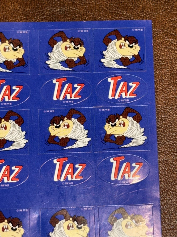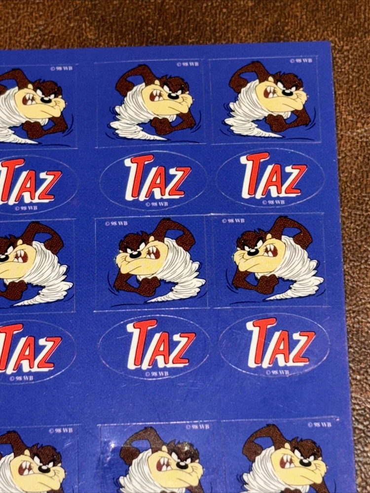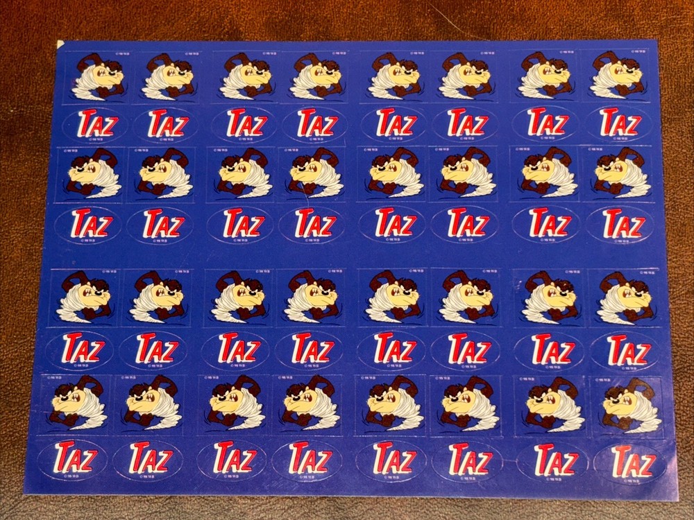 Both sheets of sticker hold no signs of damage or ware. With each sheet having 64 sticker total With 2 sheets having 1 sheet missing 1 (one) sticker. 127 total stickers. Sold as pictured. This vintage Looney Tunes sticker sheet features the beloved character Taz, the Tasmanian Devil. The colorful design and interactive features make it a must-have for any fan of cartoon and TV characters, art, fantasy, animation, and periods and styles. Made in the United States in 1990, this sticker sheet is a rare find for collectors of animation merchandise and other unique pieces. Add it to your collection or use it to decorate your personal space.
