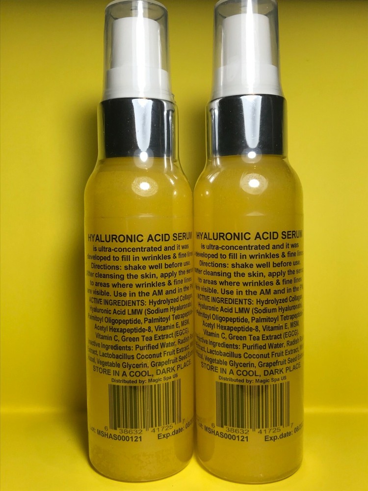 HYALURONIC ACID SERUM (SEALED by the manufacturer) with Collagen and Triple Peptide Complex 2 BOTTLES TOTAL 2 fl. oz. (180 ml) Expiration date: 09/2026 Active Ingredients: Hydrolyzed Collagen, Hyaluronic Acid LMW (Sodium Hyaluronate), Palmitoyl Oligopeptide, Palmitoyl Tetrapeptide-7, Acetyl Hexapeptide-8, Vitamin E, MSM, Vitamin C, Green Tea Extract (EGCG). HYALURONIC ACID SERUM is ultra-concentrated & it was developed to fill in wrinkles & fine lines. Direction: shake well before use. After cleansing the skin, apply the serum to areas where wrinkles & fine lines are visible. Use in the AM and in the PM. Inactive Ingredients: Purified Water, Radish Rood Extract, Lactobacillus Coconut Fruit Extract, Witch Hazel, Vegetable Glycerin, Grapefruit Seed Extract. STORE IN A COOL, DARK PLACE. Hyaluronic Acid is Low Molecular Weight (LMW) Low-weight hyaluronic molecules penetrate DEEPER into the skin’s structure, providing maximum BELOW-THE-SURFACE HYDRATION and in turn rehydrating skin cells over time. Low molecular weight (LMW) hyaluronic acid has been bioengineered into smallest pieces. These tiny molecules penetrate deeper in the epidermal layers, giving hyaluronic acid LMW a kind of plumping effect that gives the skin a full and youthful appearance. HA can hold up 1,000 times its weight in water and is responsible for giving skin its plumpness and volume. The Serum: v Fills in wrinkles & fine lines v Boosts your skin’s moisture v Keeps your skin hydrated v Provides Structure & Texture v Reverse Environmental Damage v Acts as an Anti-Oxidant v Made in the USA The Serum formulated WITHOUT : v Parabens v Sulfates v Synthetic Fragrances v Synthetic Dyes v Petro-Chemicals v Phthalates v GMOs