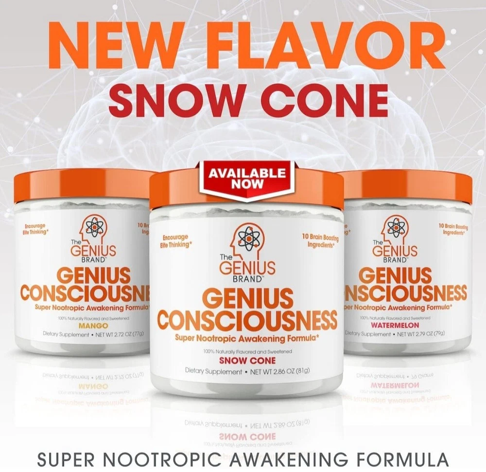 2x Genius Consciousness, Super Nootropic Brain Supplement Powder, Mango - Boost Focus, Cognitive Function, Concentration & Memory Booster - Alpha GPC & Lions Mane Mushroom for Neuro Energy & IQ About this item Awaken Your Mind: Genius Consciousness by The Genius Brand brings together strong, natural brain-enhancing ingredients in one great-tasting daily drink for high-performance thinking.* Formulated to help support improved memory, concentration, learning, recall, mood, and focus.* Mango flavor. 15 scoops per container. Ignite Cognitive Function & Boost Creativity*: Dynamine, NeuroFactor, AlphaSize, and natural caffeine combine to get neurons to work faster and more efficiently, leading to greater working memory, focus, and learning.* SerinAid maintains and improves mental performance, can help improve mood, and can help keep you calm.* This supplement also helps eliminate brain fog and brush away the “haze” blunting your thinking and creativity.* Protects & Preserves Neurons: Lion’s Mane and NeuroFactor stimulate brain-derived neurotrophic factor (BDNF) and nerve growth factor (NGF) to support the creation of new brain cells.* Genius Consciousness protects and preserves cognitive function with a hand-picked selection of nootropics that decrease neuronal excitability and excitotoxicity and combat inflammation.* How to Use: To assess your tolerance when beginning use of this product, take a 1/2 scoop with 6-10 oz of water, depending on taste preference, and consume 15-30 minutes before mental concentration is required. If you’re comfortable with that and want greater energy and more intense focus, consume 1 full scoop with 8-12 oz of water. If you experience any displeasing side effects, discontinue use. Supplement Smarter: Genius Brand supplements are a rejection of backwards industry dogma that misled generations of health and wellness enthusiasts. For us, scientific innovation and natural ingredients come first. Whether you’re a pro athlete, stay-at-home parent, retiree, or anything in between, our products can be of benefit to you. We’re all humans, and we are in this together.