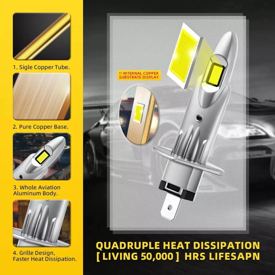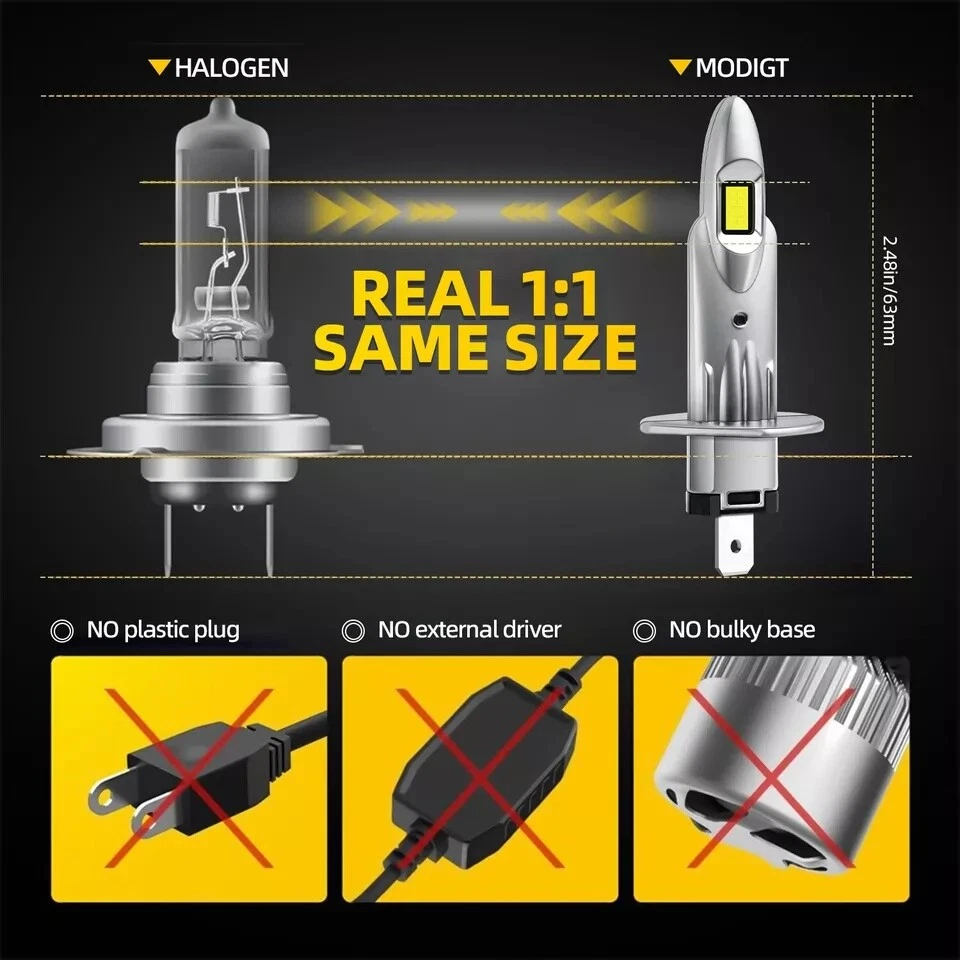 Lighting Technology: LED External/ Internal Driver: Internal Color Temperature: 6000K White OE/OEM Part Number: H1 Brand: MODIGT Placement on Vehicle: Front, Left, Right Voltage: DC 9V-32V(Fit 12V/24V vehicle) Number of Bulbs: 2 It also fits many other cars: As long as your bulb type is the same with this Superseded Part Number: High Beam/Low Beam/Fog Light/Headlight LED Conversion Kit Material: Aluminum alloy Beam Pattern: 360 degrees Manufacturer Part Number: LED Auto Lightings Lamp Conversion Kit UPC: Does not apply Interchange Part Numbe: H1 Suitable For: High Beam/Low Beam/Fog Light/Headlight Bulb Size: H1 Manufacturer Warranty: 2 Years LED Quantity(each bulb): 16pcs CSP LED chips; 2 Sides; Super Bright Headlight Bulb Type: H1 Waterproof: IP67 Light Color: Cold White Bulb Fitment Code: H1 Type: Led headlight Package includes: 1x Pair (2pcs) H1 led bulbs Lumens: 10000 lm/per bulb, 20000 lm/per pair Fitment Type: Direct Replacement Features 2: Mini Size, Plug and Play, Super Bright Operating Temperature: -40-80 degree Celsius Bulb Life Hours: Up to 100000 Hours Features 1: Easy Installation, Waterproof, Fast Thermal Diffusion Light source: CSP (3055) Sealed Housing: Dustproof and Waterproof More Wattage LED Kit We Have: 21W 40W 100W Plug Type: H1 High Beam/Low Beam/Fog Light/Headlight Wattage: 20W/per bulb, 40W/per pair Lighting Type: Specialty Head Light Bulb Connector Type: Plug and Play gtin13: Does not apply