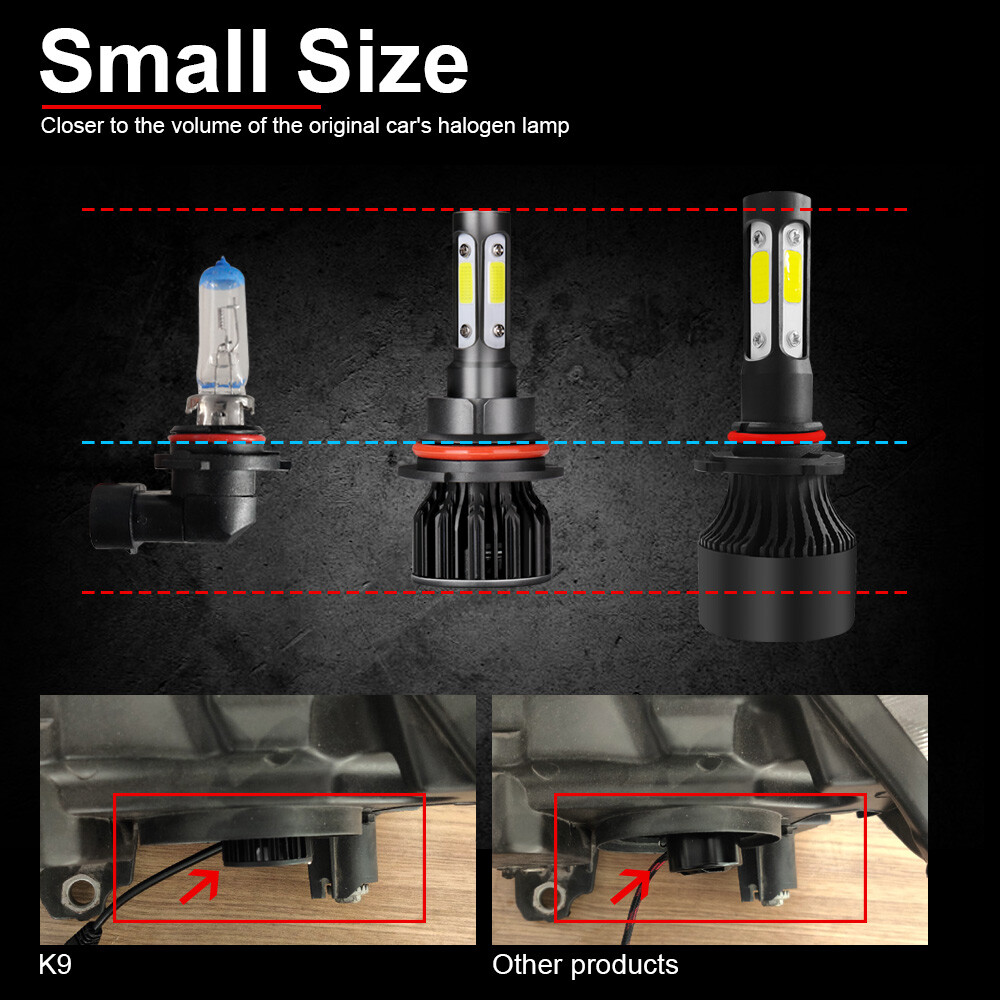 Specification: Manufacturer Part Number:K9 LED headlight Wattage: 36W/Pair , 18W/Bulb Hight luminous efficacy Flux:6000LM/Pair 3000LM/Bulb Waterproof: IP68. Voltage:9V to 36V.Wide-range voltage,constant urrent control,anti-interference circuit design. Apprication:Upgrade for Car,Truck,SUV,RV HID Xenon Headlight,ALL IN ONE Style, no extra driver needed . Long range:6000K color temperature and 200m light range. Description: 1. High brightness: The latest COB with 6000K White LED chip; 200% brighter than the existing halogen headlights. 2. Strong heat dissipation: equipped with highly silent heat dissipation fan, speed up to 12000/min, heat dissipation efficiency, can avoid temperature accumulation on the beads, prolong the service life of the beads. 3. Simple Installation: Installation only takes 10 minutes. There is no relay. There is no capacitor. No additional wiring. Plug and play. 4. IP68 waterproof: using integrated radiator and aluminium body self-cooling, waterproof and heat-proof. Even in extreme cases, the enclosure of the rainproof driver can work properly. Automatic short circuit protection. 5. Luminous on all sides: 360 ° no dead angle Package Included: 2pcs 9007 LED Headlight Bulbs