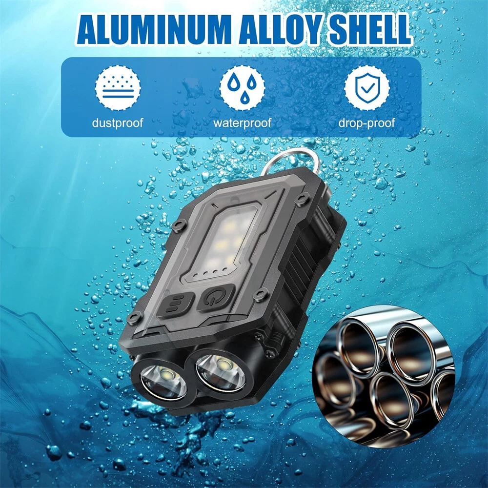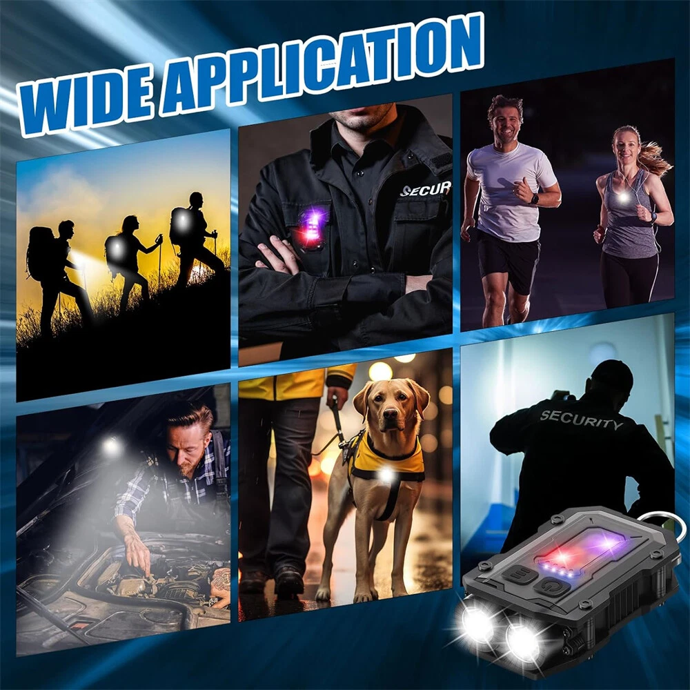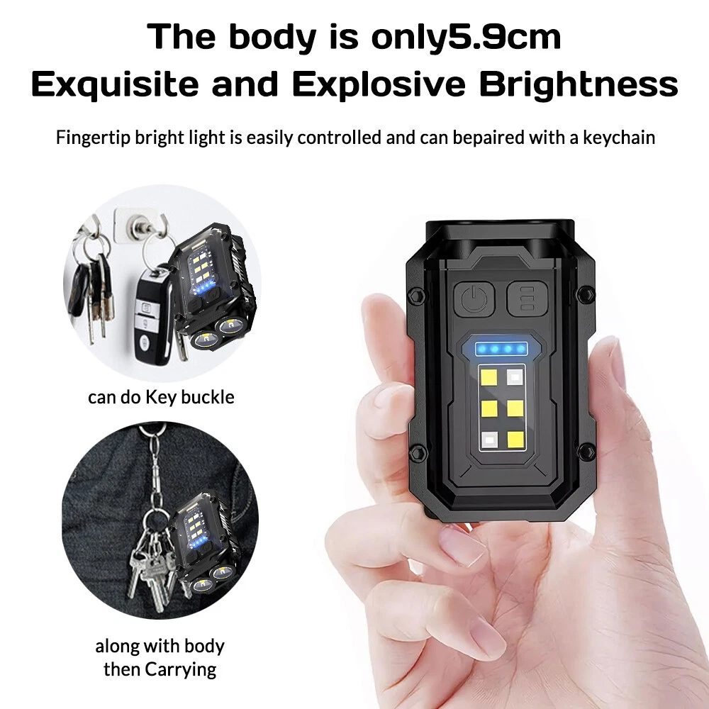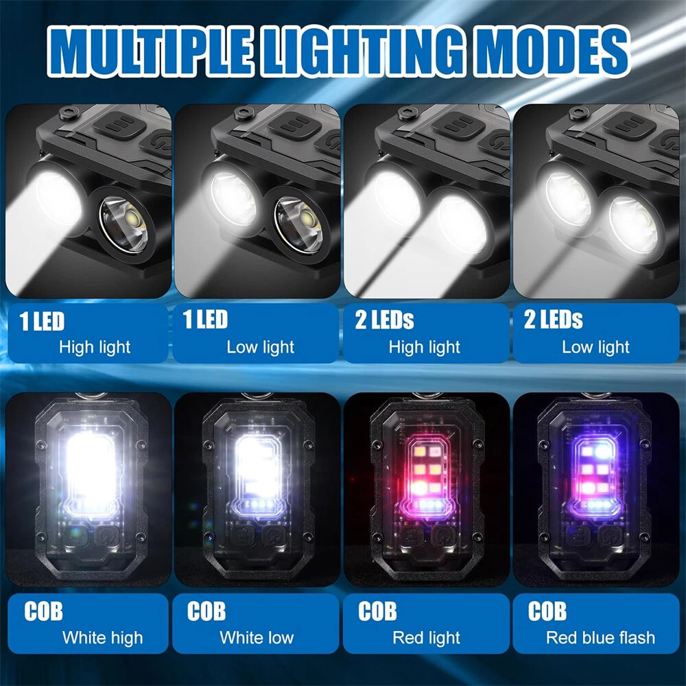 【 Super Bright Keychain Flashlight 】This clip flashlight has dual LED main lights that can produce up to 800 lumens. Lighting distance exceeds 98 feet/30 meters. IP65 waterproof, you can use it even when it rains (Please note: it cannot be immersed in water). Press and hold the switch for 2 seconds to turn it on, then press the button to switch the lighting mode. Press and hold for 2 seconds to turn it off. 【 8 Modes Light Sources 】This keychain flashlight has 8 light modes. 4 Types of main lights: single source/strong light, single source/low light, dual source/strong light, dual source/low light. 4 Types of COB side lights: white /strong light, white/low light, red light, red and blue flashing light. Besides, the main light and COB light can work at the same time. Multiple light modes to meet your various needs. 【 Ligh tweight & Compact Flashlight 】This clip on EDC flashlight has a mini body. It can be hung on your keychain, very convenient for daily carry. The shell of the light is fixed with an aluminum alloy, which is very sturdy and shock-resistant. It is the perfect flashlight for daily use or emergency use. 【 E x t remely Long Workin g Hours 】This mini flashlight is powered by a rechargeable 800mAh lithium battery, which can provide ultra-long working time. Besides, this keychain light uses USB C fast charging (charging cable included) and can be fully charged in as soon as 1.5 hours. Moreover, the pocket light has battery indicator lights, which allow you to quickly know the remaining power. No longer worry about battery when you are outdoors. 【 Magnetic & Clip on Flashlight 】This flashlight has a powerful clip on the back, which can be clipped on hats, clothes, and bag straps. Great for night running, hiking, exploring, fishing, camping, and more. It can also be used as a warning light for dog walking at night. There is a strong magnet at the tail, which can be used as vehicle repair lighting or as a warning light in emergencies. This flashlight also has a keychain hole, so you can hang it on your keys and take it with you every day. 【 What's in the box 】 2 x Keychain Flashlight, 2 x Charging Cable.